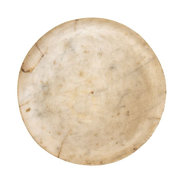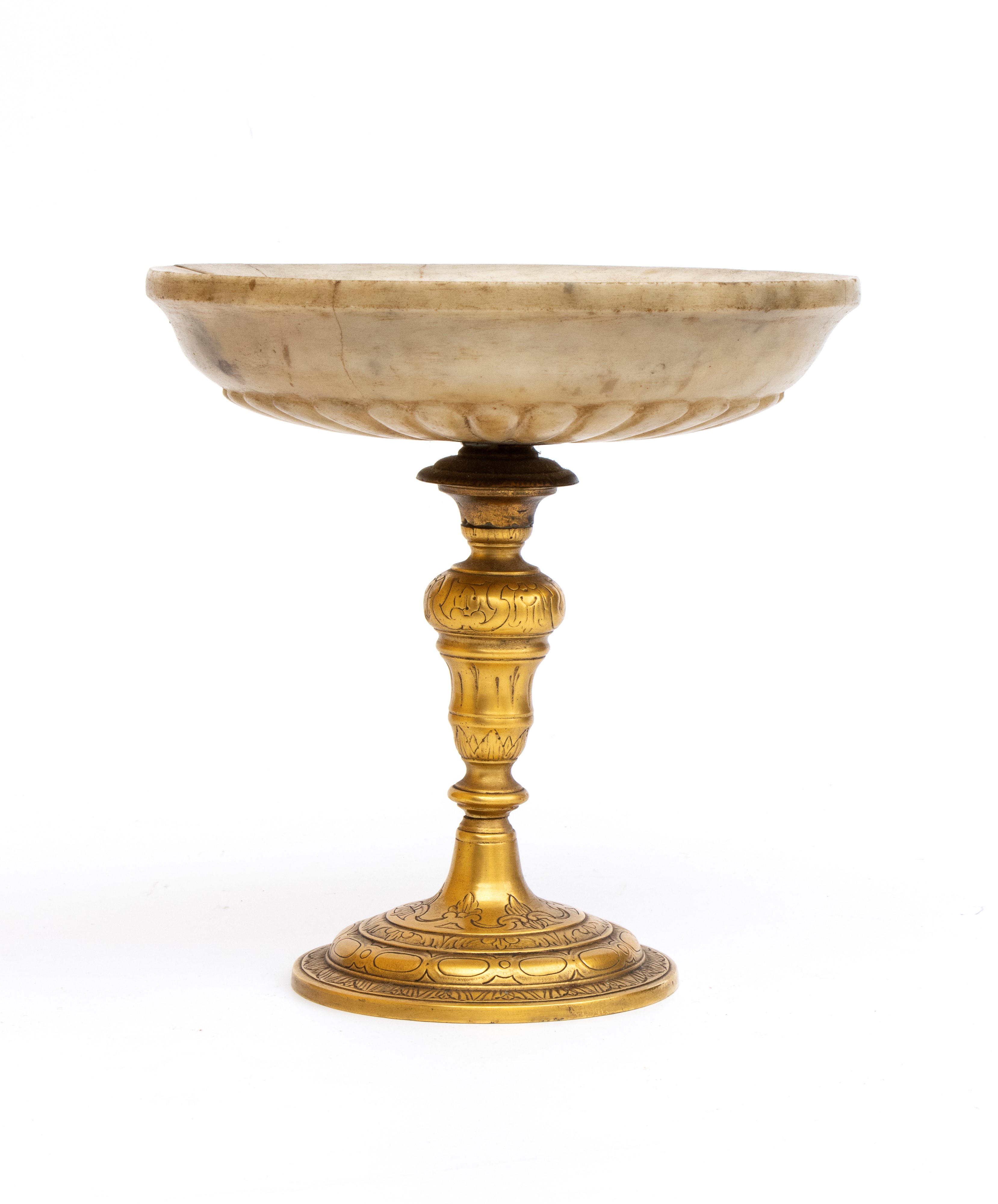 composta da una coppa circolare in marmo bianco poggiante su un fusto tornito in bronzo dorato. Quest'ultimo è presenta una decorazione a motivi vegetali e poggia su una base di forma circolare riccamente decorata con motivi geometrici e a volute.