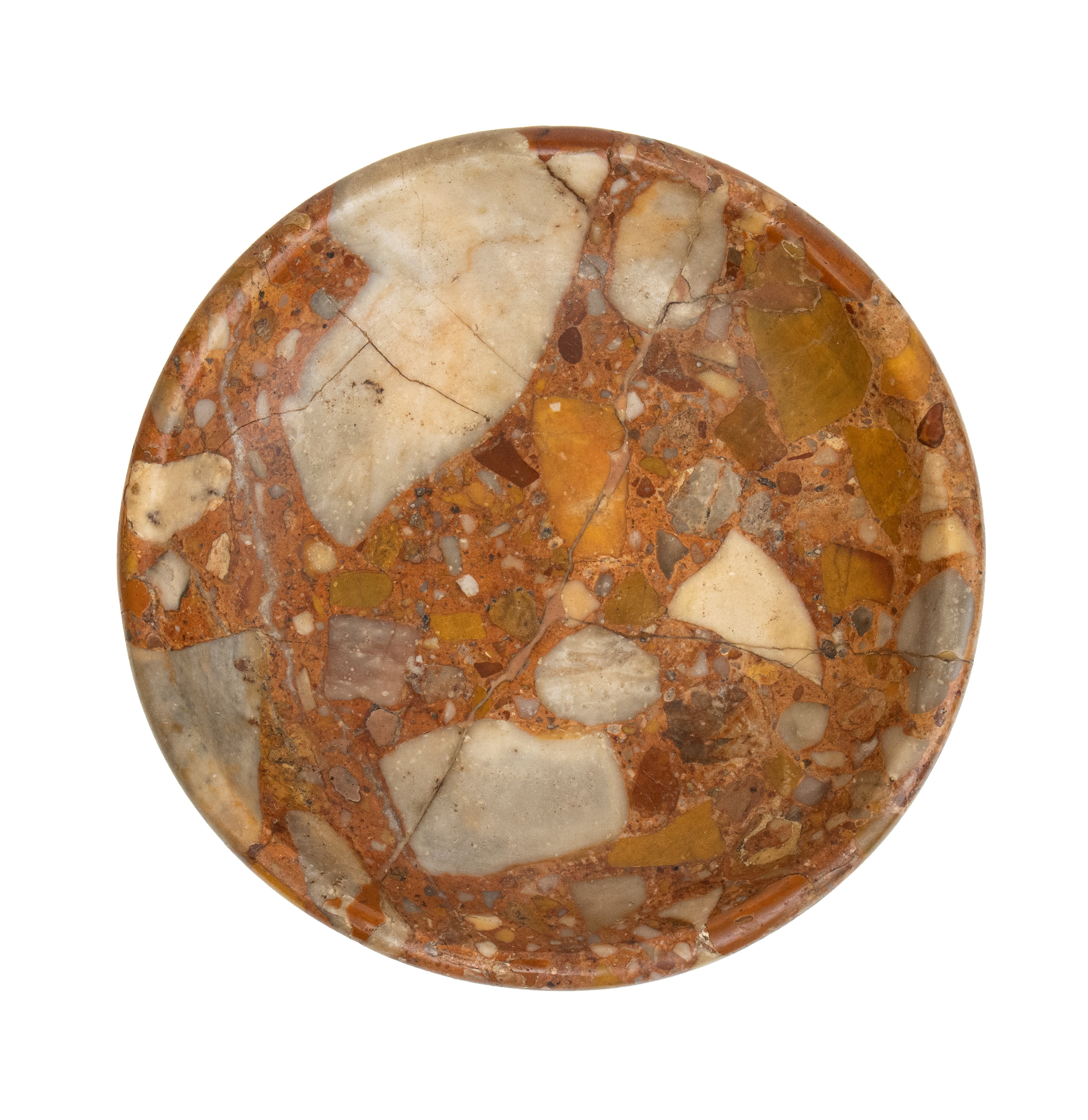 composto da un piedistallo in bronzo finemente lavorato con motivi floreali e geometrici, il quale sostiene un ampio piatto in marmo breccia colorato. Il piatto è caratterizzato da una ricca venatura e da una policromia naturale.