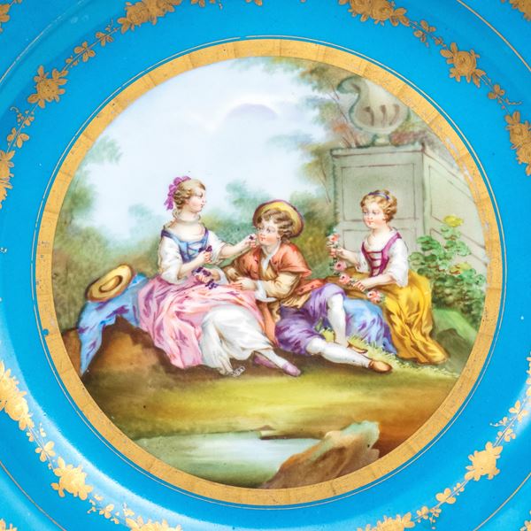 datata 1867, smaltata blu "bleu cèleste", finemente decorata a riserve dorate e scena galante dipinta a mano nel centro, ispirata al gusto settecentesco. Montattura in bronzo dorato cesellato, con manici a volute fogliacee e base sagomata e cesellata.