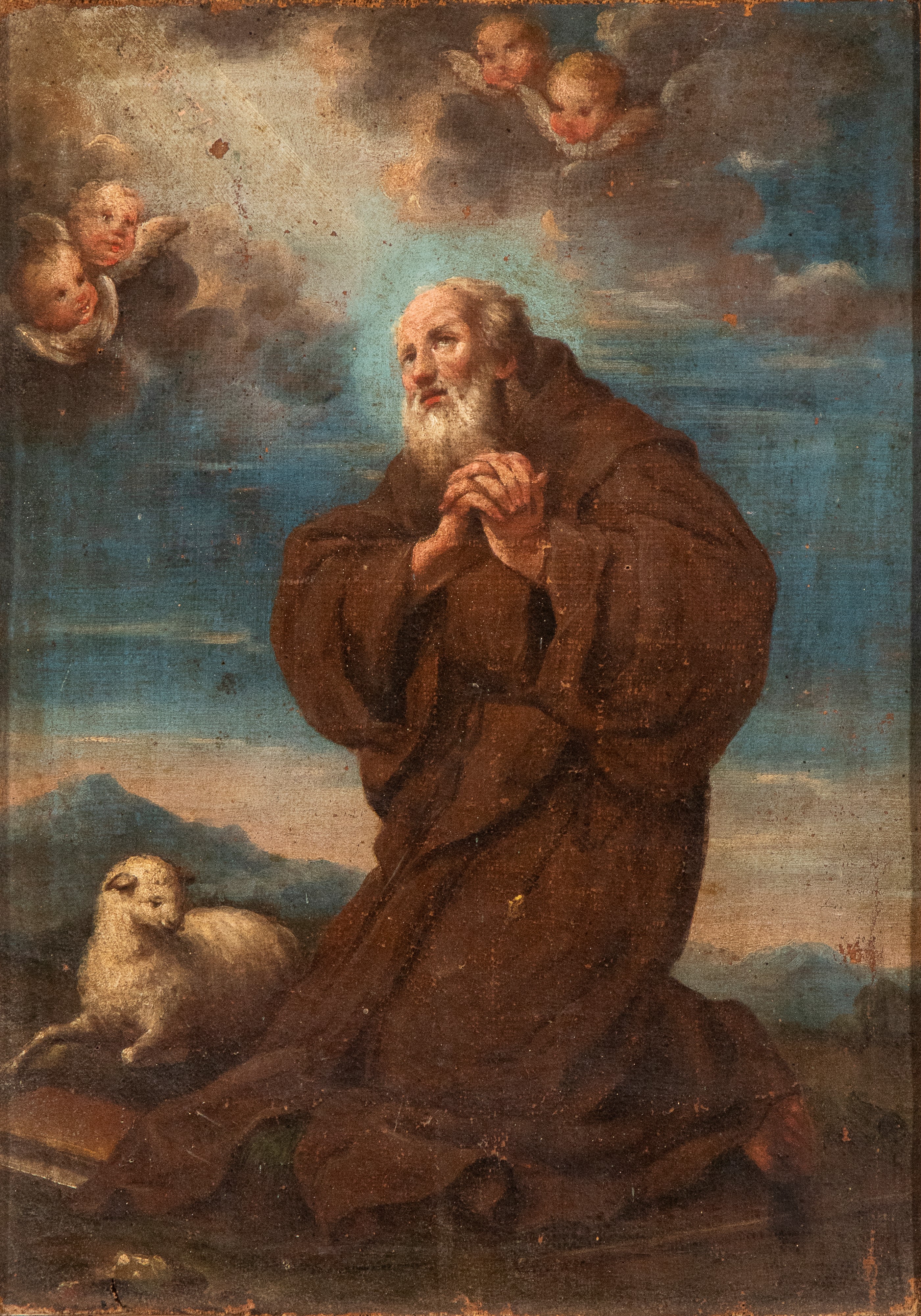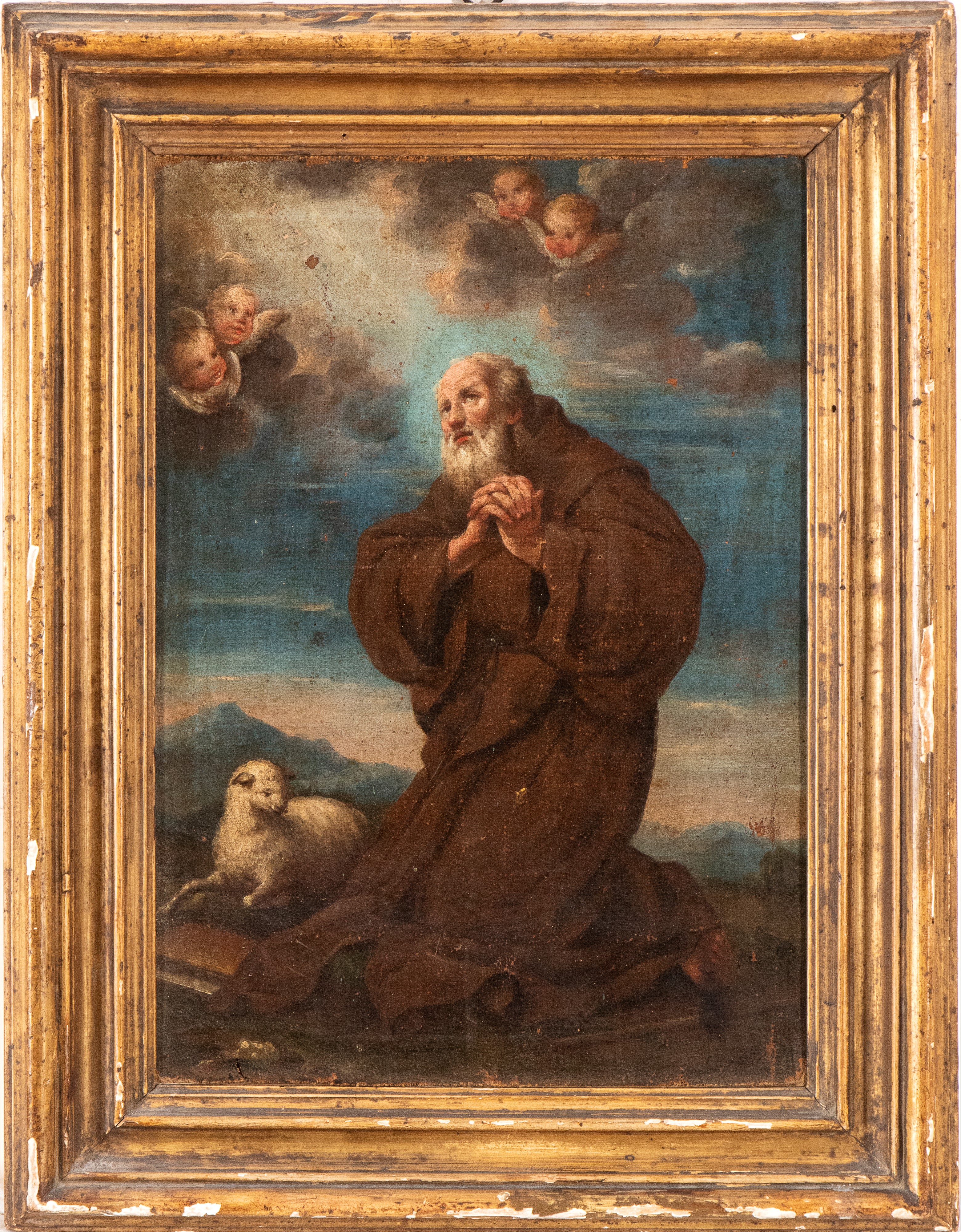 raffigurante San Francesco di Paola in abito dell’Ordine dei Minimi, in atto di preghiera e contemplazione. Il santo, con lo sguardo rivolto al cielo e le mani giunte, è circondato da cherubini tra le nubi che alludono alla visione celeste. Ai suoi piedi compaiono un agnello e un libro.
