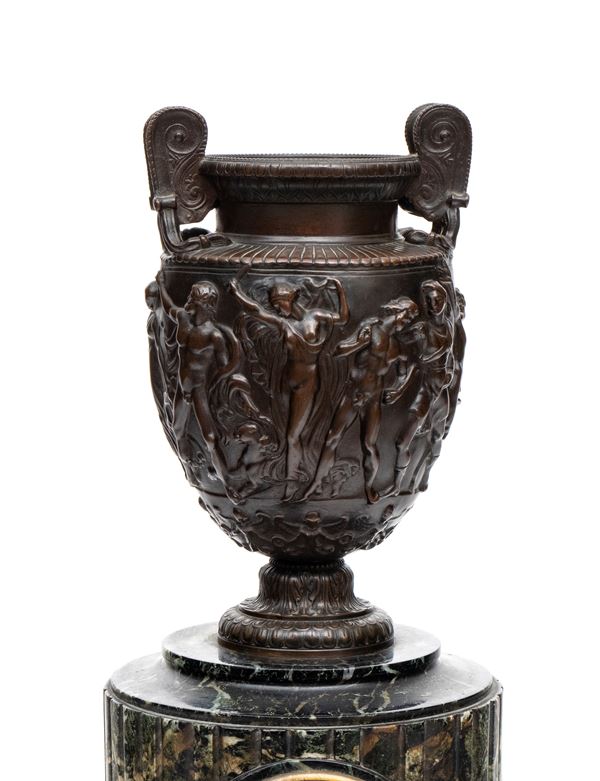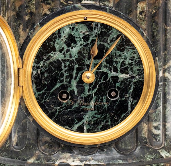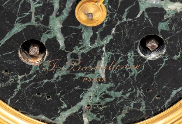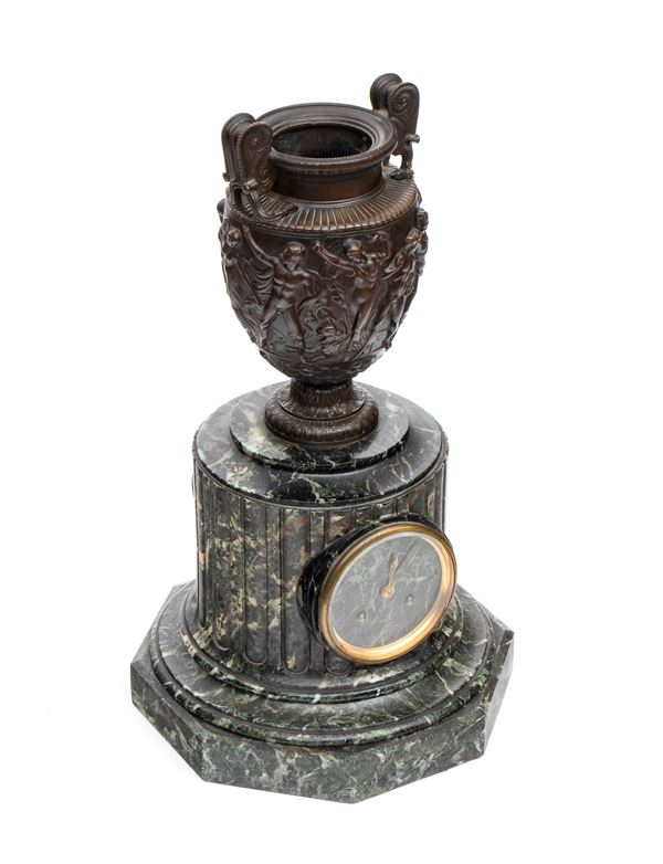 orologio da camino in stile neoclassico con corpo in marmo verde, arricchito da cassa in bronzo patinato a forma di cratere ornato da figure danzanti in altorilievo, ispirate al celebre vaso Borghese. Quadrante circolare in marmo con numeri romani, ghiera in bronzo dorato e firmato al centro del quadrante "F. Barbedienne".