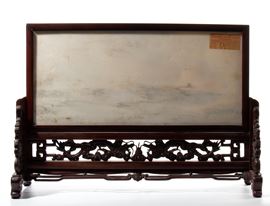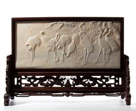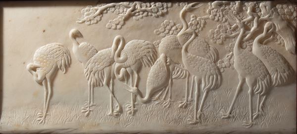 placca in marmo scolpita a bassorilievo, raffigurante un gruppo di gru in paesaggio naturale. La scena è incorniciata in una montatura in ebano intagliata con motivi ornamentali.