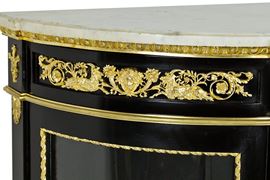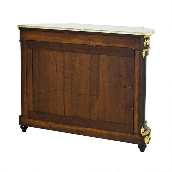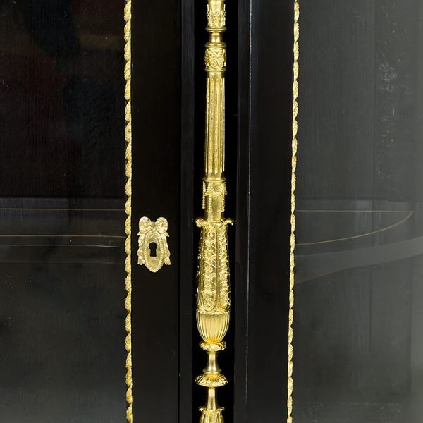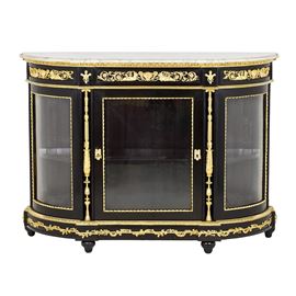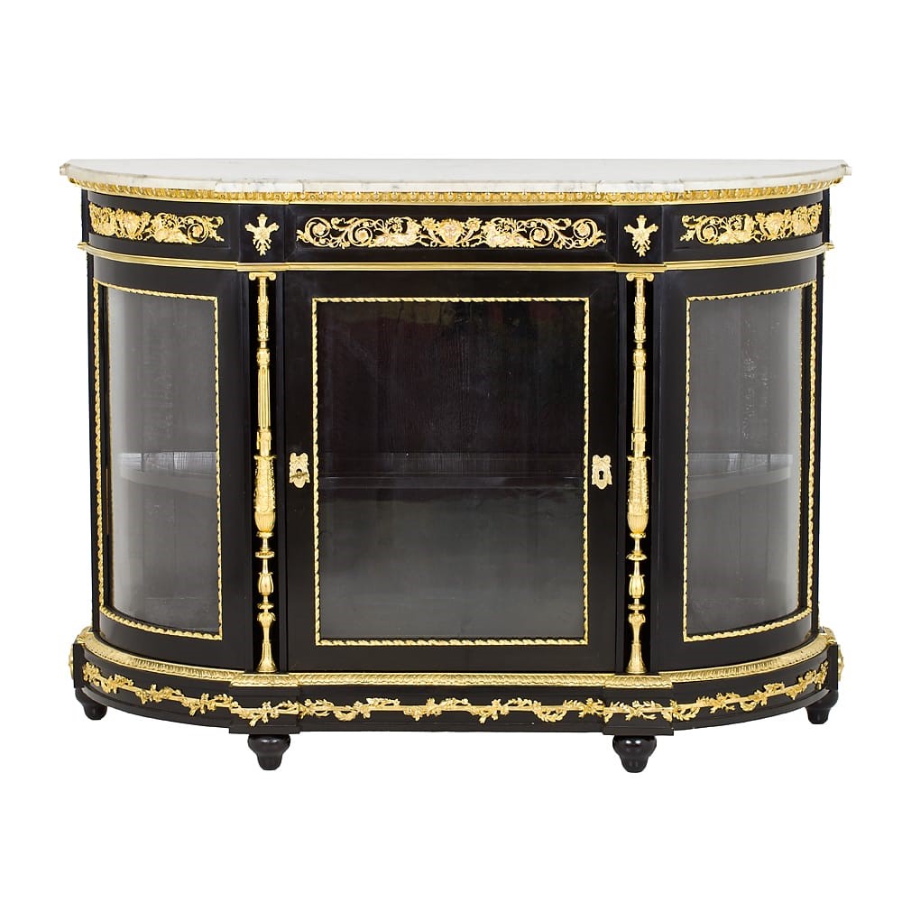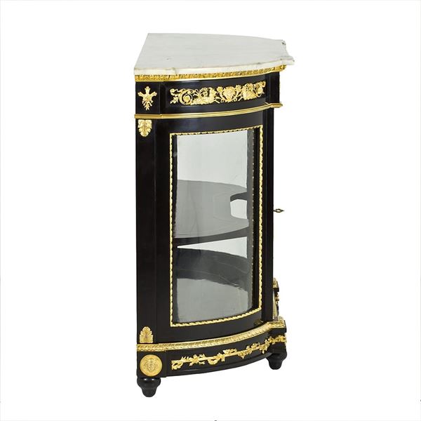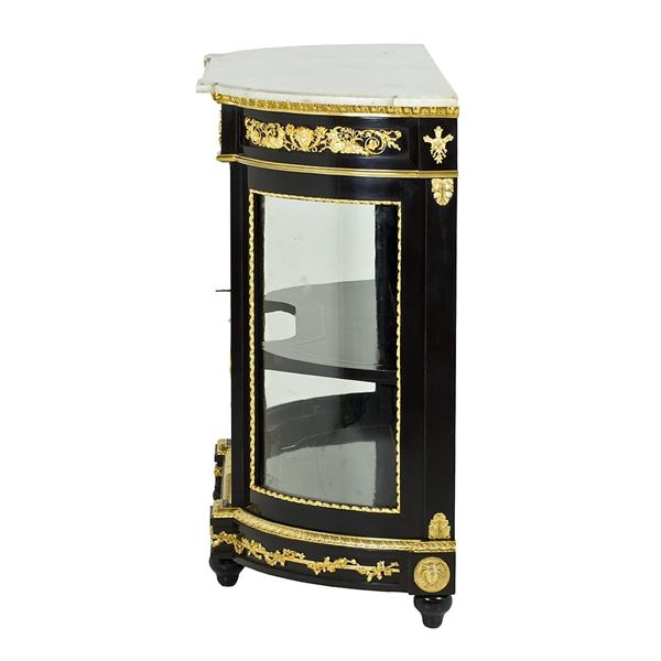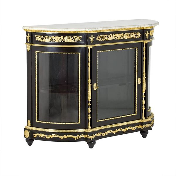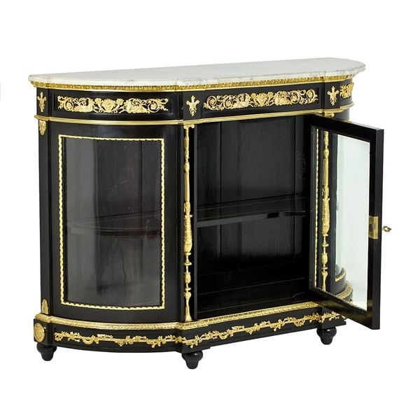 in legno ebanizzato su struttura di rovere, applicazioni in bronzo dorato finemente cesellate, piano in marmo bianco. Di forma mossa con sportello centrale a vetri e due sportelli laterali anch'essi in vetro. Stampigliatura a fuoco sotto il piano in marmo.