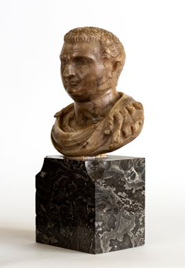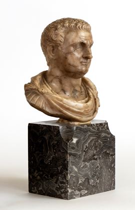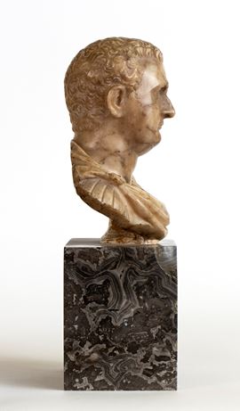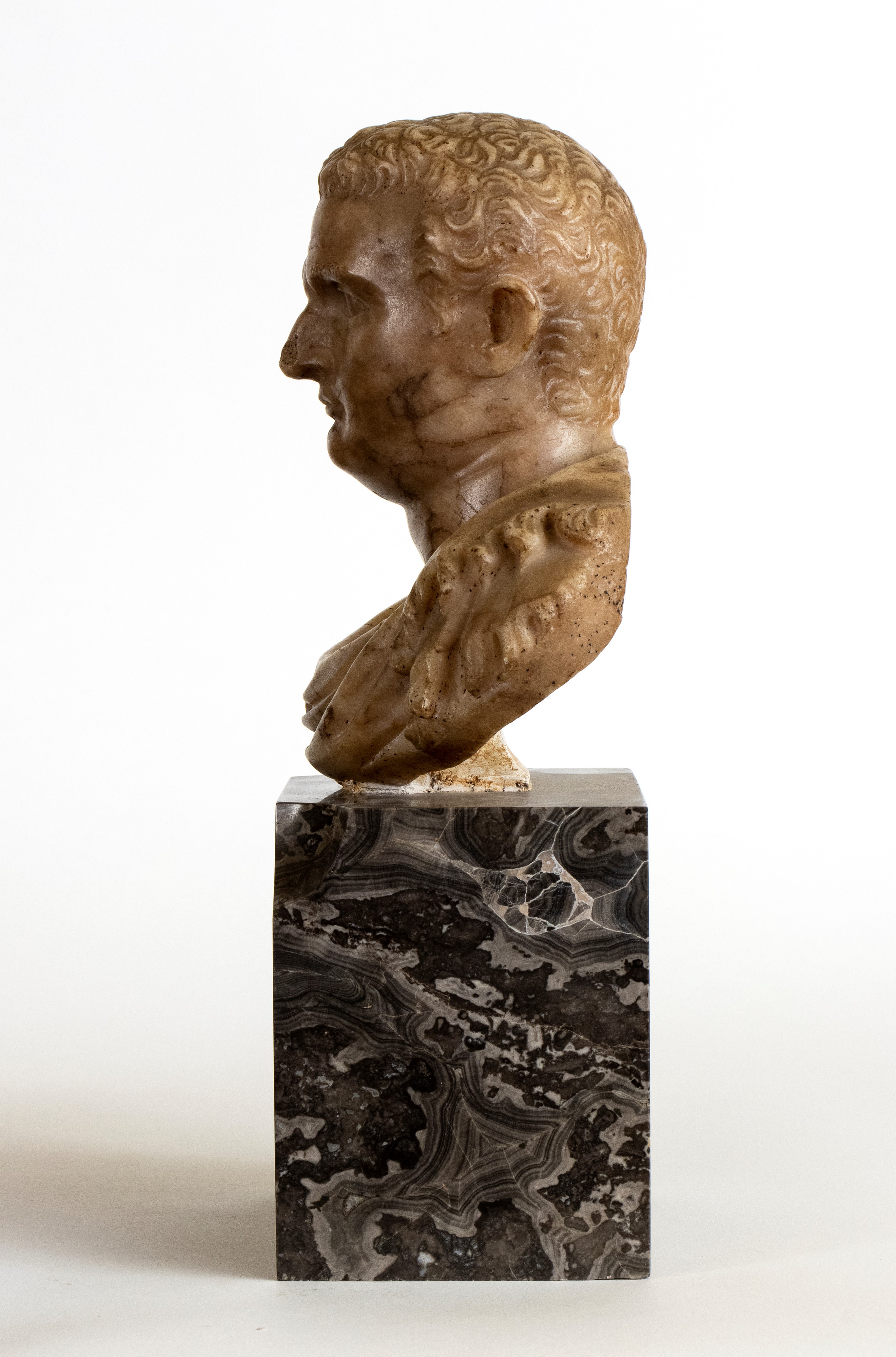 in marmo giallo antico raffigurante imperatore romano in toga, probabilmente ispirato a ritratti imperiali romani di epoca Flavia. Il busto poggia su base in marmo portoro.