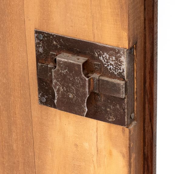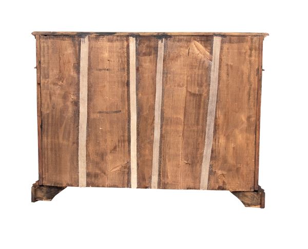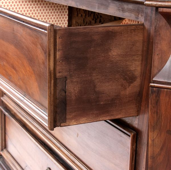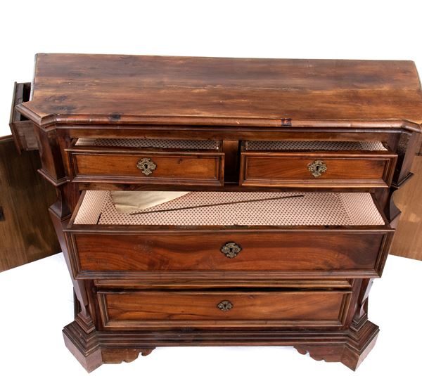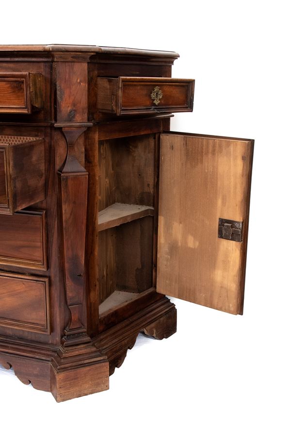 in legno di noce, fronte a tre cassetti più due piccoli cassetti nella parte superiore, lateralmente troviamo due sportelli con all'interno ripiani e sopra di essi due piccoli cassetti. Sulle lesene vi sono poste due colonne a rilievo e la base poggia su piedi a mensola. 1930 ca.