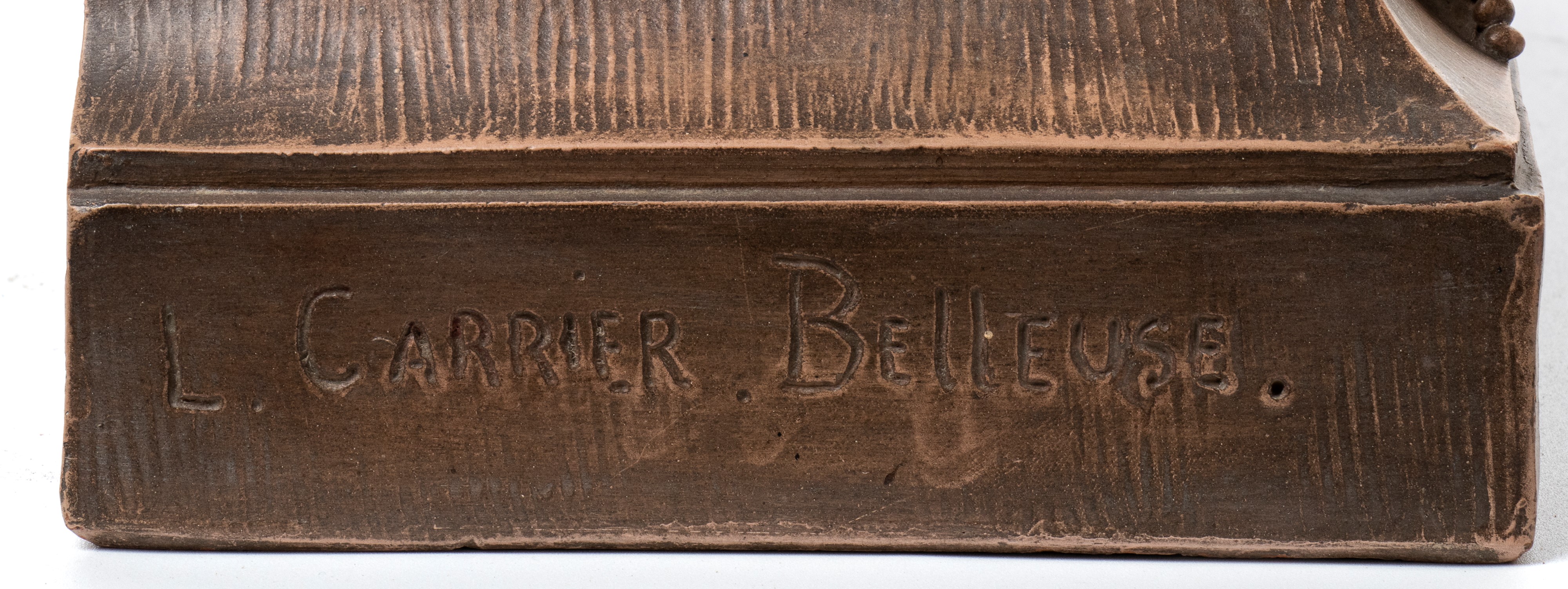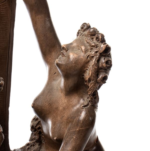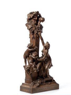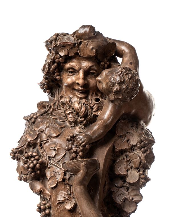 scultura in terracotta firmata alla base “L. Carrière-Belleuse” (Louis-Robert Carrière-Belleuse), raffigurante Bacco e una bella figura femminile in un’elegante composizione ispirata al tema dell’Offerta a Bacco (Offrande à Bacchus), celebre opera del 1868 del maestro Albert-Ernest Carrier-Belleuse, padre dell’artista.
