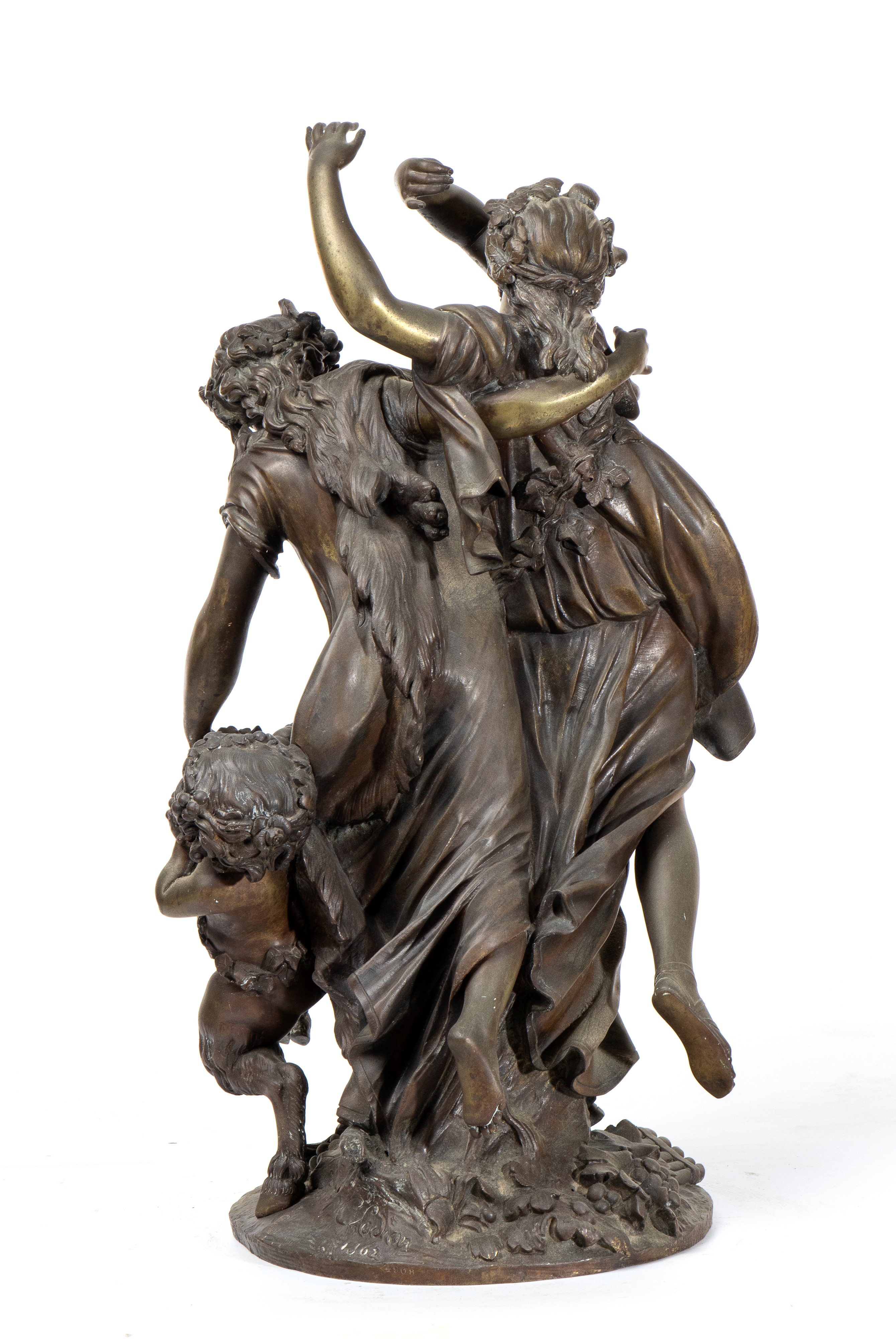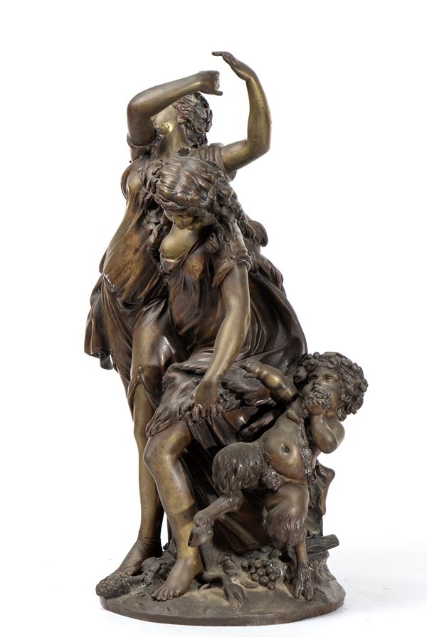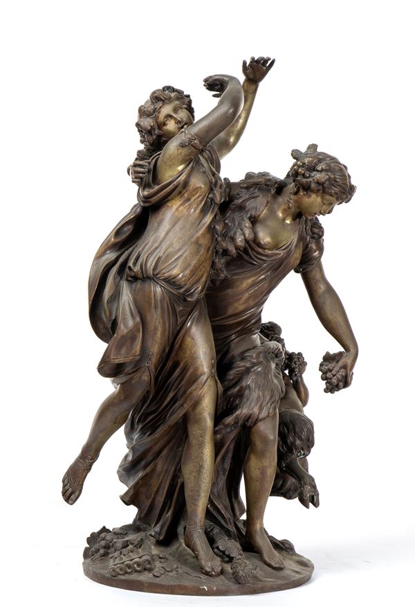 a patina bruna e dorata, rappresenta due baccanti drappeggiate, che suonano il tamburello e danzano, accompagnate da un satiro bambino che banchetta con grappoli d'uva. Firmata alla base "Clodion 1762" e numerata 4908, reca sul terrapieno la firma "Clodion 1762", pseudonimo dello scultore lorenese Claude Michel. Artista prolifico, Clodion è famoso per aver vinto il Grand Prix de Rome nel 1759 e per aver realizzato, su richiesta di Luigi XVI, la statua di Montesquieu oggi esposta al Louvre.