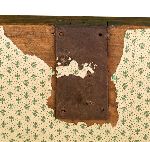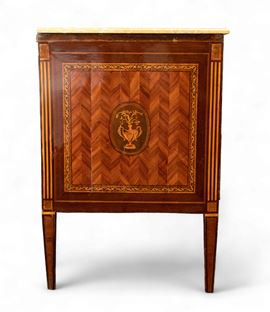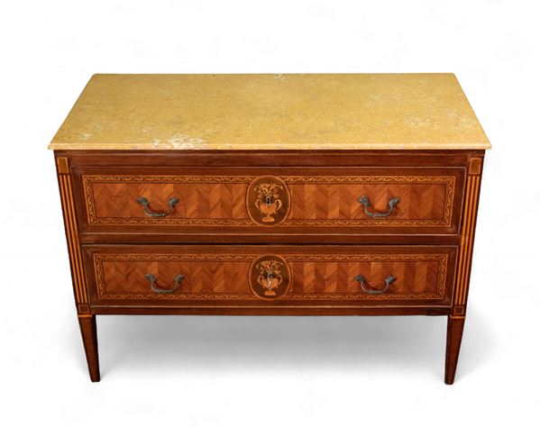 a due cassetti in noce e bois de rose (Dalbergia spp.) intarsiato in legni di frutto. Decorato sul fronte con motivi a spina di pesce e ovali con vasi floreali. Gambe a sezione tronco piramidale. Piano in marmo non coevo e maniglie aggiunte nel primi del Novecento.