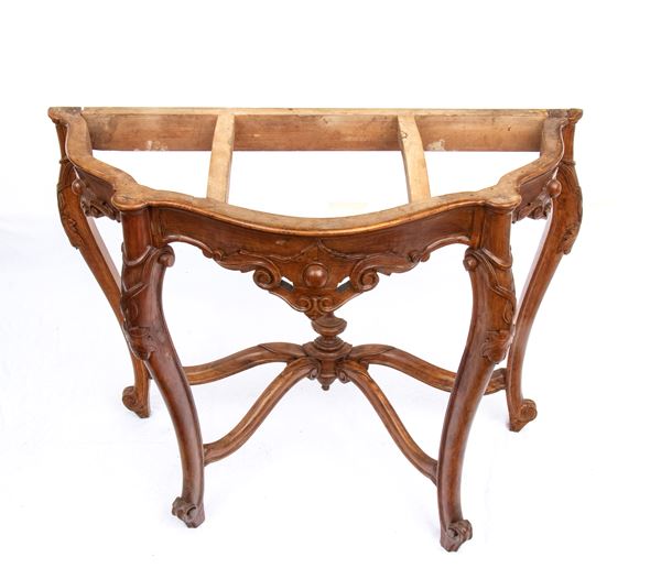 in legno di noce finemente intagliato, con decori vegetali e motivi rocaille. Piano sagomato intarmo bianco. Gambe arcuate e riunite da una crociera centrale tornita. La fascia sottopiatto è riccamente intagliata con volute motivo centrale a conchiglia.