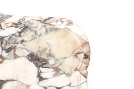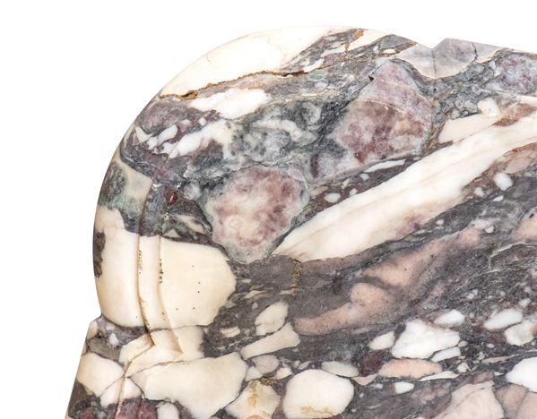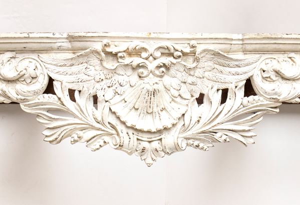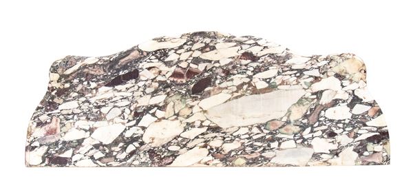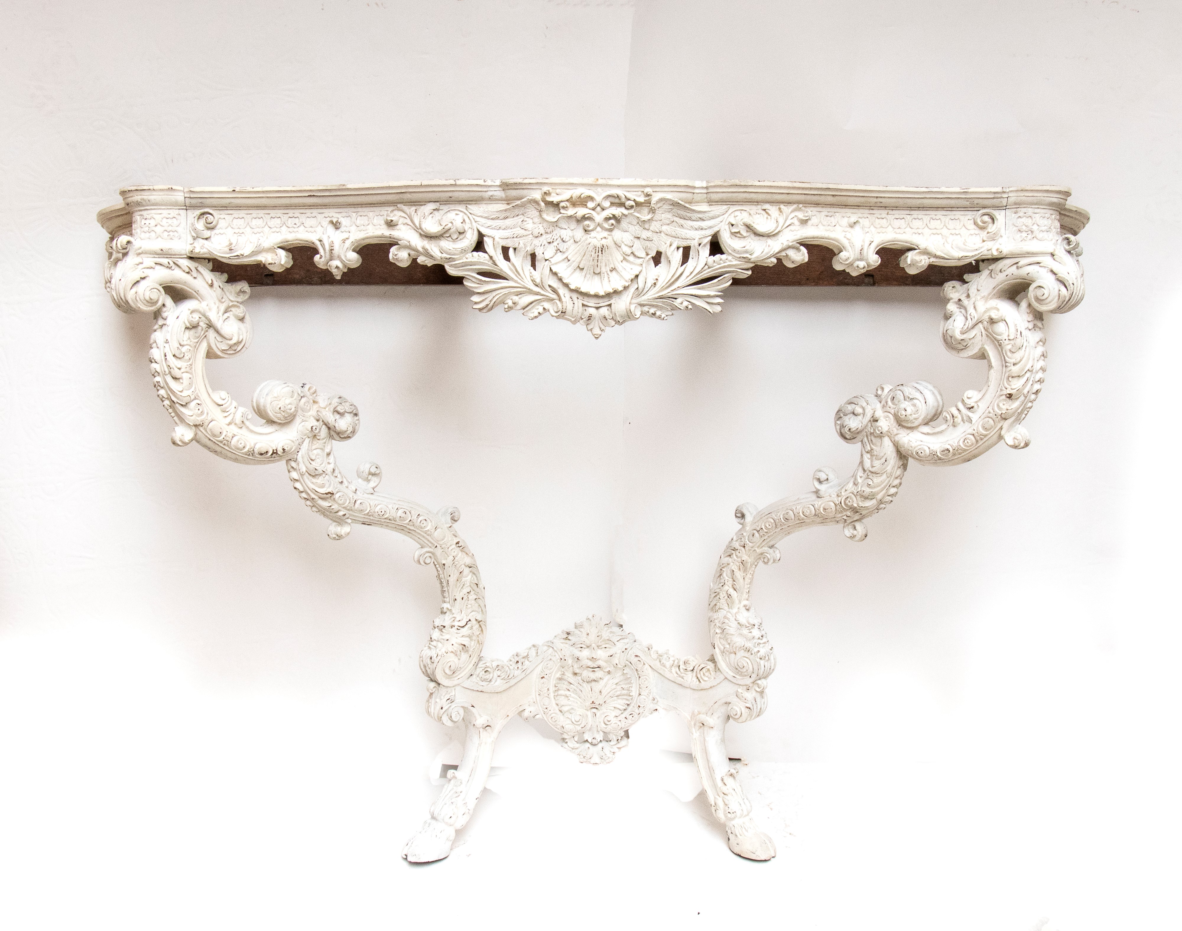 intagliata a motivi rocaille, volute fogliate, conchiglie e mascheroni. Gambe sagomate e unite da traversa scolpita. Piano in marmo breccia policromo