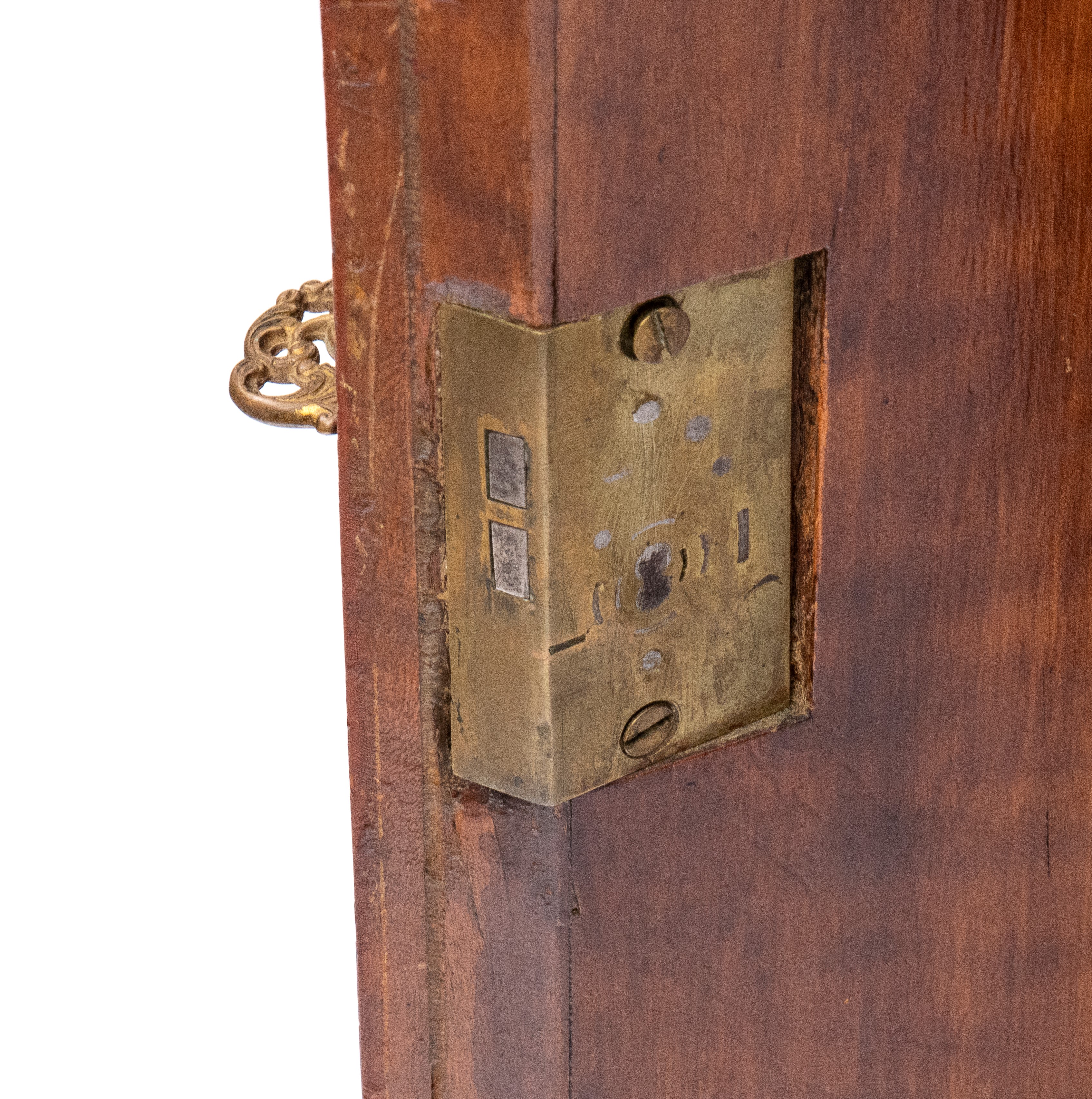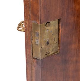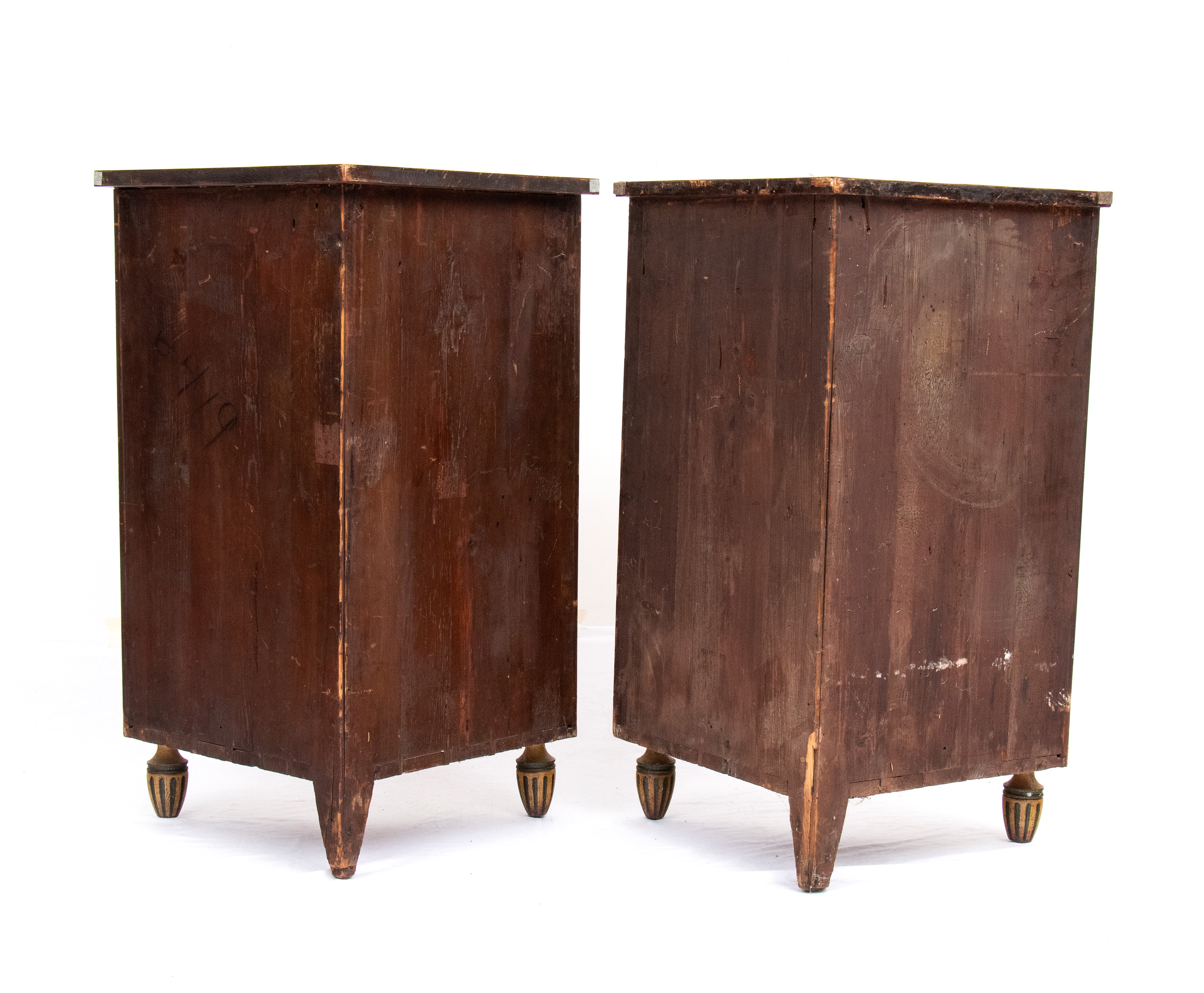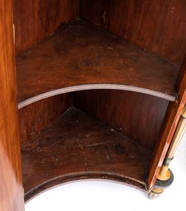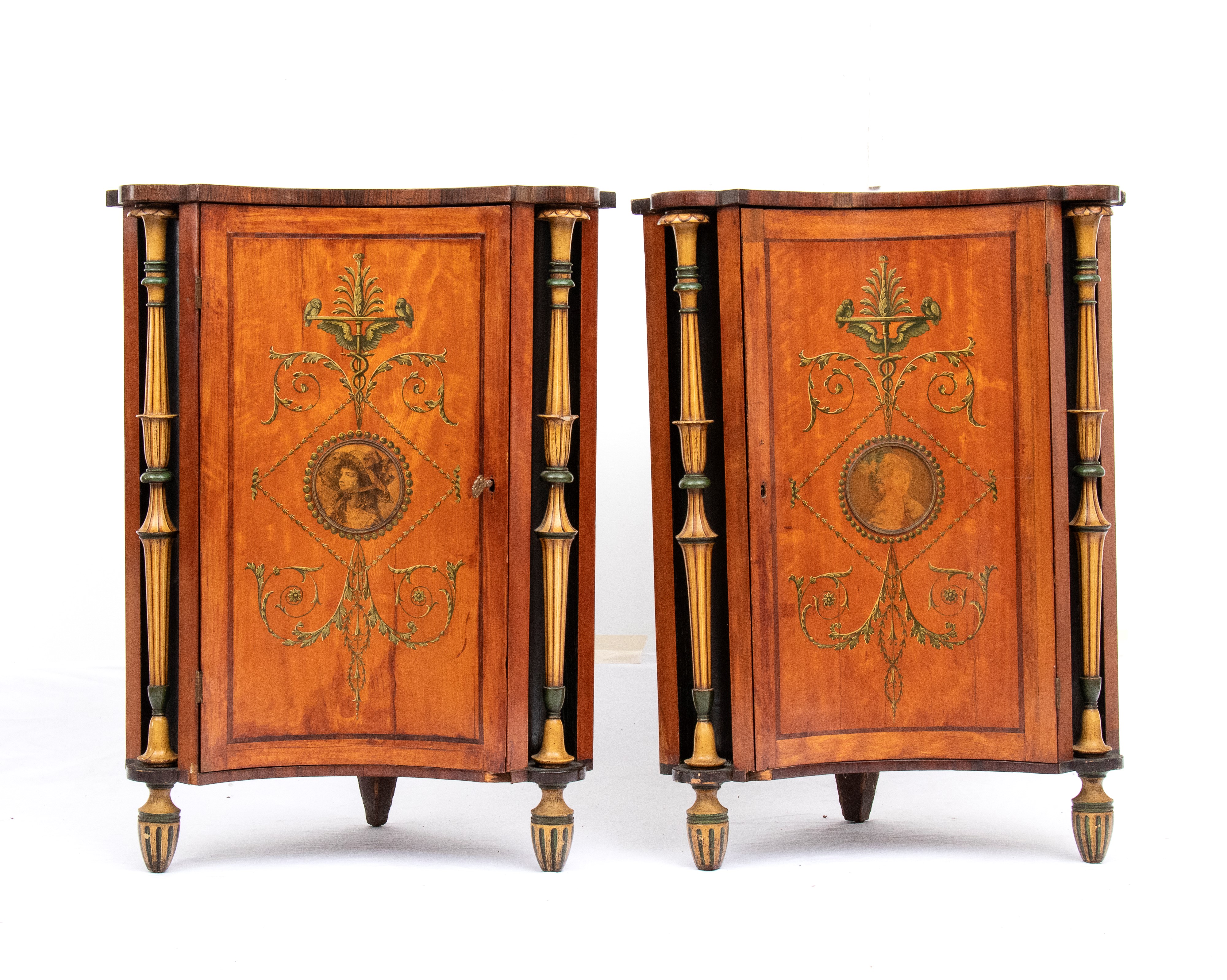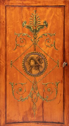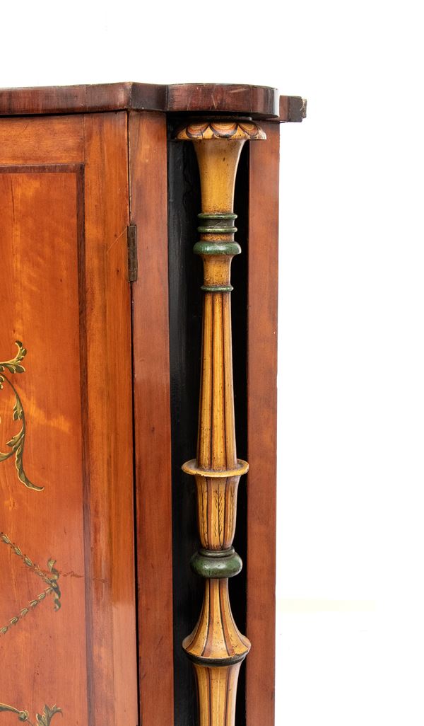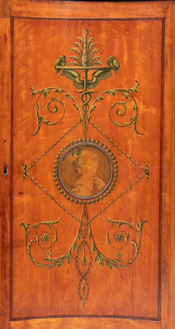 impiallacciate in legno di satinwood con decorazioni in legni policromi dipinte a mano. Le ante sagomate presentano motivi classici con volute vegetali e un medaglione centrale raffiguranti due profili femminili. Ai lati due colonne tornite applicate, dipinte in verde e oro, con fusti scanalati e capitelli stilizzati.