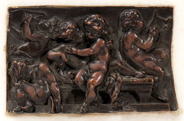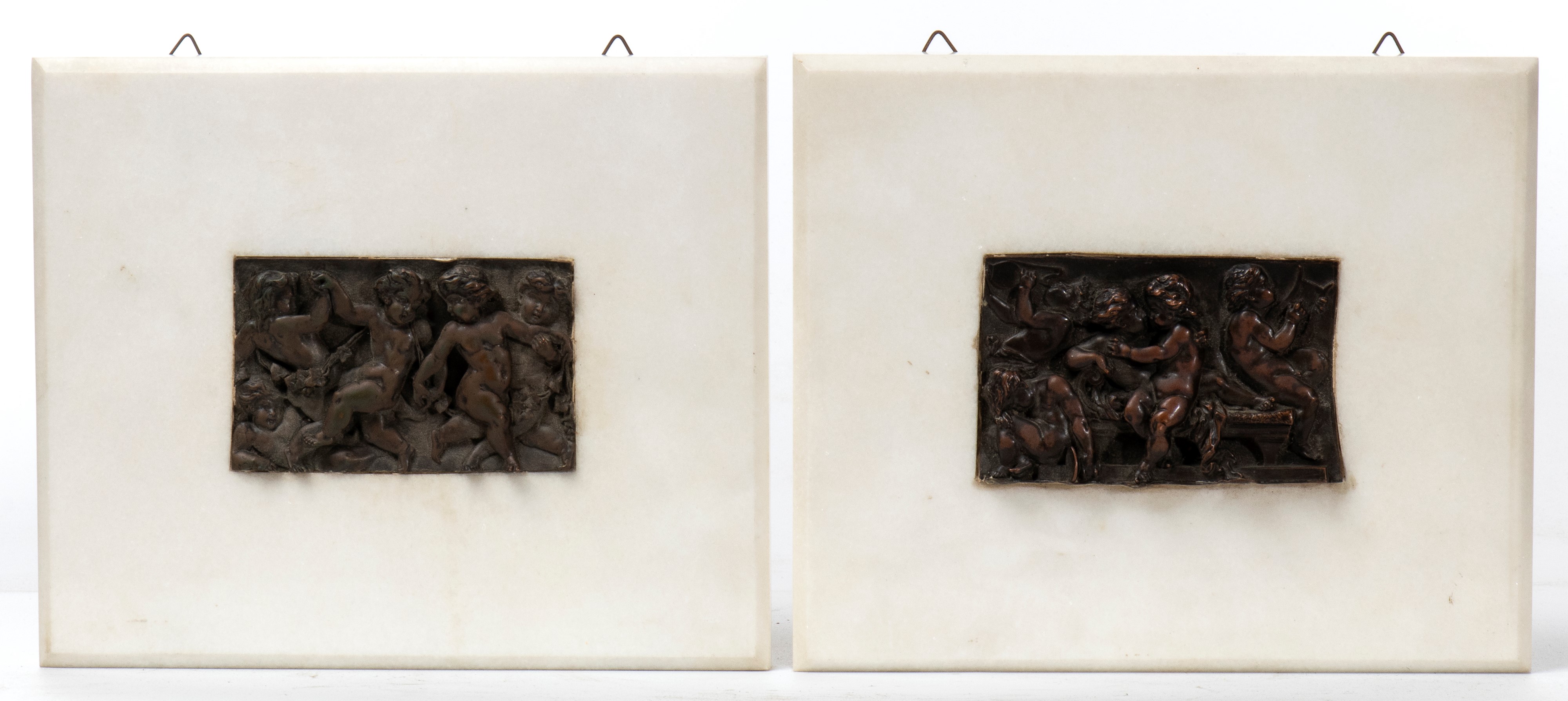 eleganti placche raffiguranti scene di putti in festosa attività. Uno dei rilievi mostra putti danzanti, l'altro putti musicanti. Montaggio recente su cornici di marmo bianco statuario.