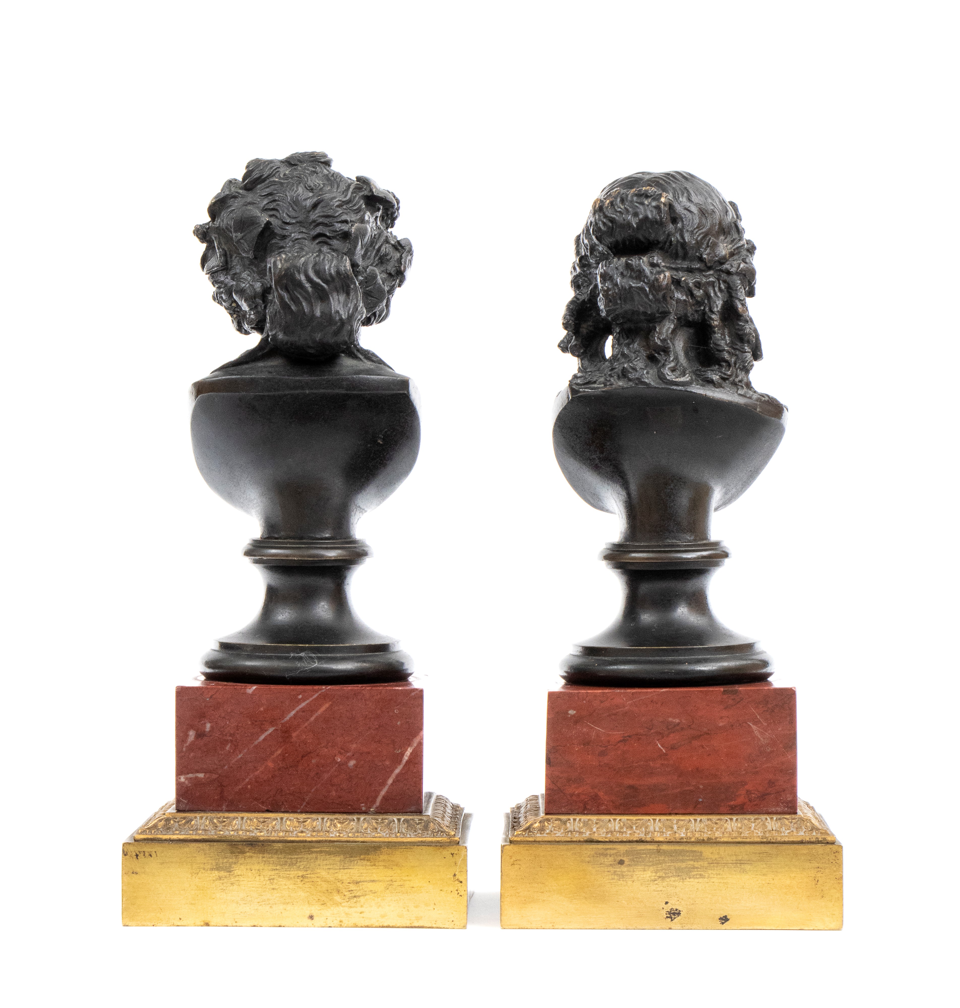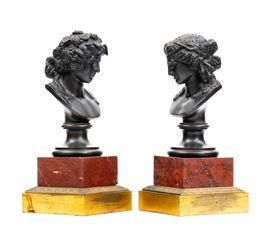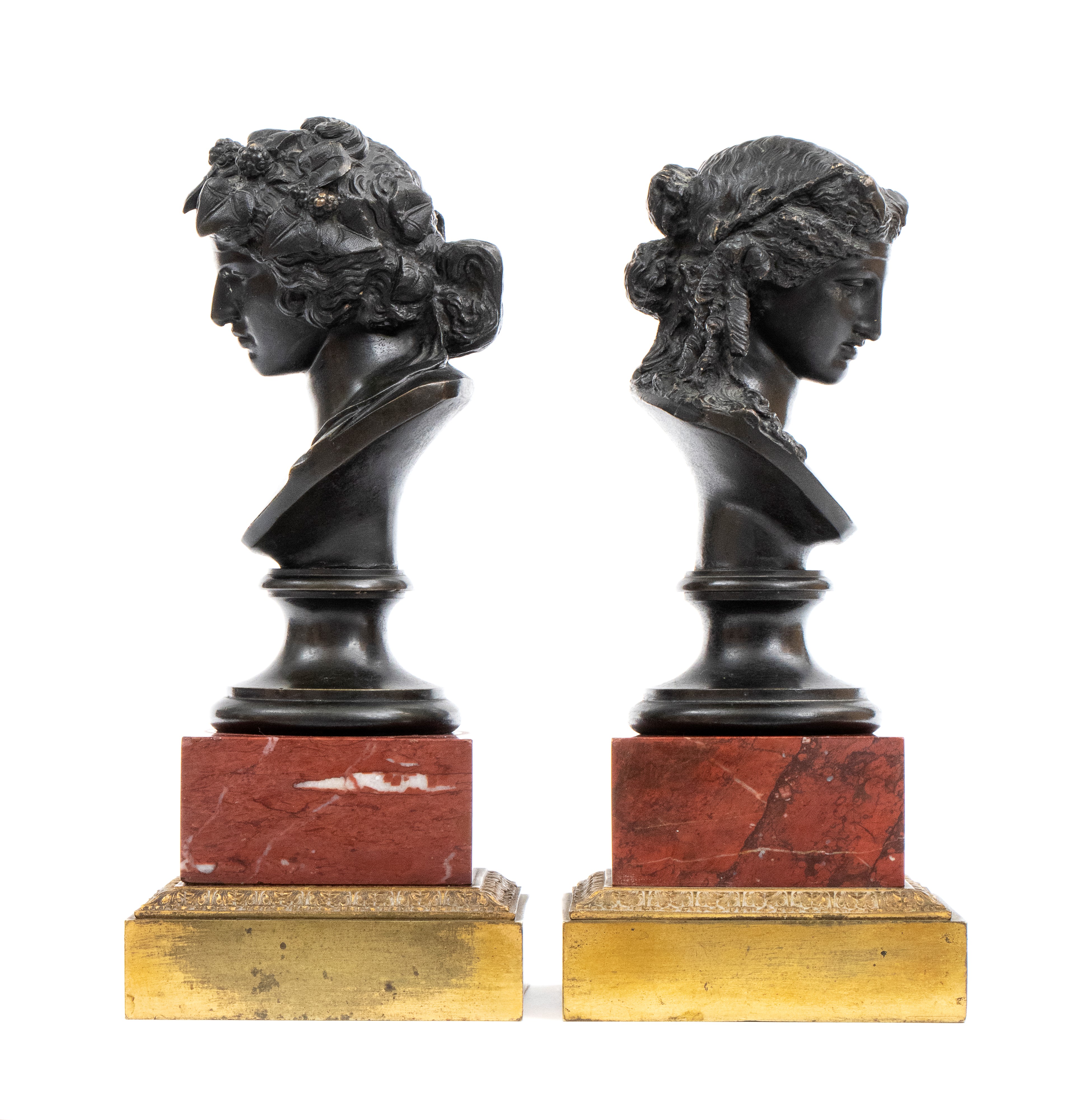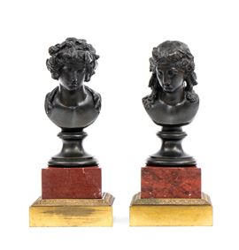 in bronzo patinato raffiguranti una figura maschile con corona di pampini e una figura femminile con corona di spighe ( probabilmente Dioniso/Bacco e Cerere), entrambi su base di marmo rosso di Francia con zoccolo in bronzo dorato finemente cesellato.