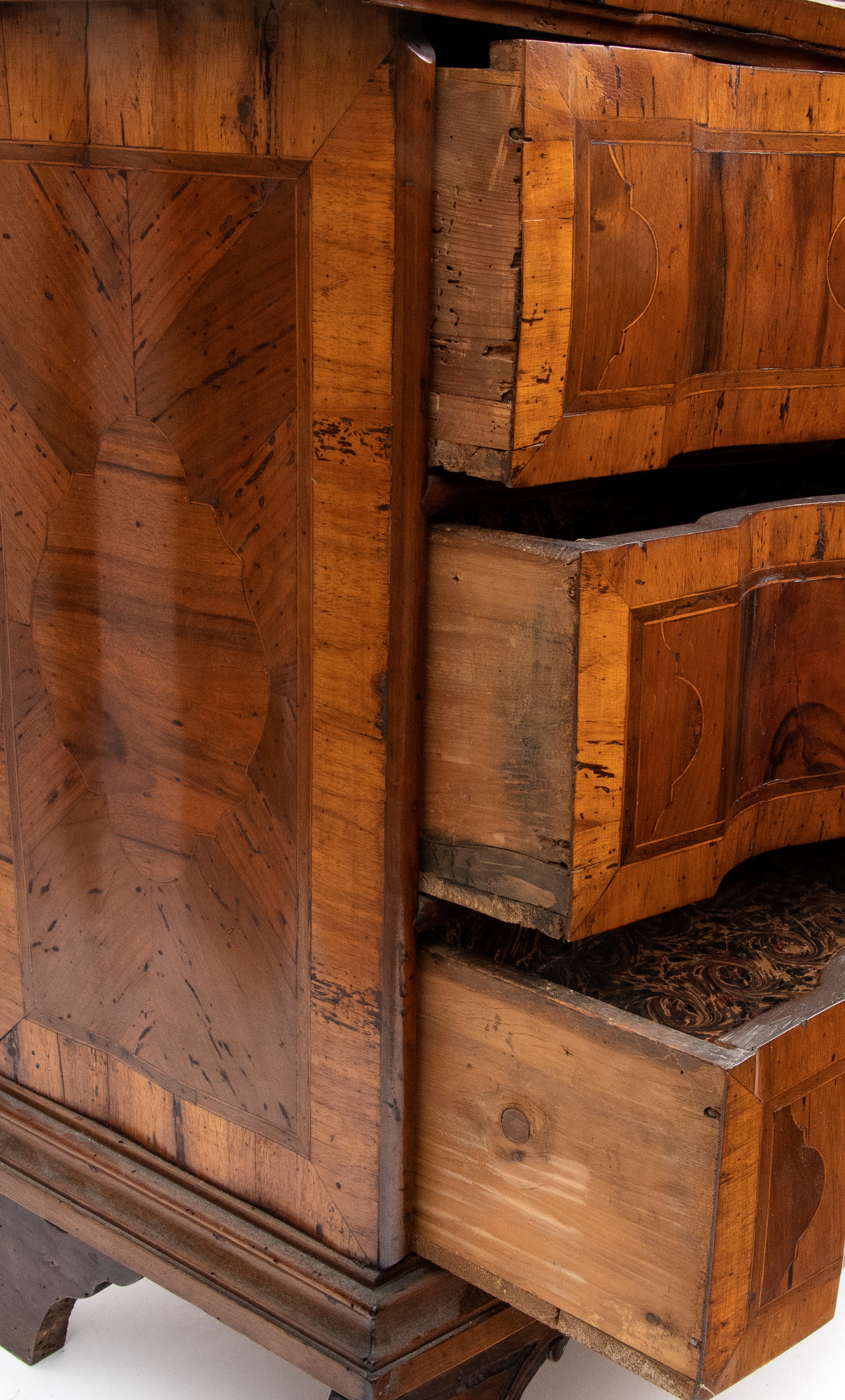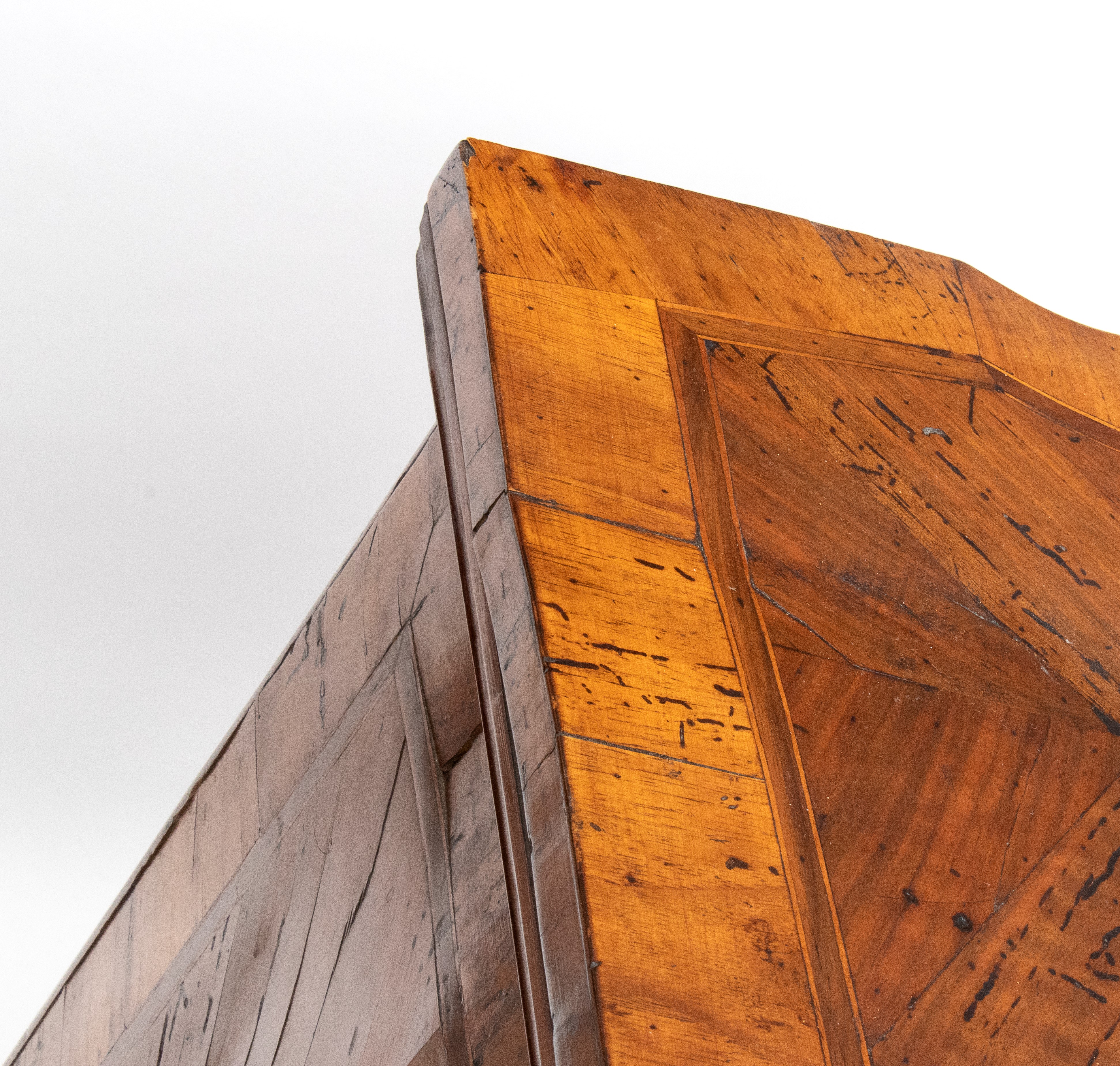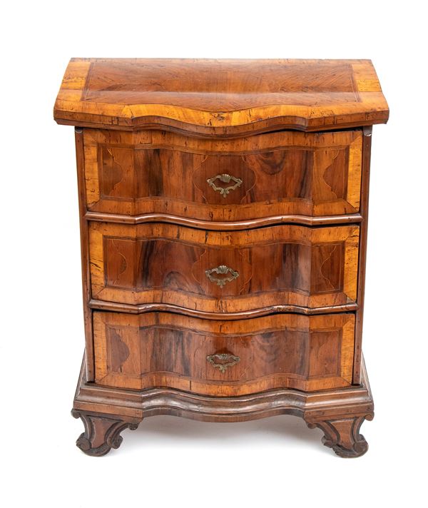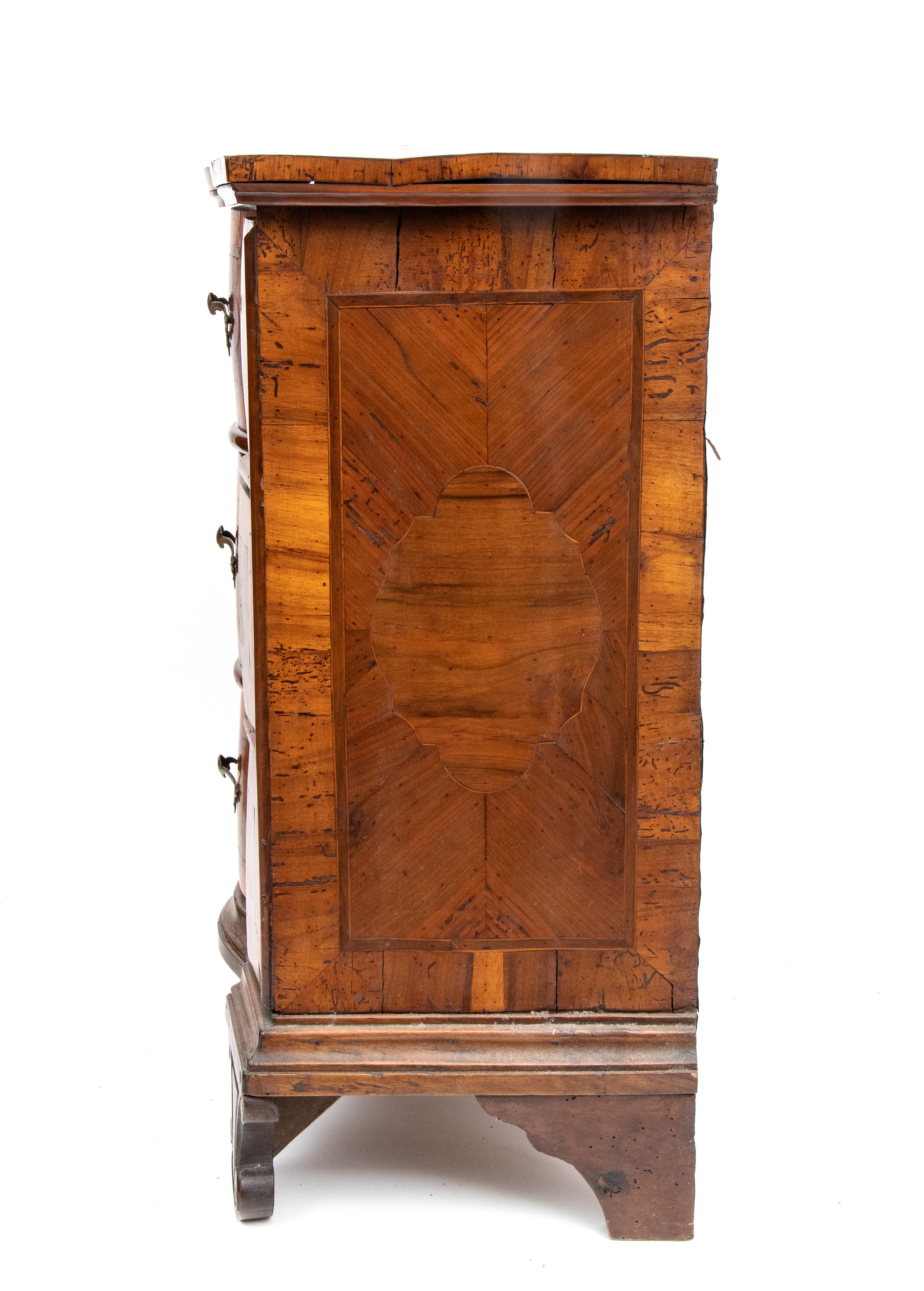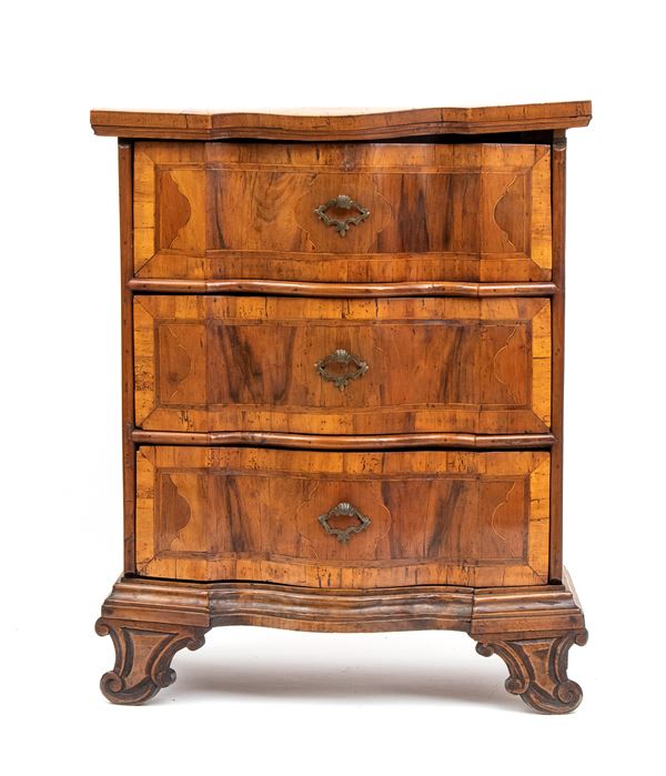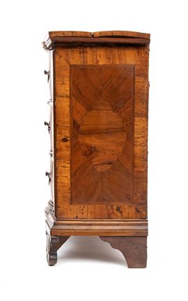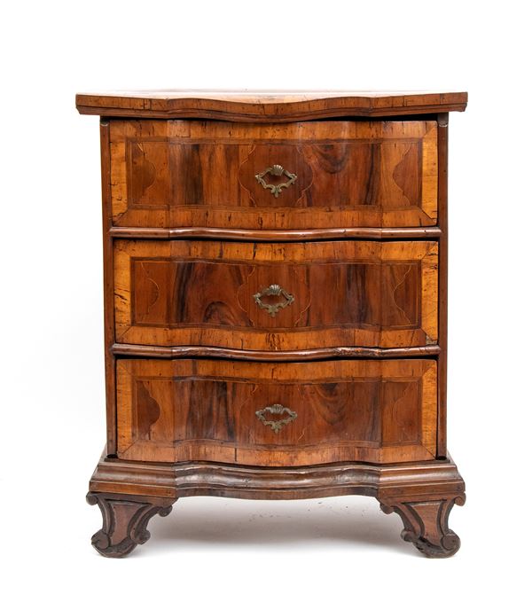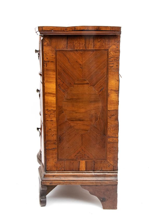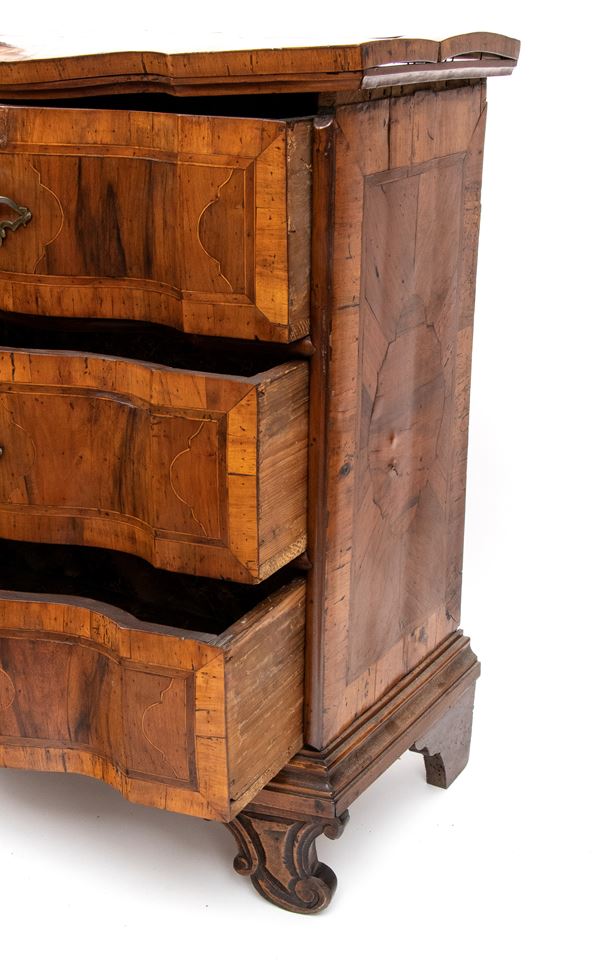 in noce e radica di noce con intarsi in legni di frutto, fronte mosso, tre cassetti con maniglie in bronzo, piedi a ricciolo. Probabilmente area milanese.