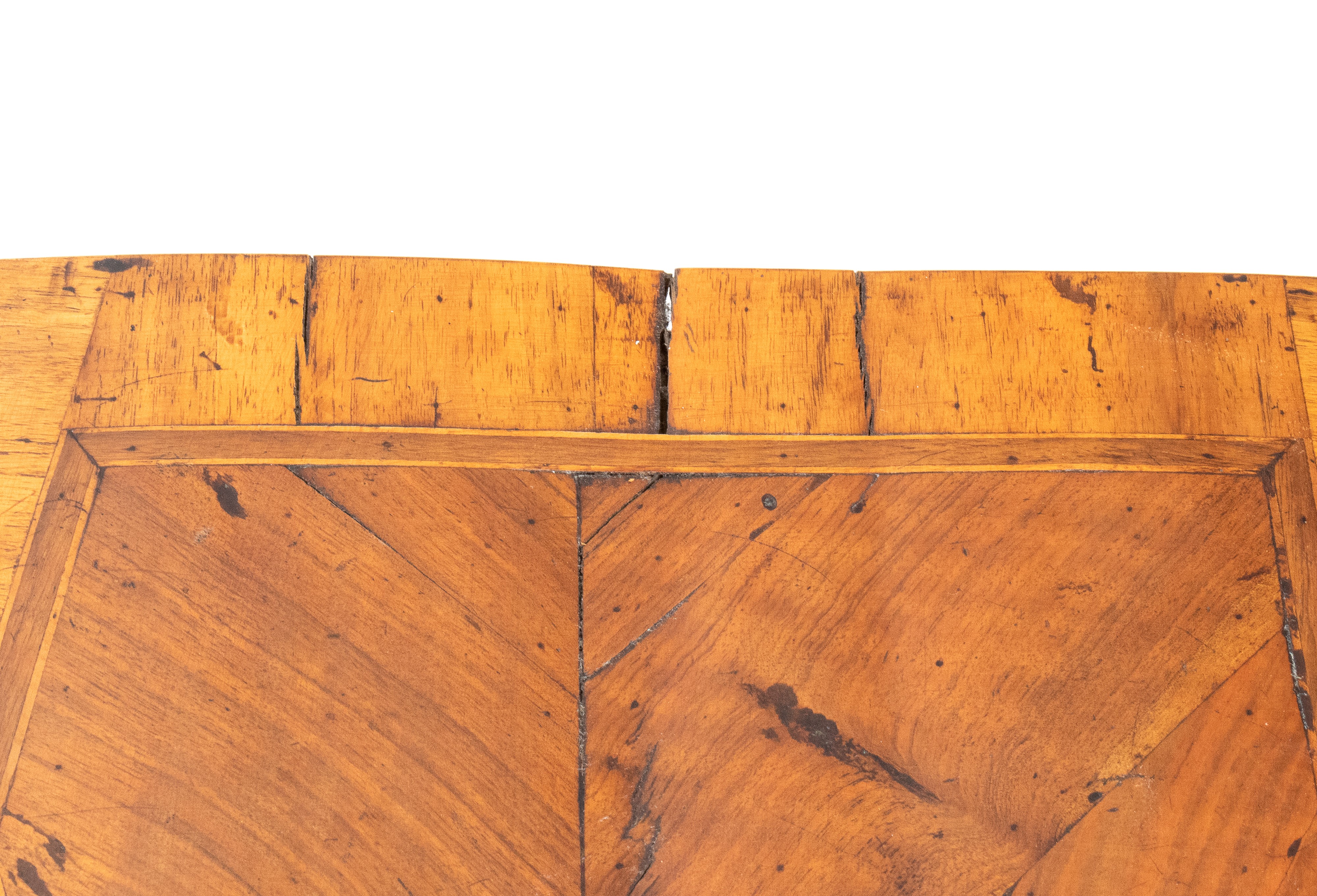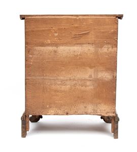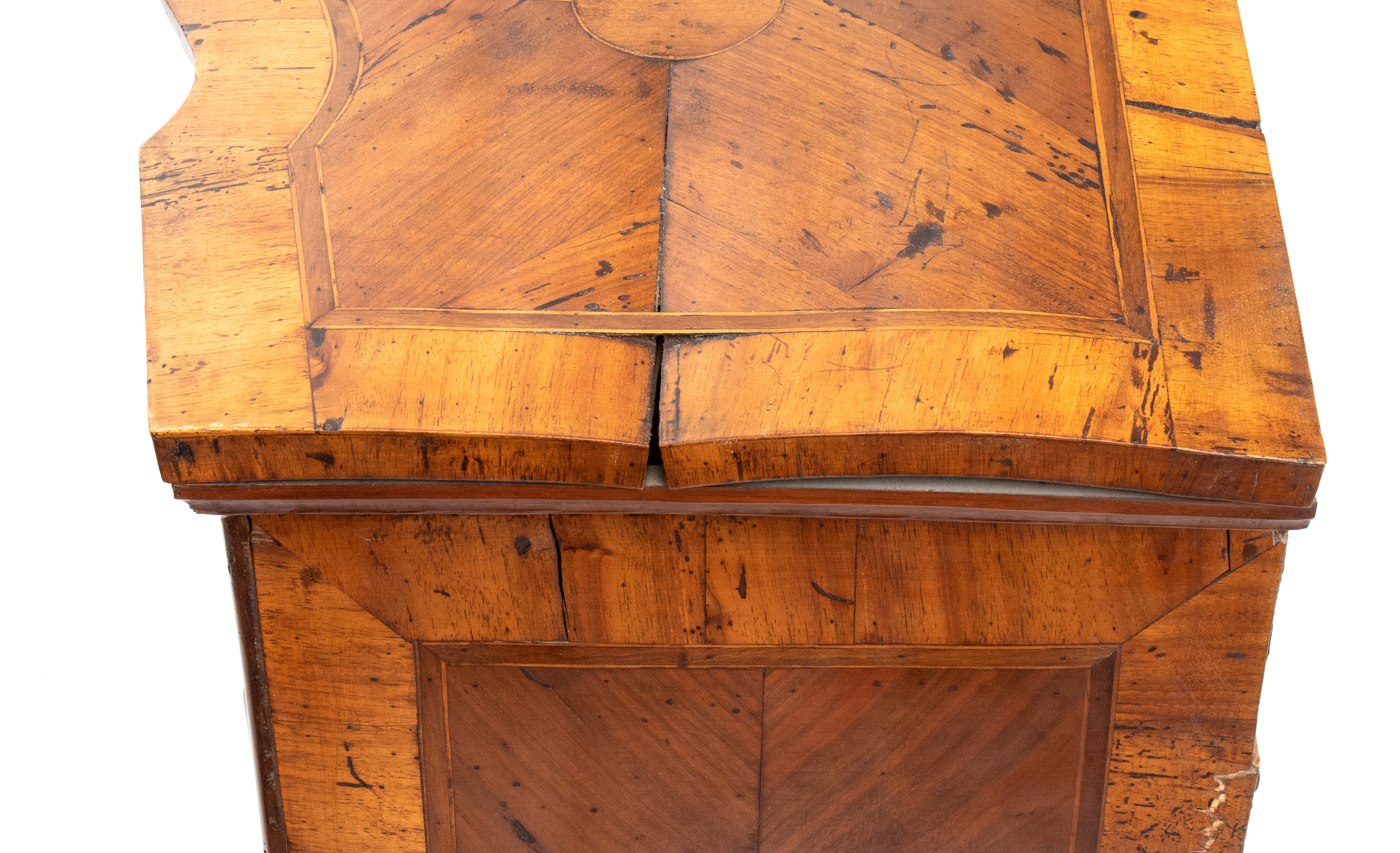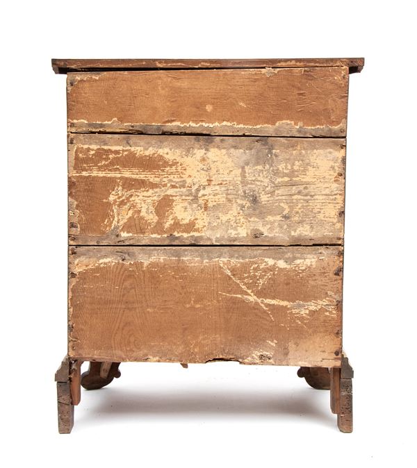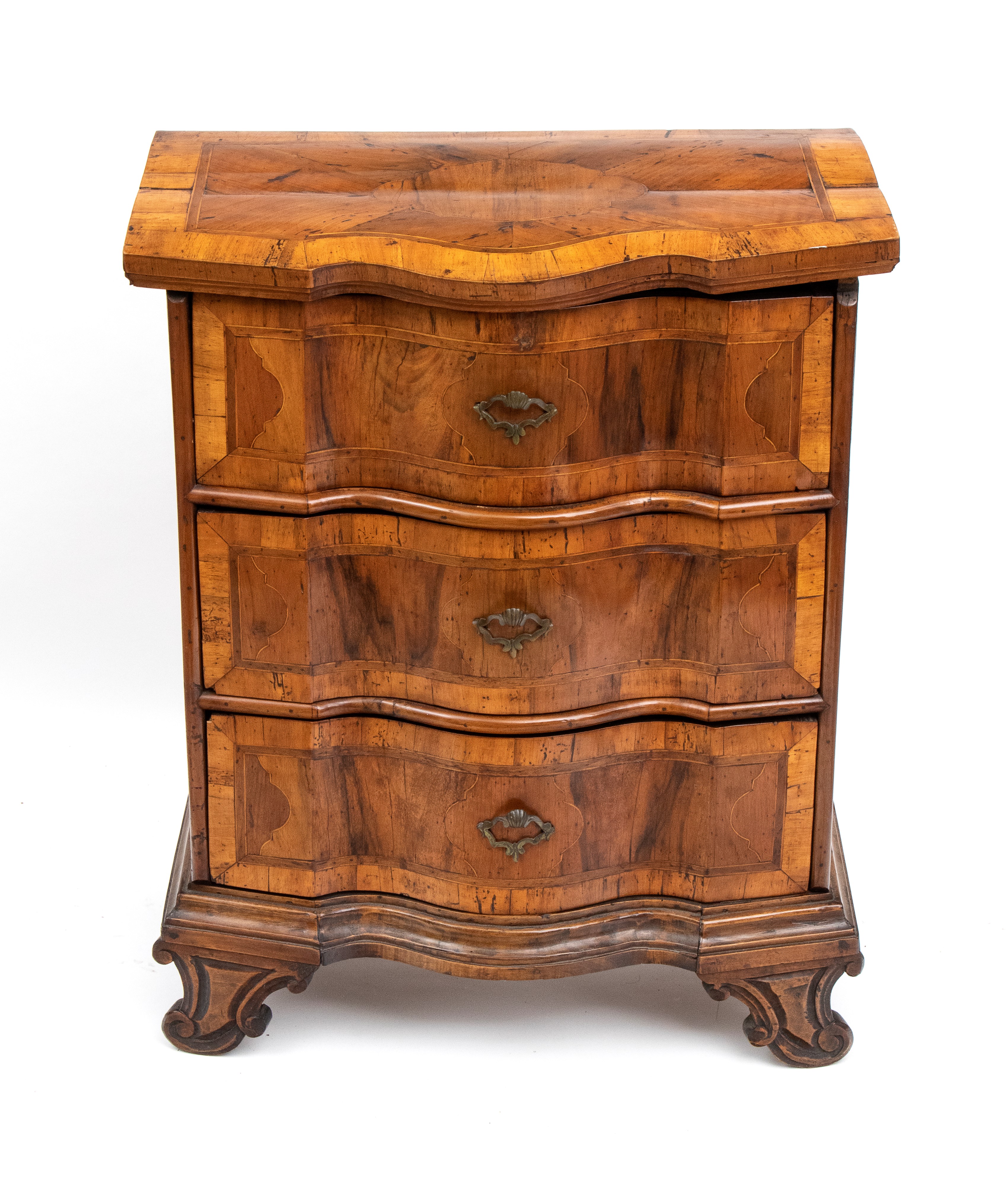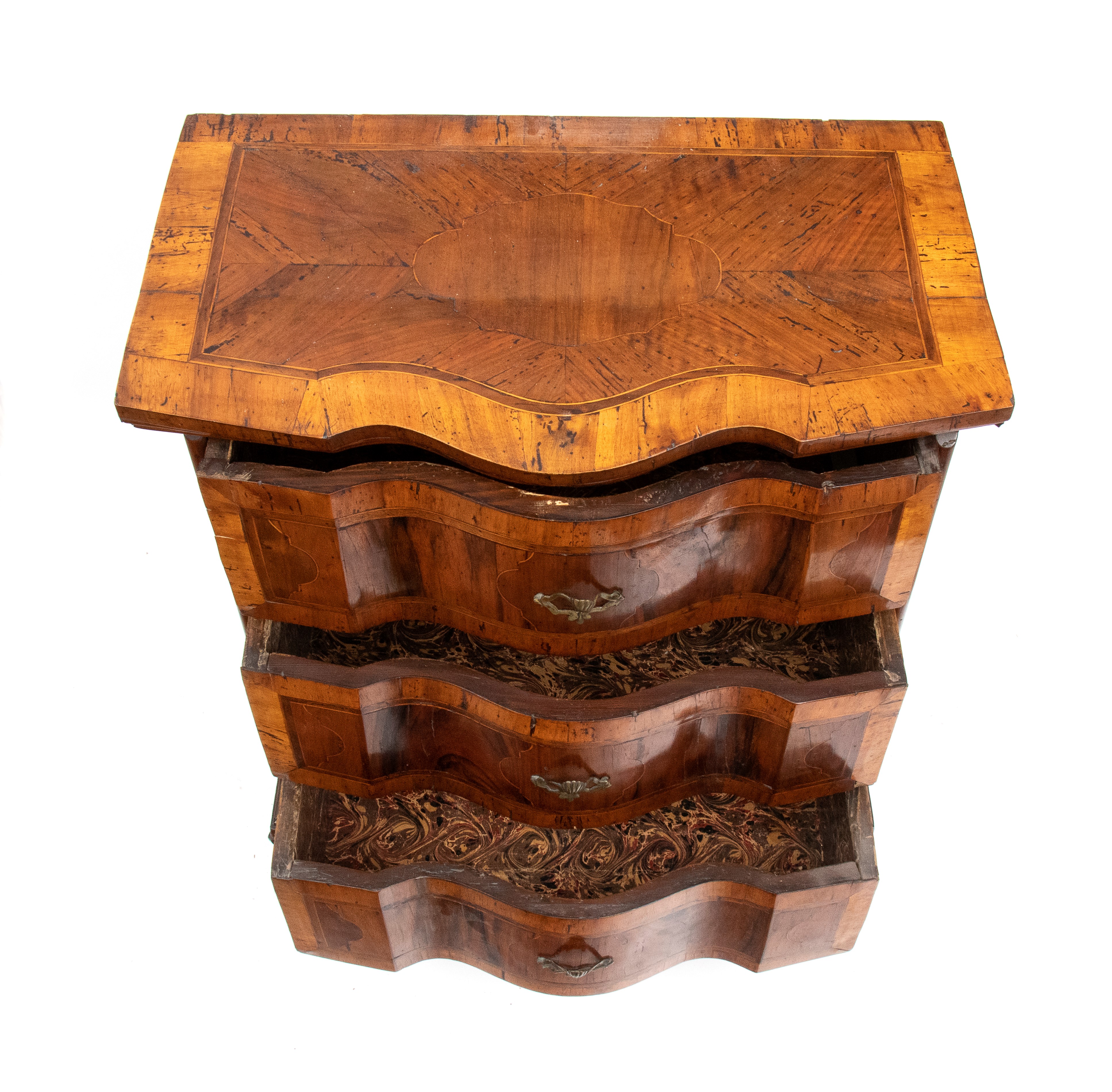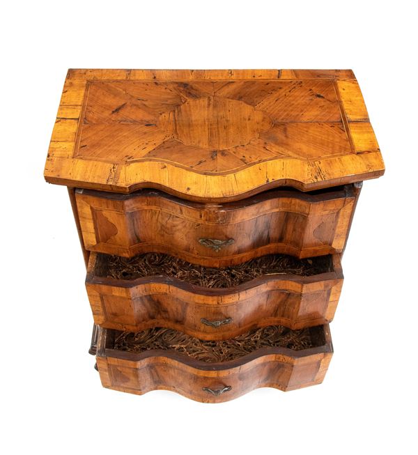 in noce e radica di noce con intarsi in legni di frutto, fronte mosso, tre cassetti con maniglie in bronzo, piedi a ricciolo. Probabilmente area milanese.