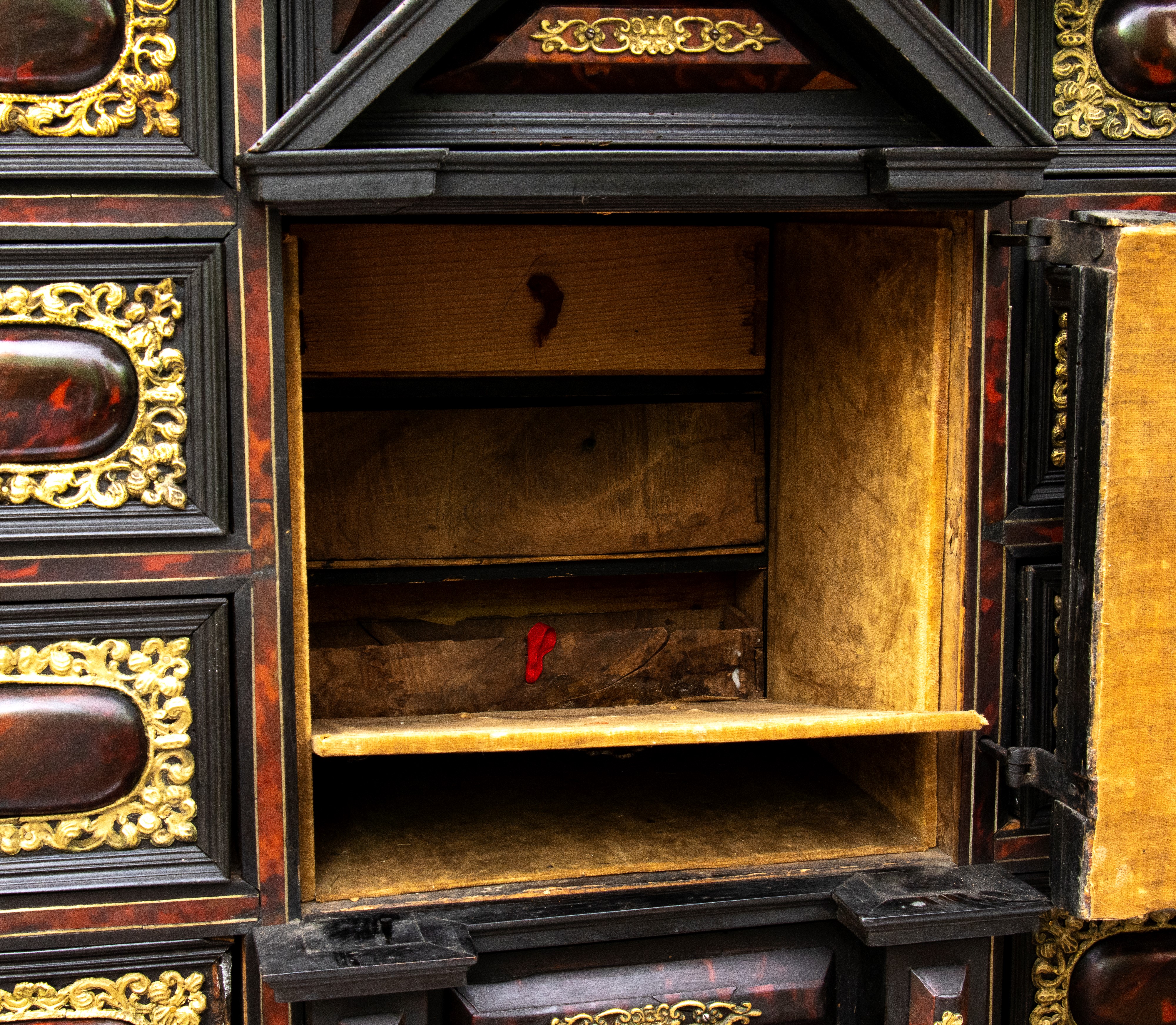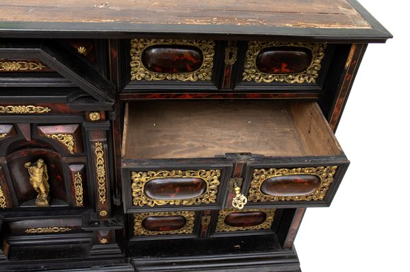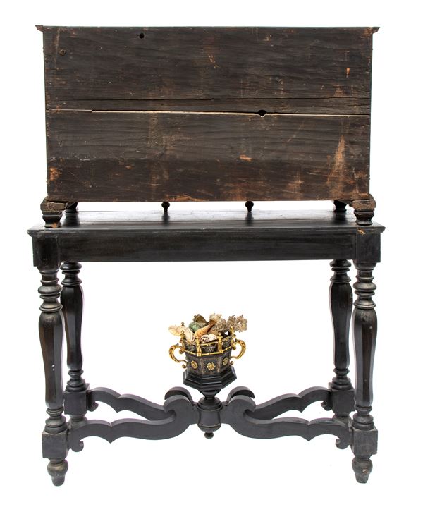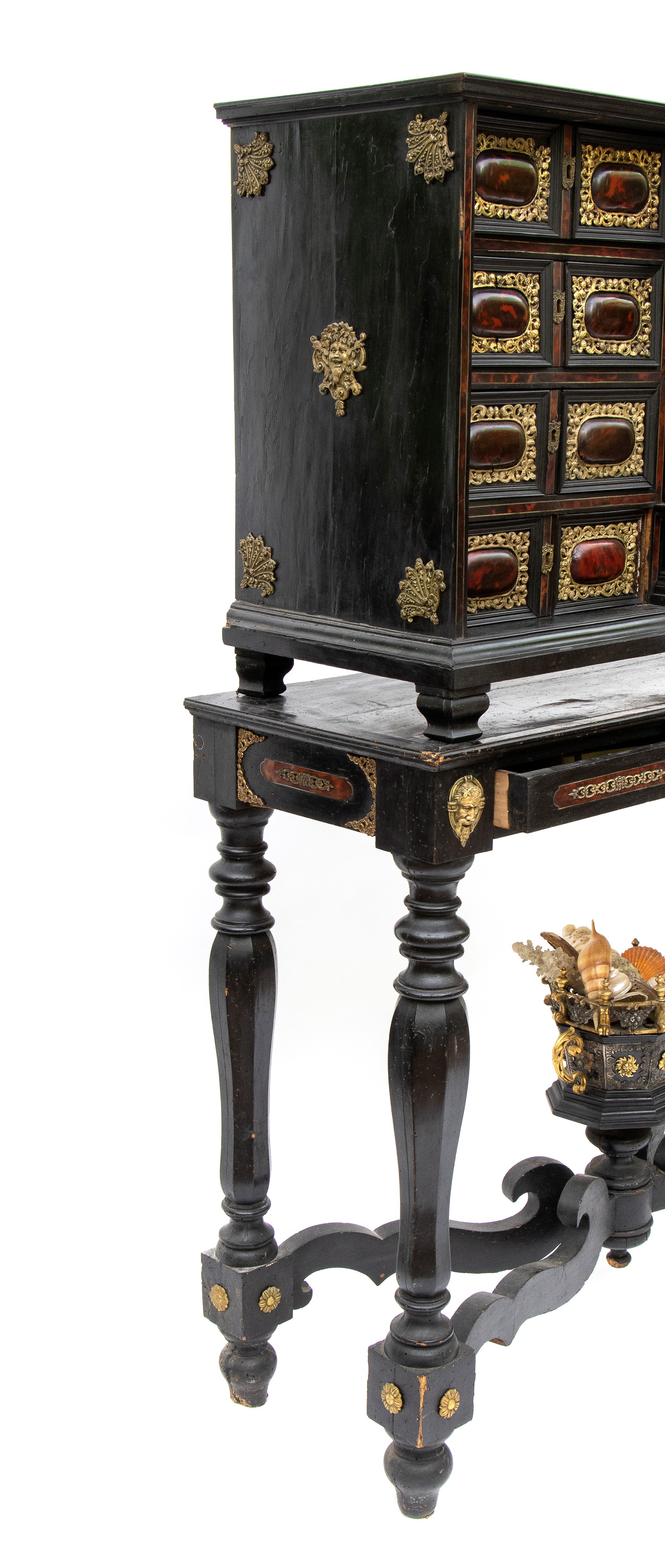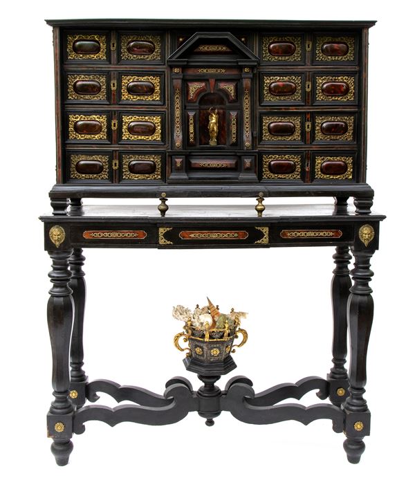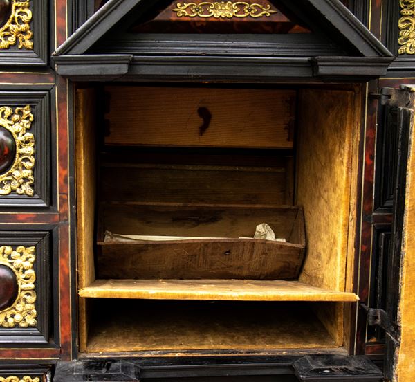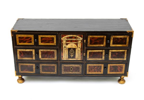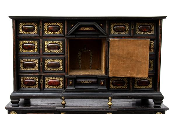 con struttura in pioppo, legno ebanizzato, tartaruga (hawksbill sea turtle, Eretmochelys imbricata, Cheloniidae) e inserti in bronzo, poggianti su basi finemente intagliate.