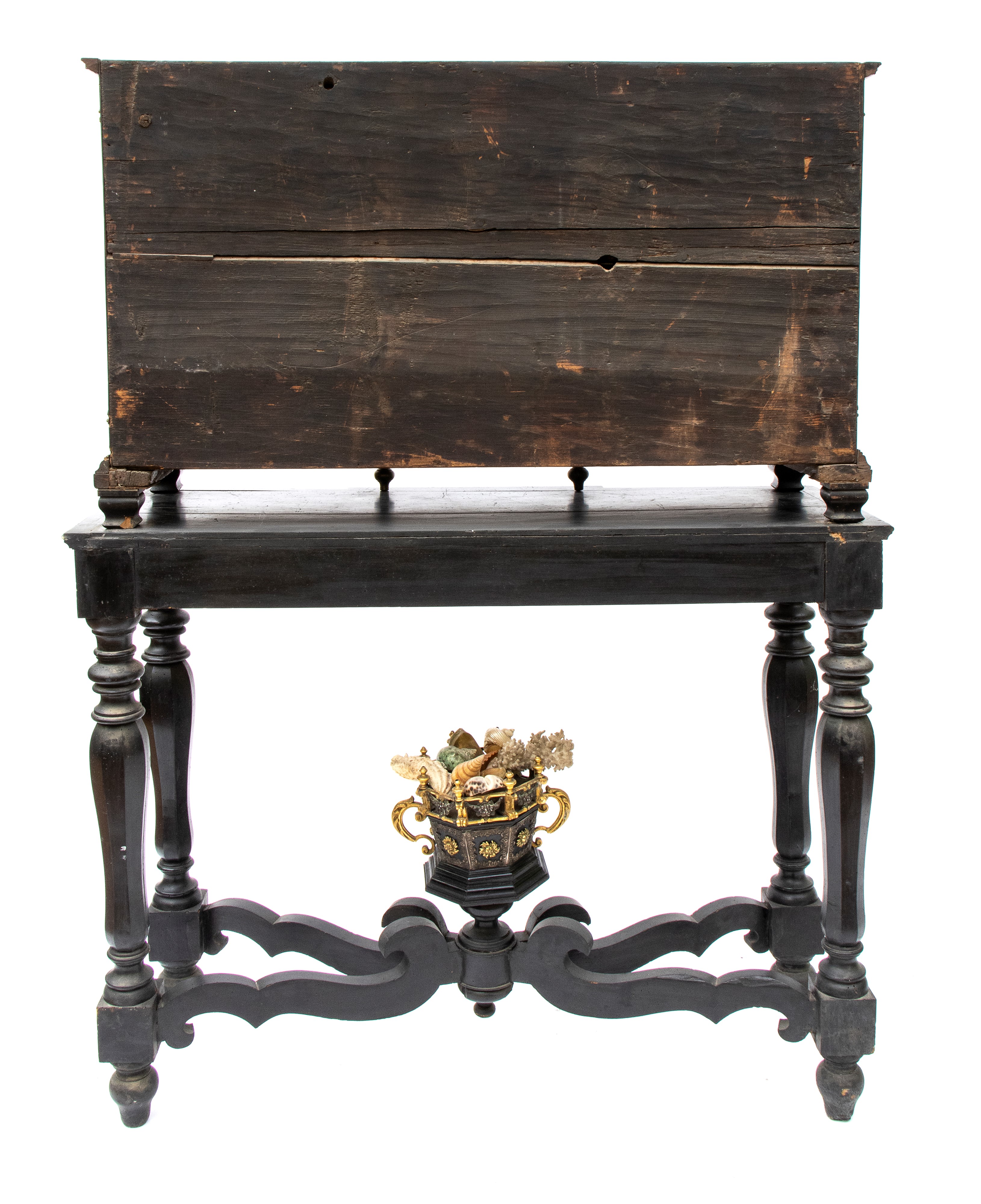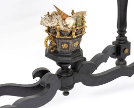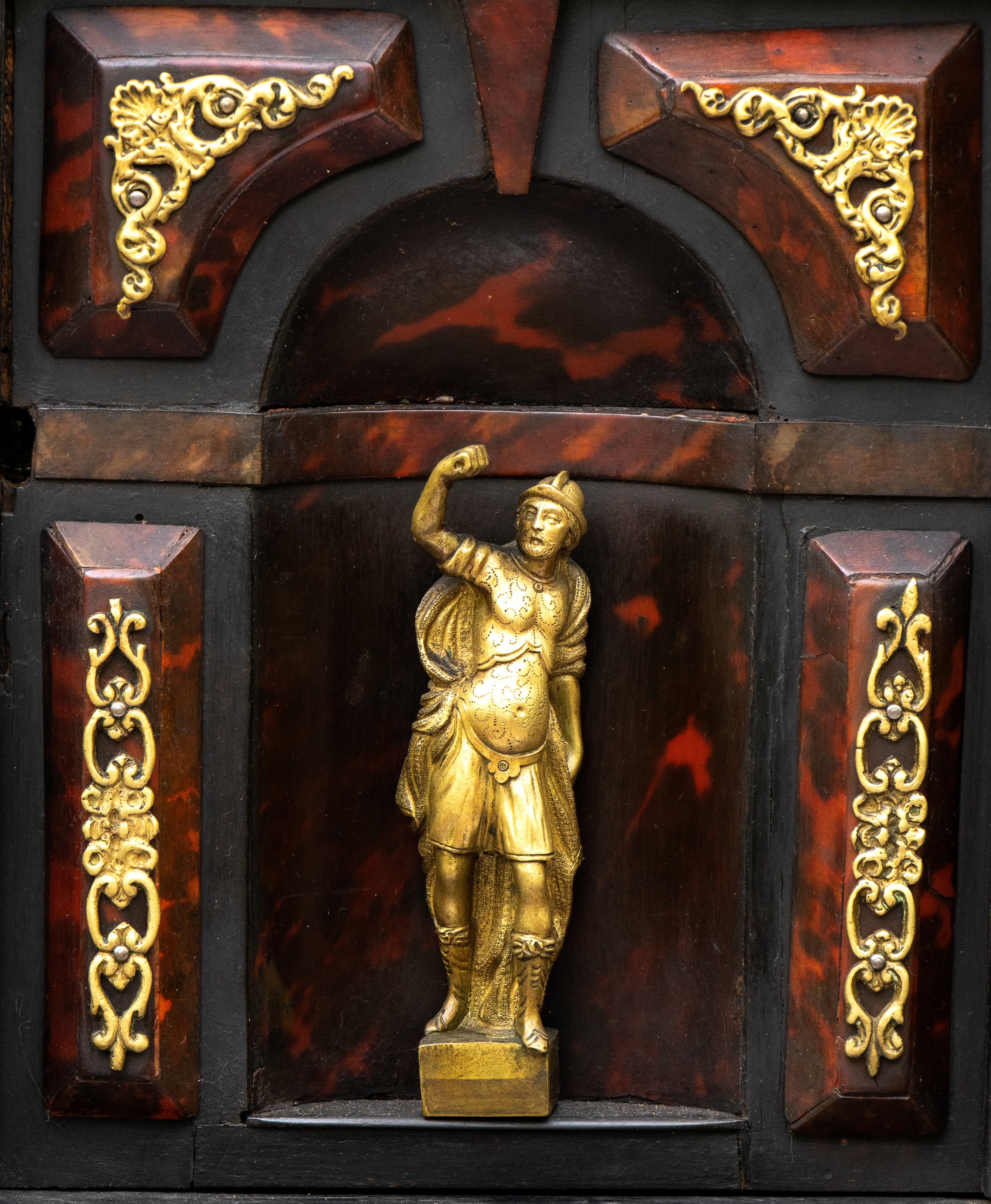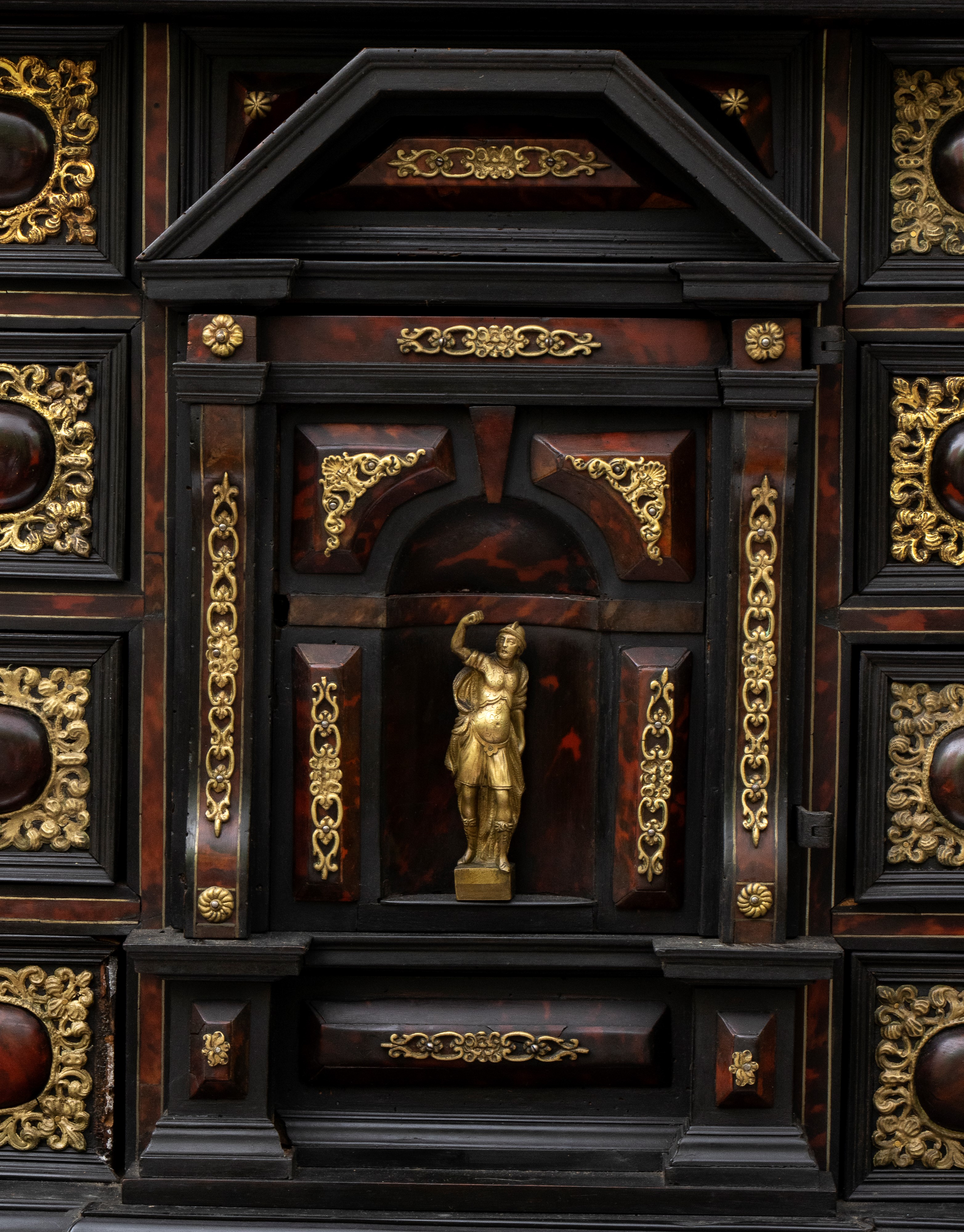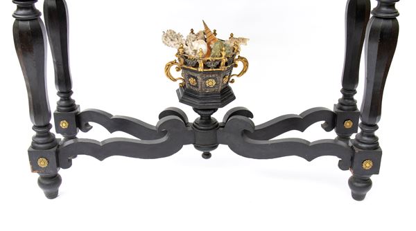 con struttura in pioppo, legno ebanizzato, tartaruga (hawksbill sea turtle, Eretmochelys imbricata, Cheloniidae) e inserti in bronzo, poggianti su basi finemente intagliate.