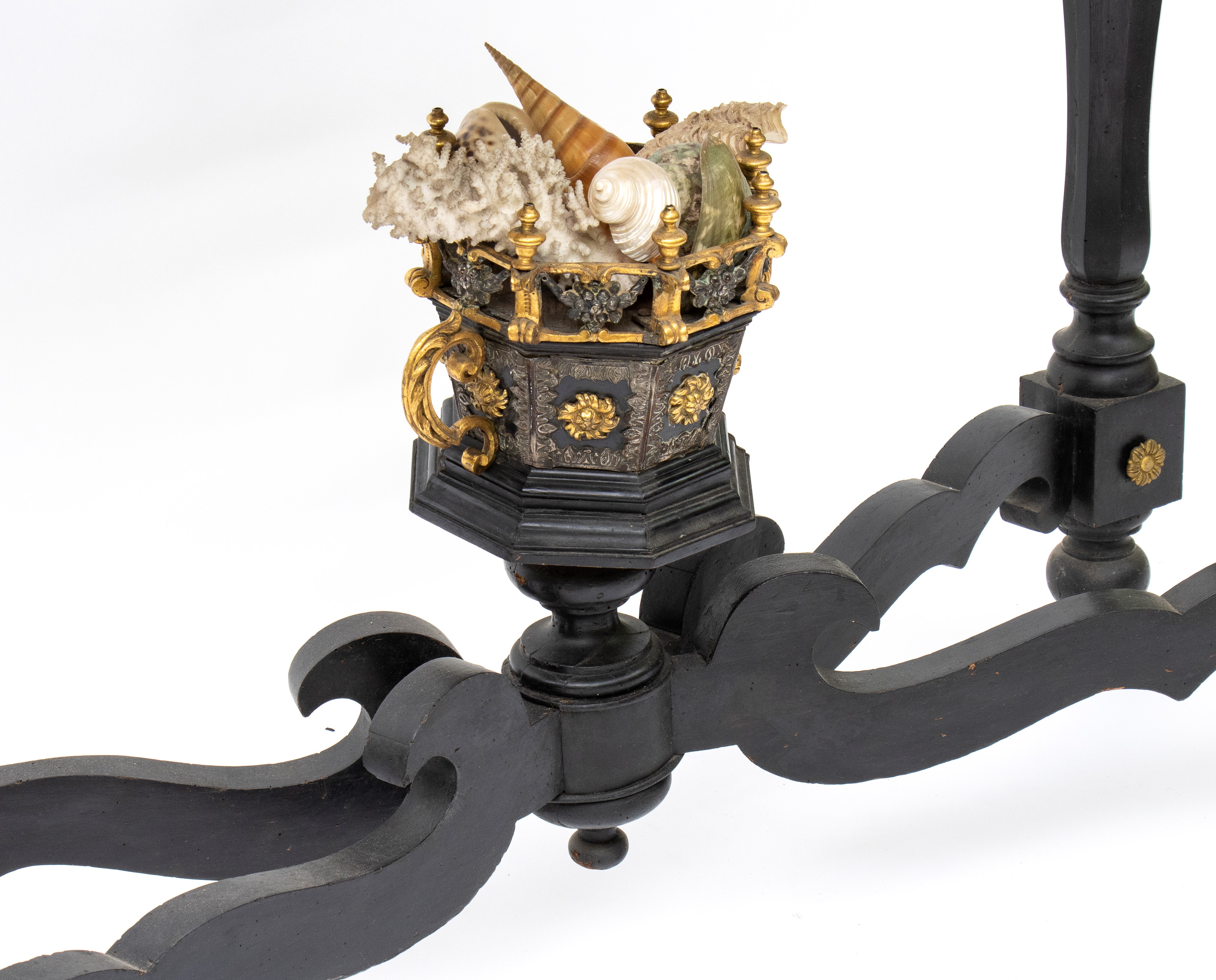 L’insieme decorativo gioca sul contrasto cromatico fra la profondità scura dell’ebano e la luminosità della tartaruga, con tocchi metallici che ne sottolineano i punti focali.