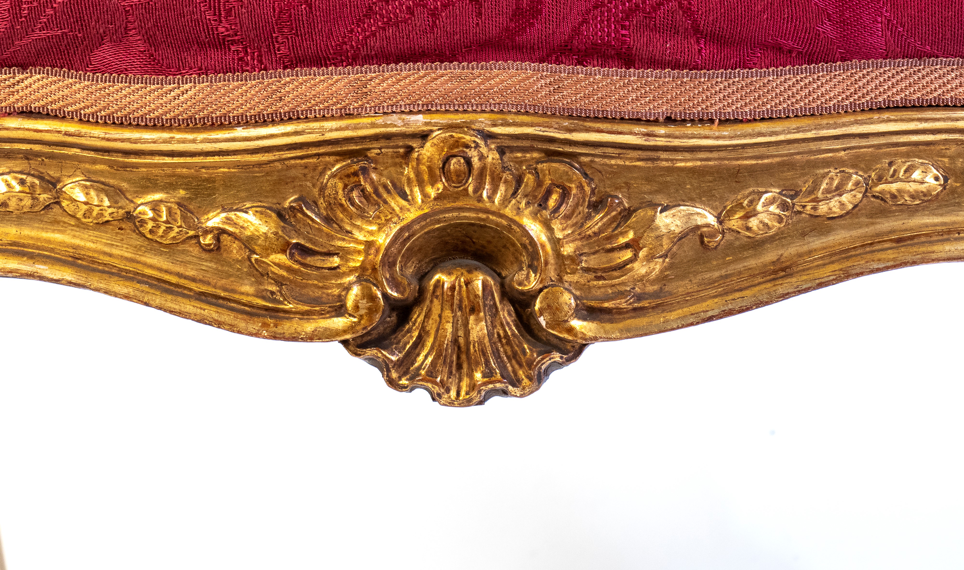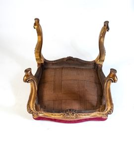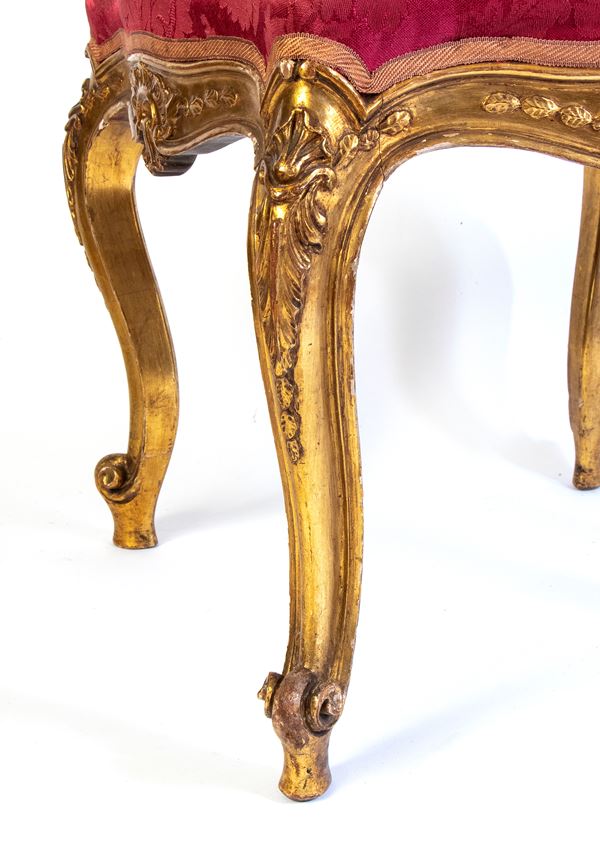 in legno intagliato e dorato, con gambe mosse a voluta e traversi scolpiti con motivi rocaille centrali.