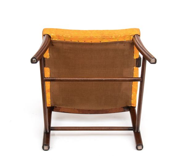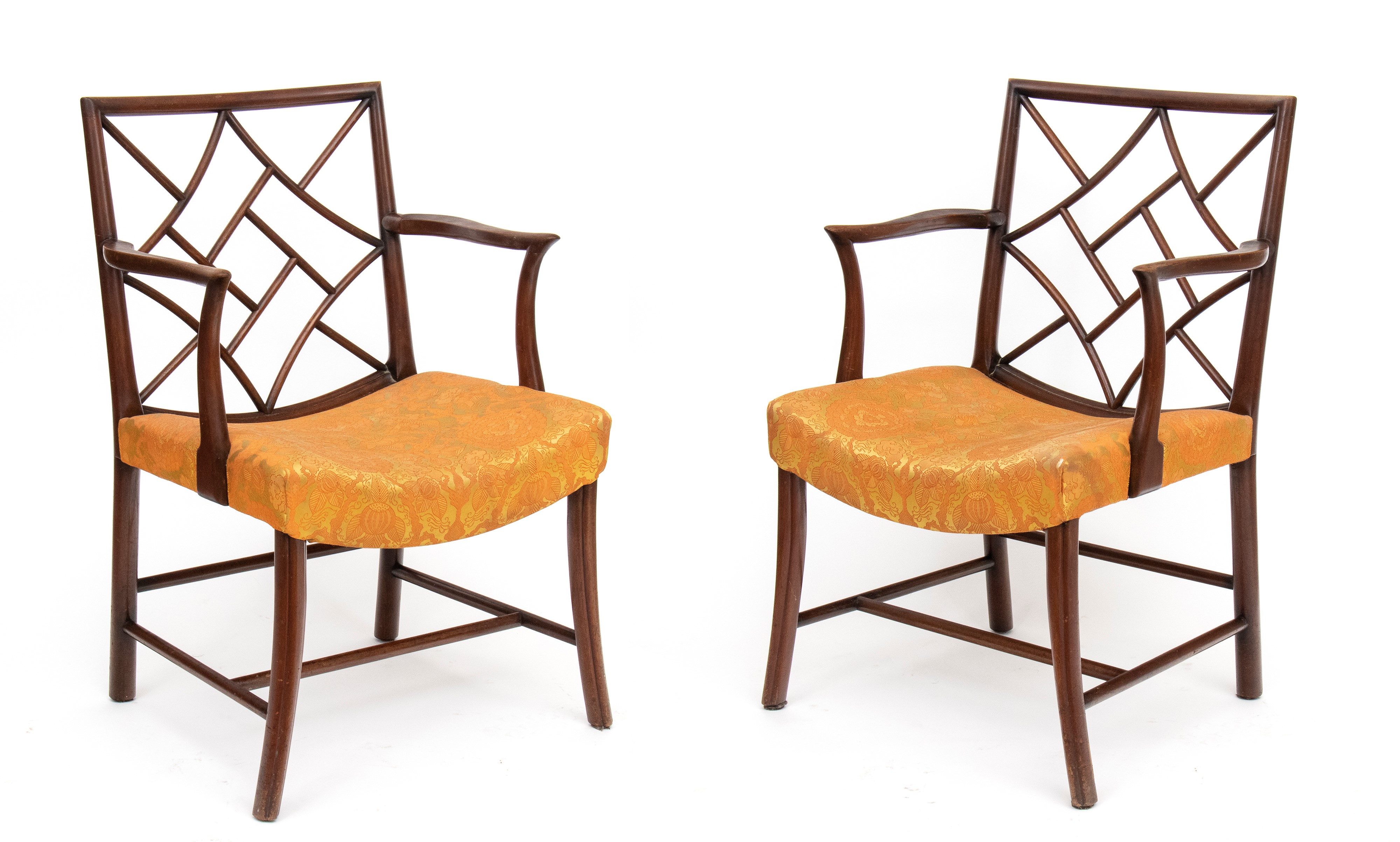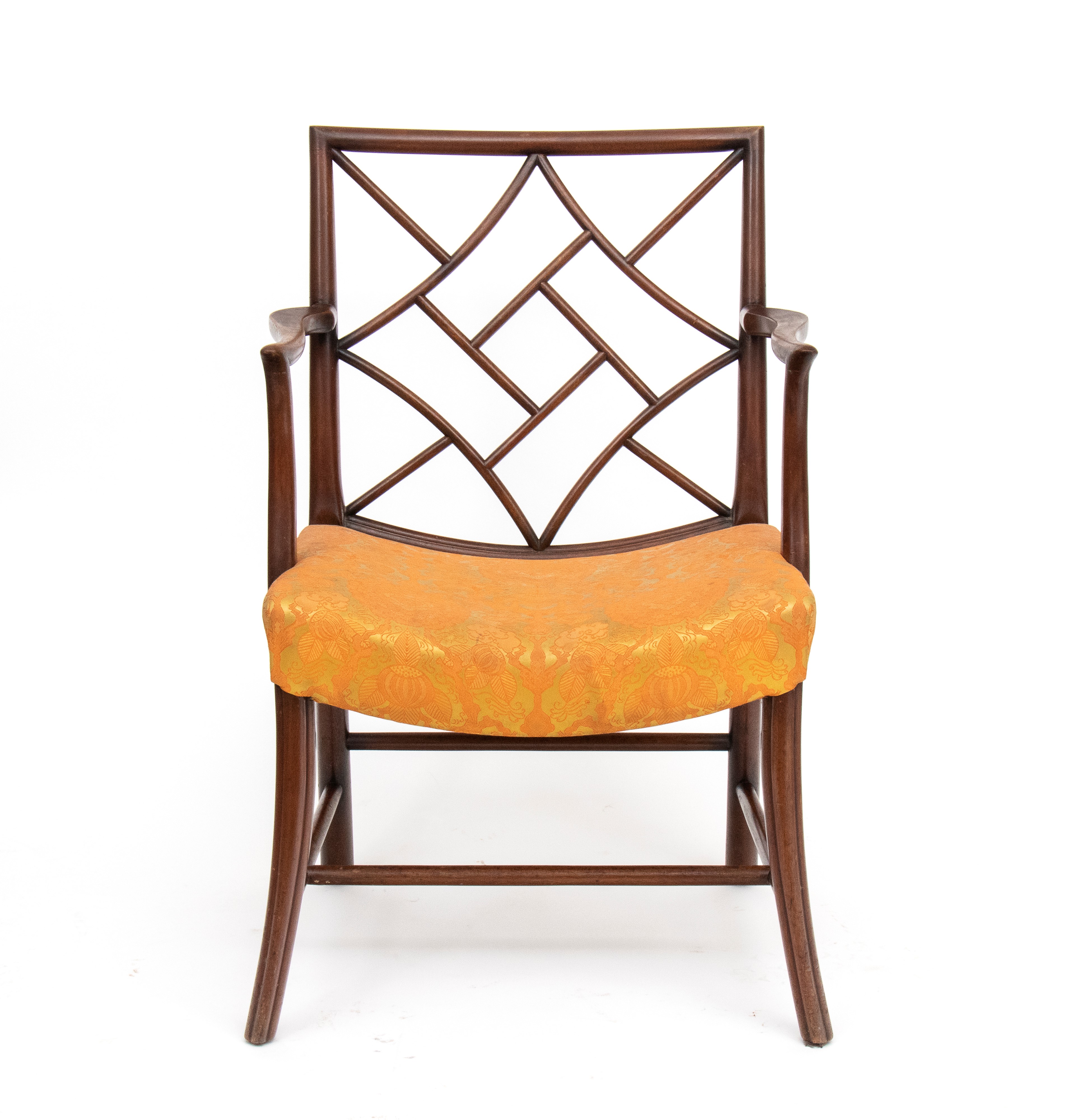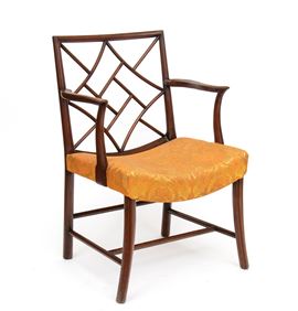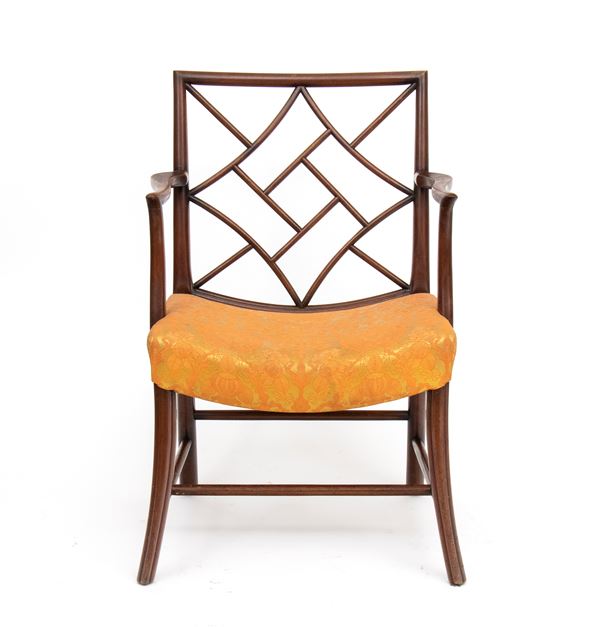 in mogano, con schienale geometrico a traforo incrociato di gusto cinese, seduta incurvata imbottita. Braccioli mossi e gambe arcuate, con traverse di rinforzo inferiori.