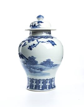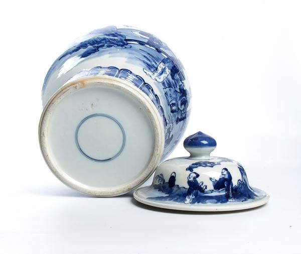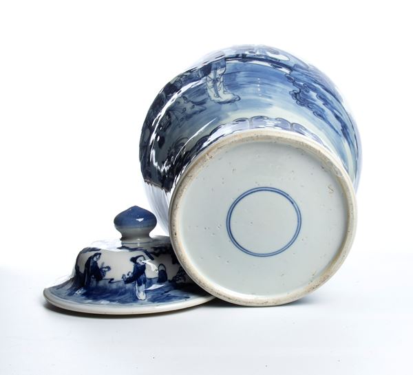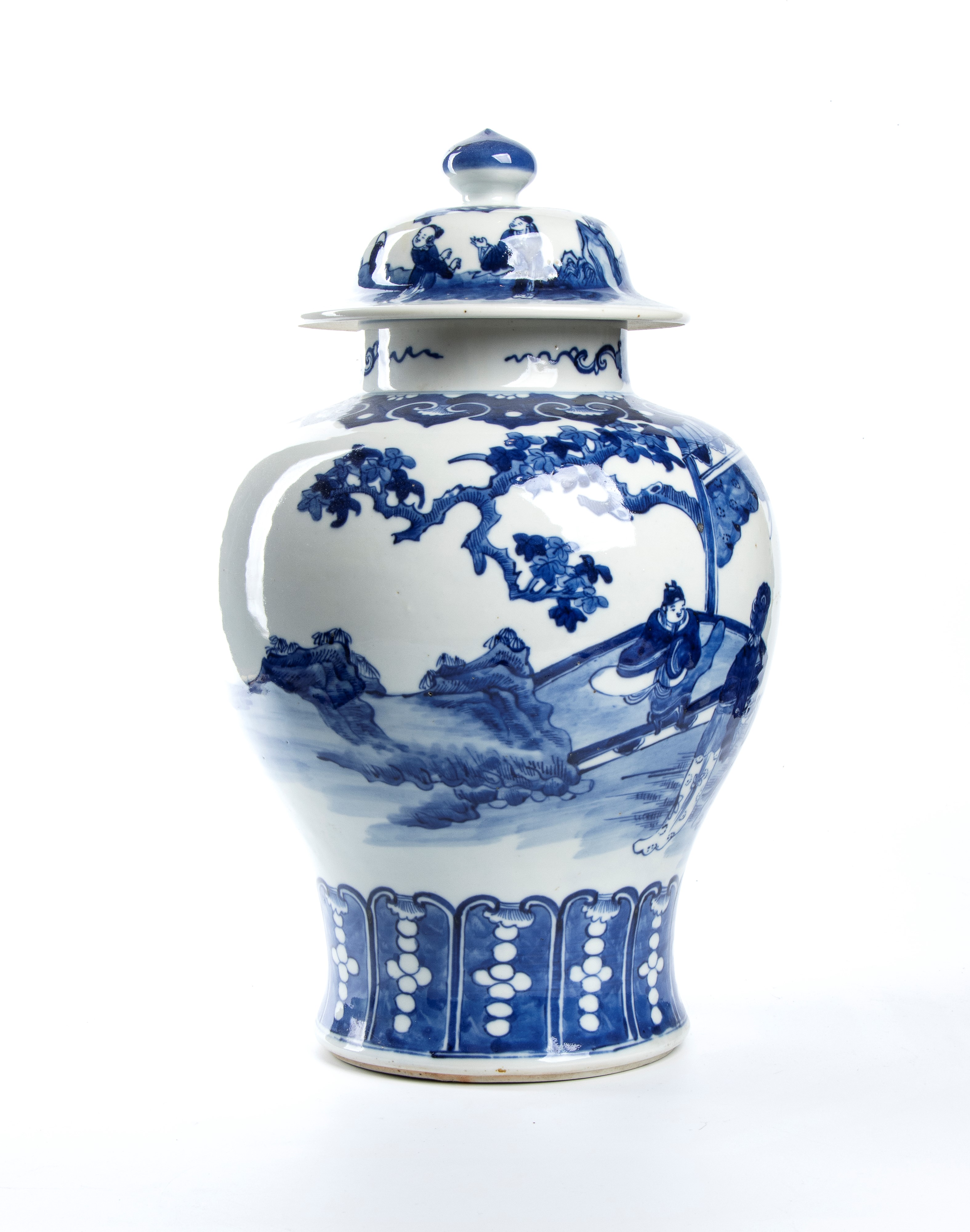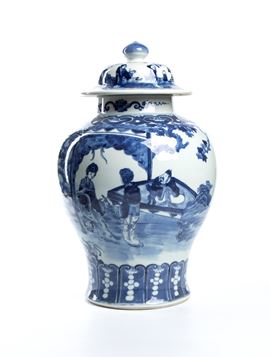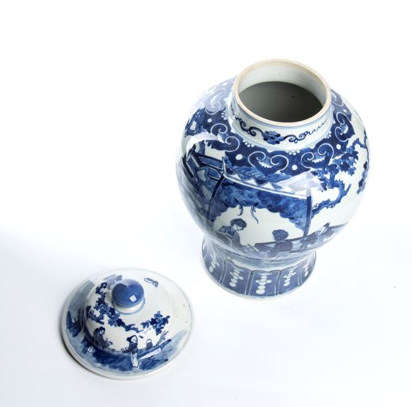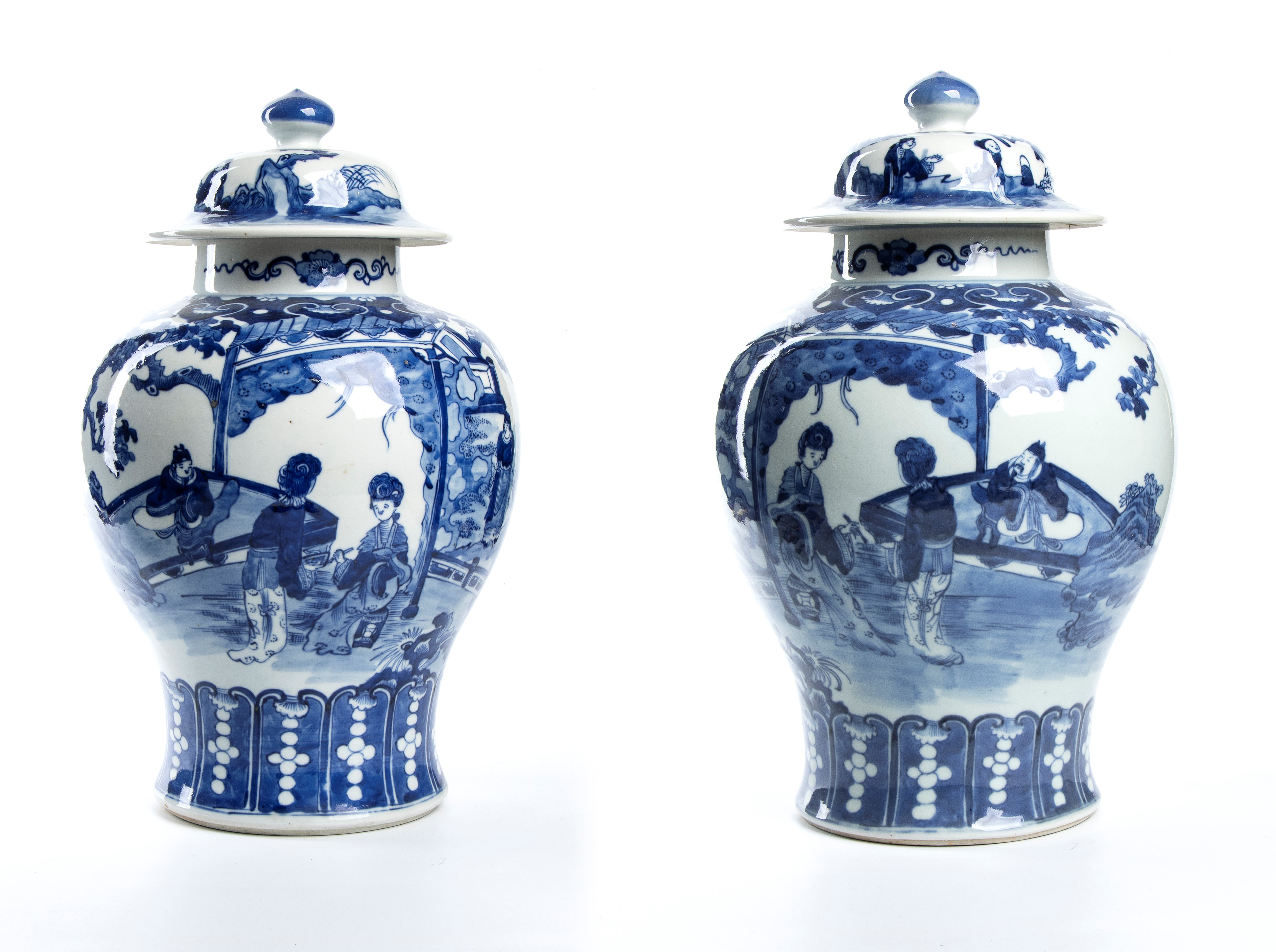 nei toni del blu su fondo bianco, decorati con immagini di nobili dame nei cortili esterni, circondate da un bordo di disegni geometrici intorno al collo e nella parte inferiore del vaso uno steccato. Entrambi i coperchi hanno terminali a forma di goccia.