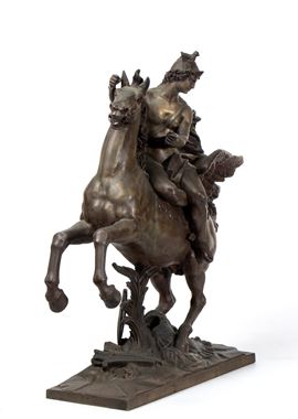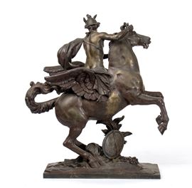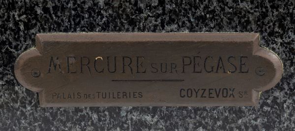 copia dell'opera di Antoine Coysevox (1640-1720) realizzata nel 1701. Raffinata fusione in bronzo raffigurante Mercurio, dio del commercio e messaggero degli dei, in sella a Pegaso, cavallo alato simbolo di velocità e ispirazione. Il modello originale fu commissionato da Luigi XIV per il giardino delle Tuileries. Coysevox fu scultore ufficiale del Re Sole.