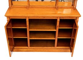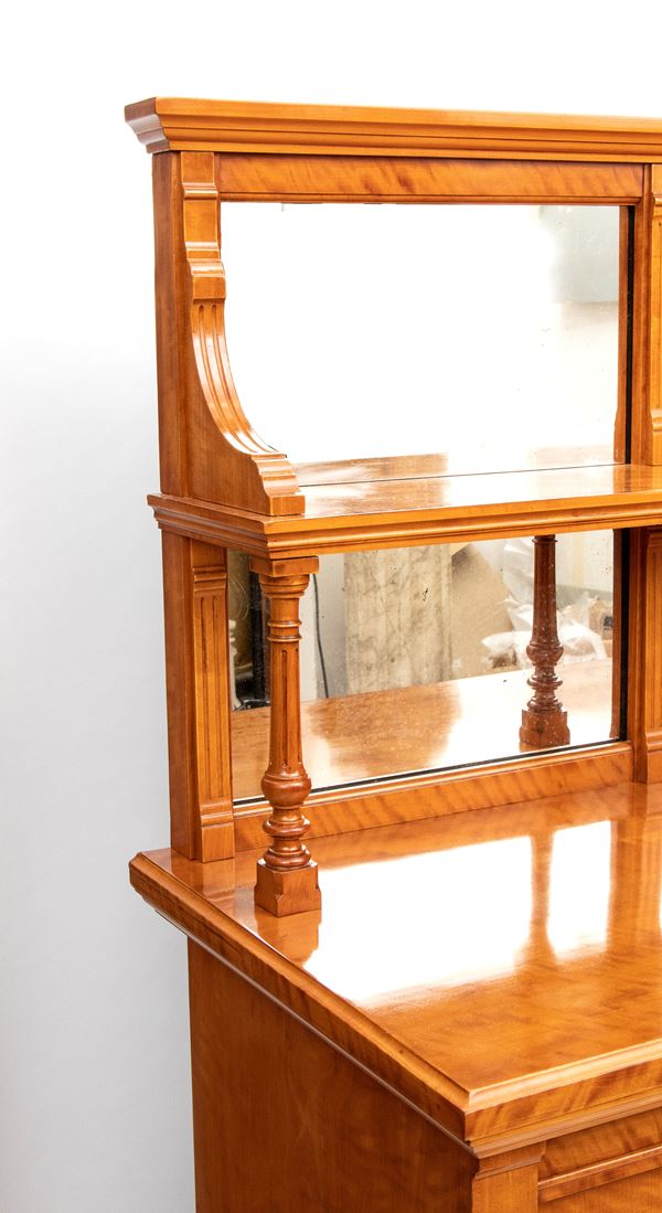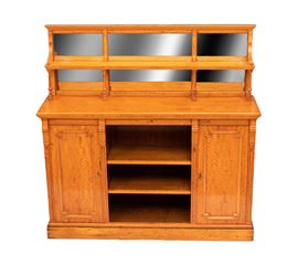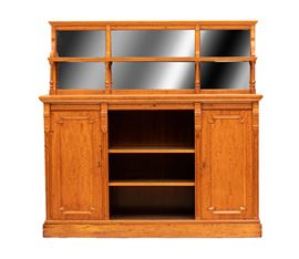 fine periodo Vittoriano, mobile a due sportelli laterali e vano centrale a ripiani. L'alzata, sorretta da colonnine tornite, ha un fondo a specchi originali.