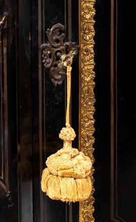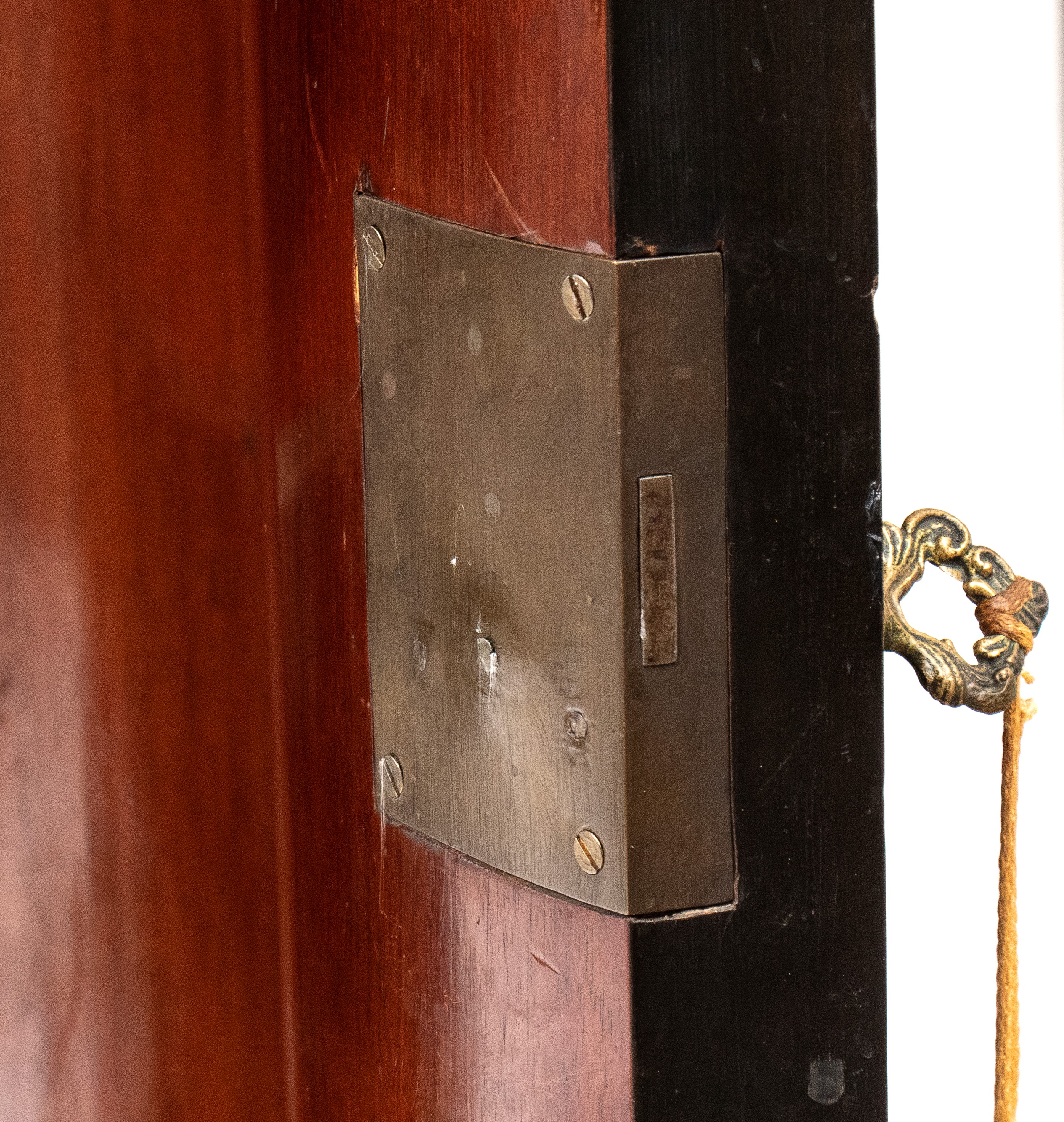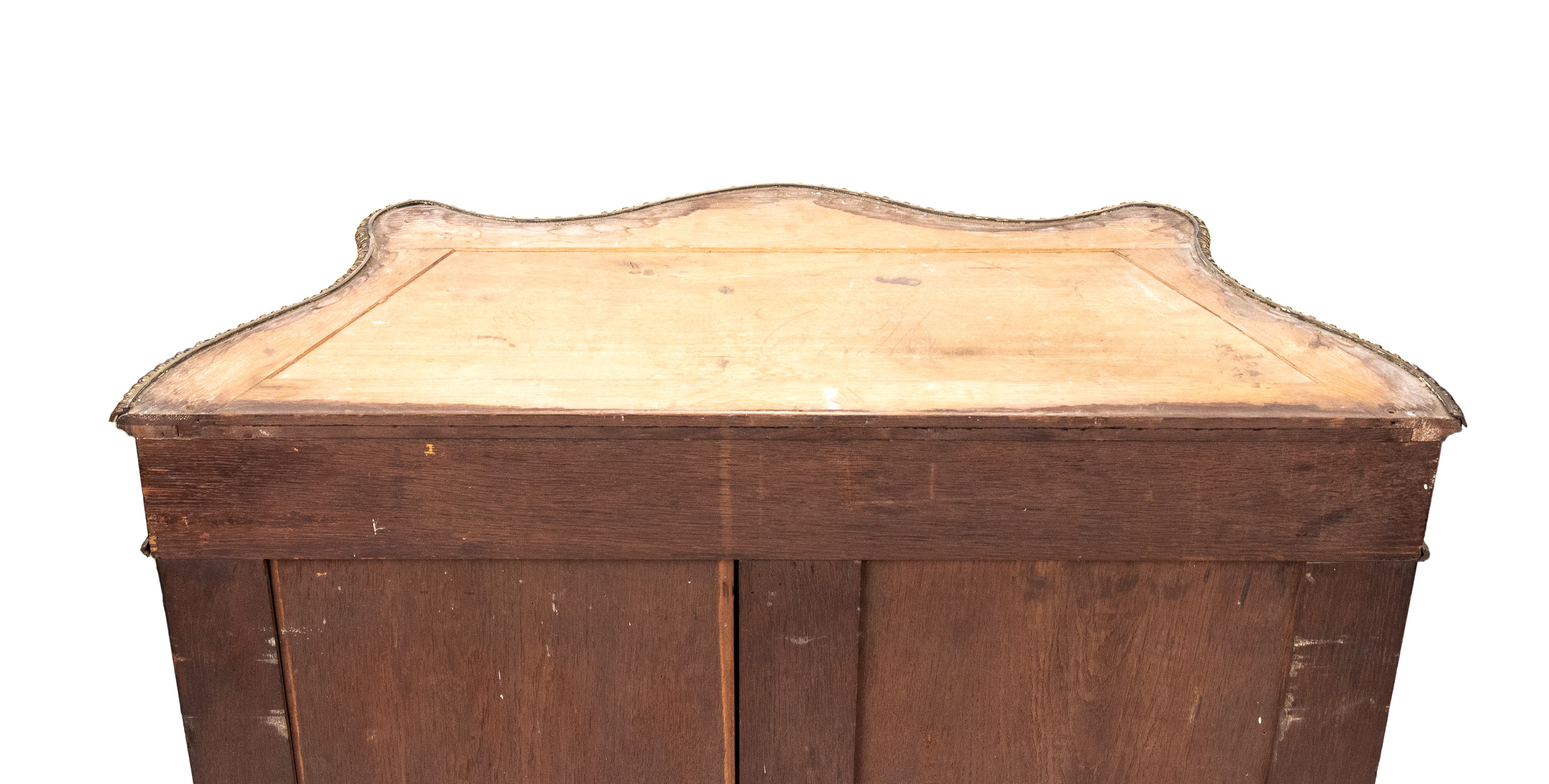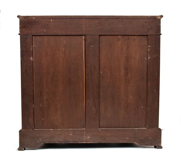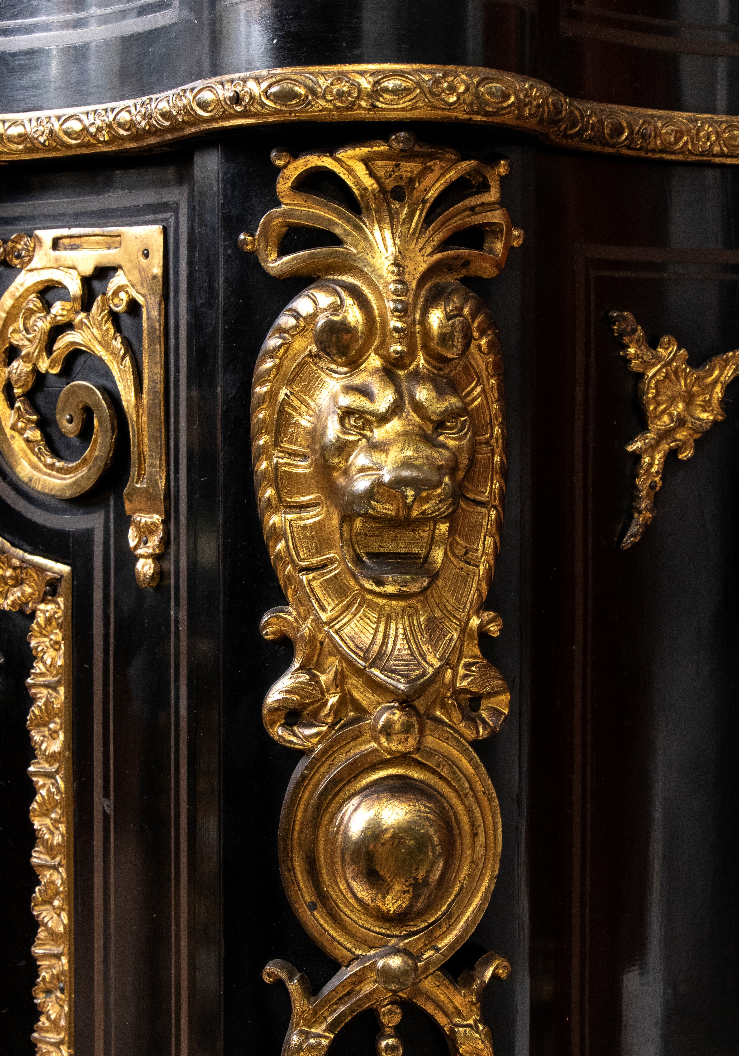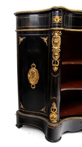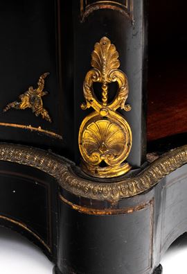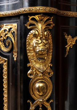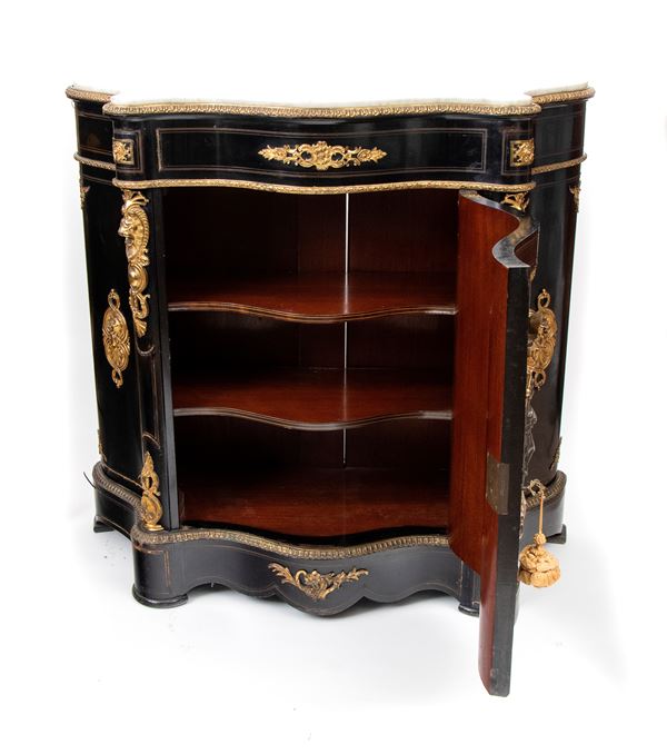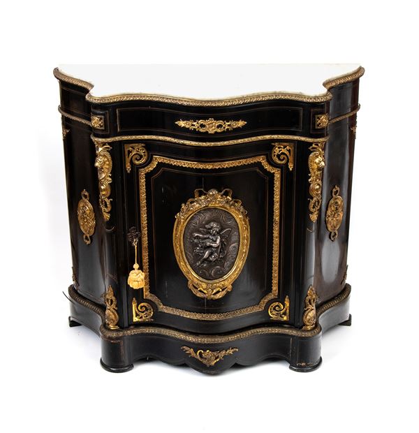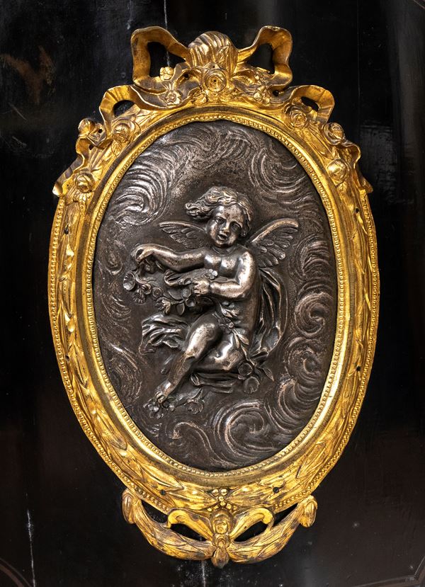 struttura mossa a balestra in legno ebanizzato con applicazioni in bronzo dorato, montature cesellate vegetali e prospetto mosso. Al centro del fronte è inserito un medaglione ovale a rilievo raffigurante putto con ghirlanda. Il cabinet presenta decori su tutto il perimetro, ricche modanature e fregi.