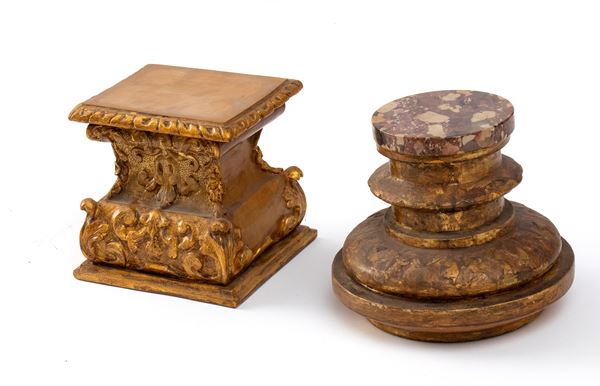 uno di sezione quadrata intagliato a motivi vegetali, l'altro di forma tondeggiante con piccolo marmo tondo sul piano.