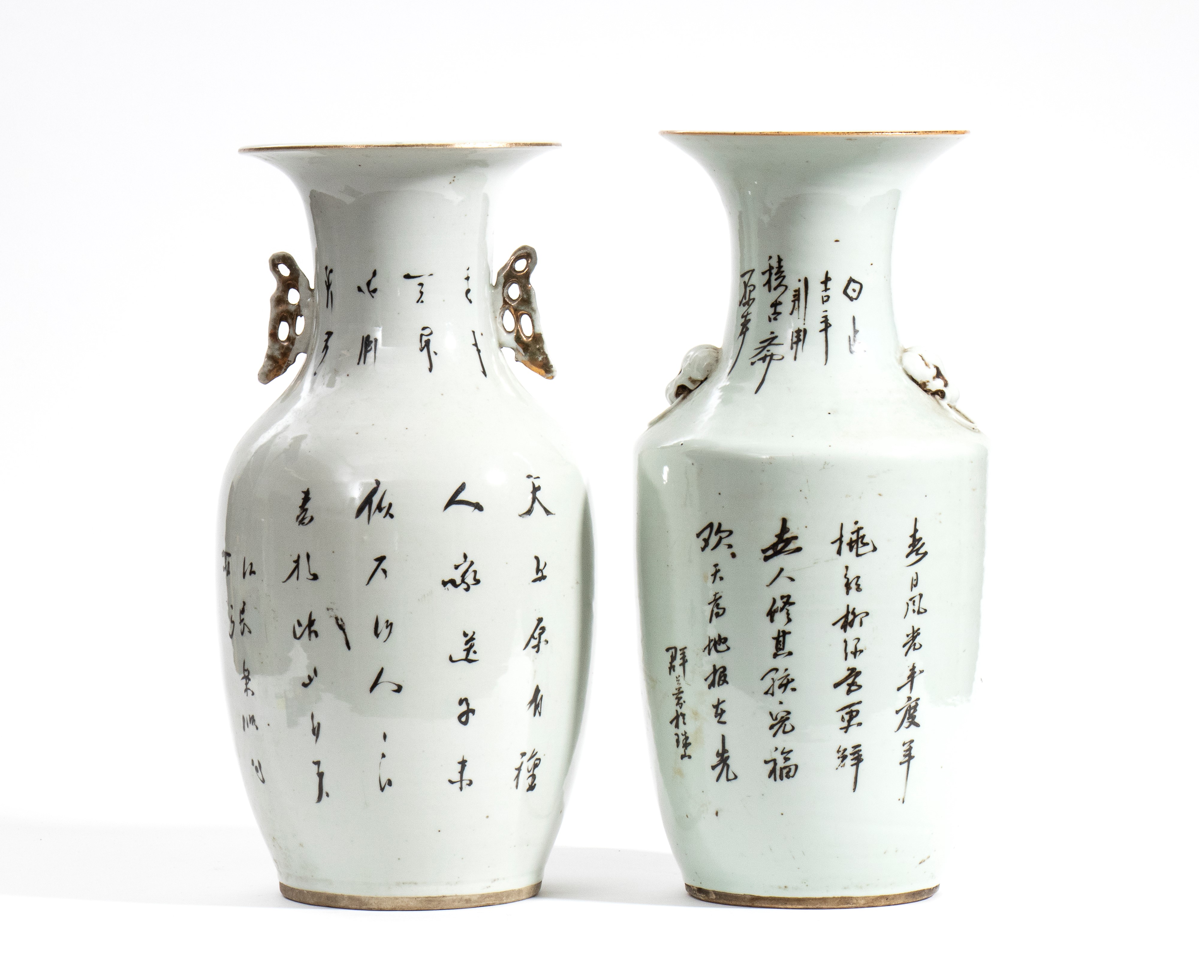 I vasi, di forma balustre con bocca svasata e piccole anse laterali traforate a forma di pipistrello, presentano su un lato scene di genere raffiguranti eleganti dame e bambini in giardino tra alberi fioriti, rocce e recinti, mentre sull’altro lato recano poesie in cinese in caratteri calligrafici disposti in colonne verticali.