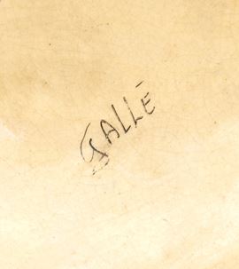 Ceramica invetriata con decorazione policroma, marca al battente « Gallé / St. Honoré-les-Bains ». Altezza circa 24 cm ciascuno. Francia, fine XIX – inizio XX secolo. Elegantemente modellati a figura di leone rampante, ciascuno reggente con le zampe anteriori uno scudo o torretta, i due candelieri presentano un fondo crema invetriato, con dettagli in blu/grigio smoky nell’animalità e nella criniera, su basamento sagomato. Il segno al retro «Gallé / St. Honoré-les-Bains» testimonia la produzione della celebre fabbrica ceramica di Poterie de la Montagne a Saint-Honoré-les-Bains (Nièvre), attiva nell’Ottocento e fino al XX secolo.