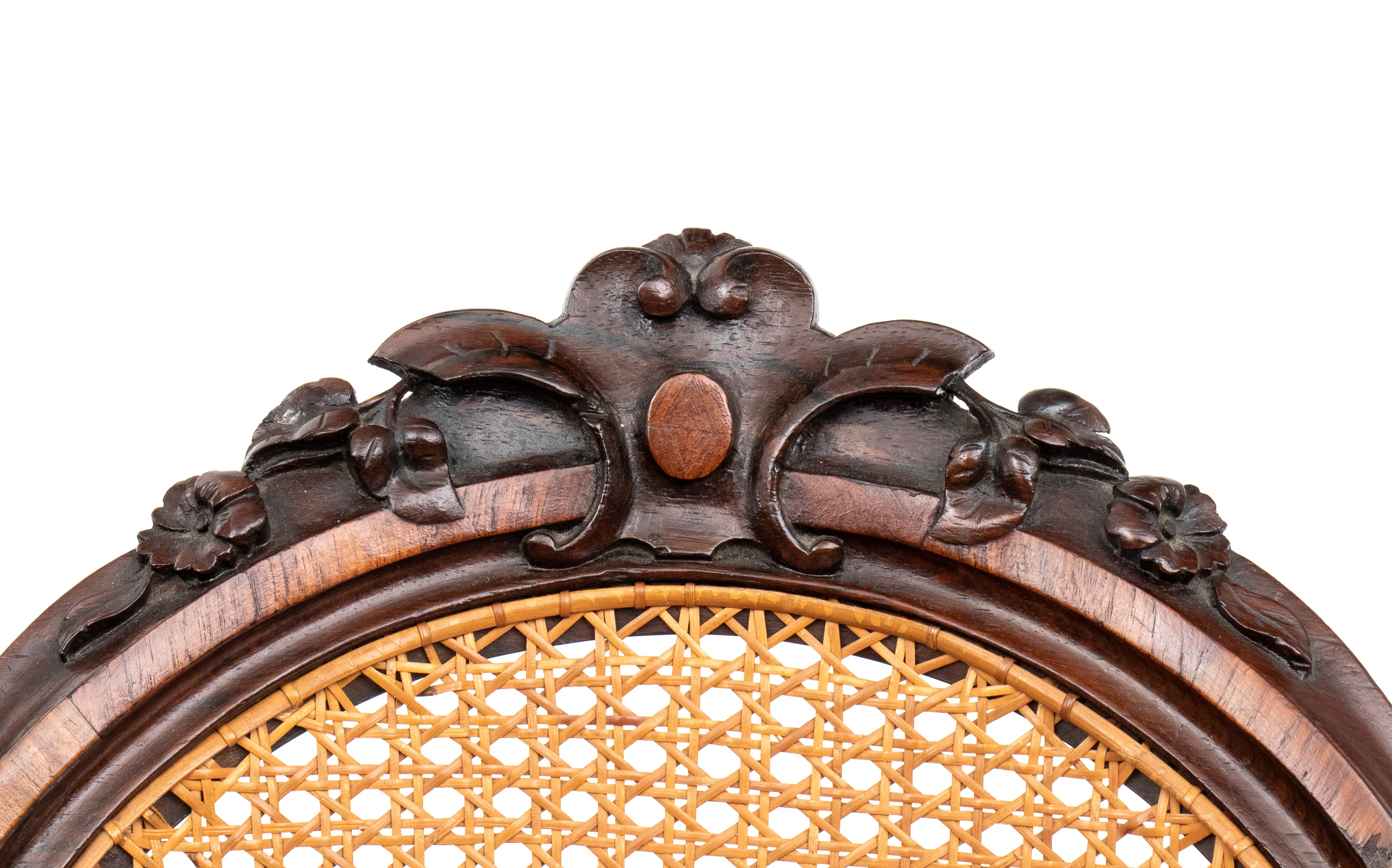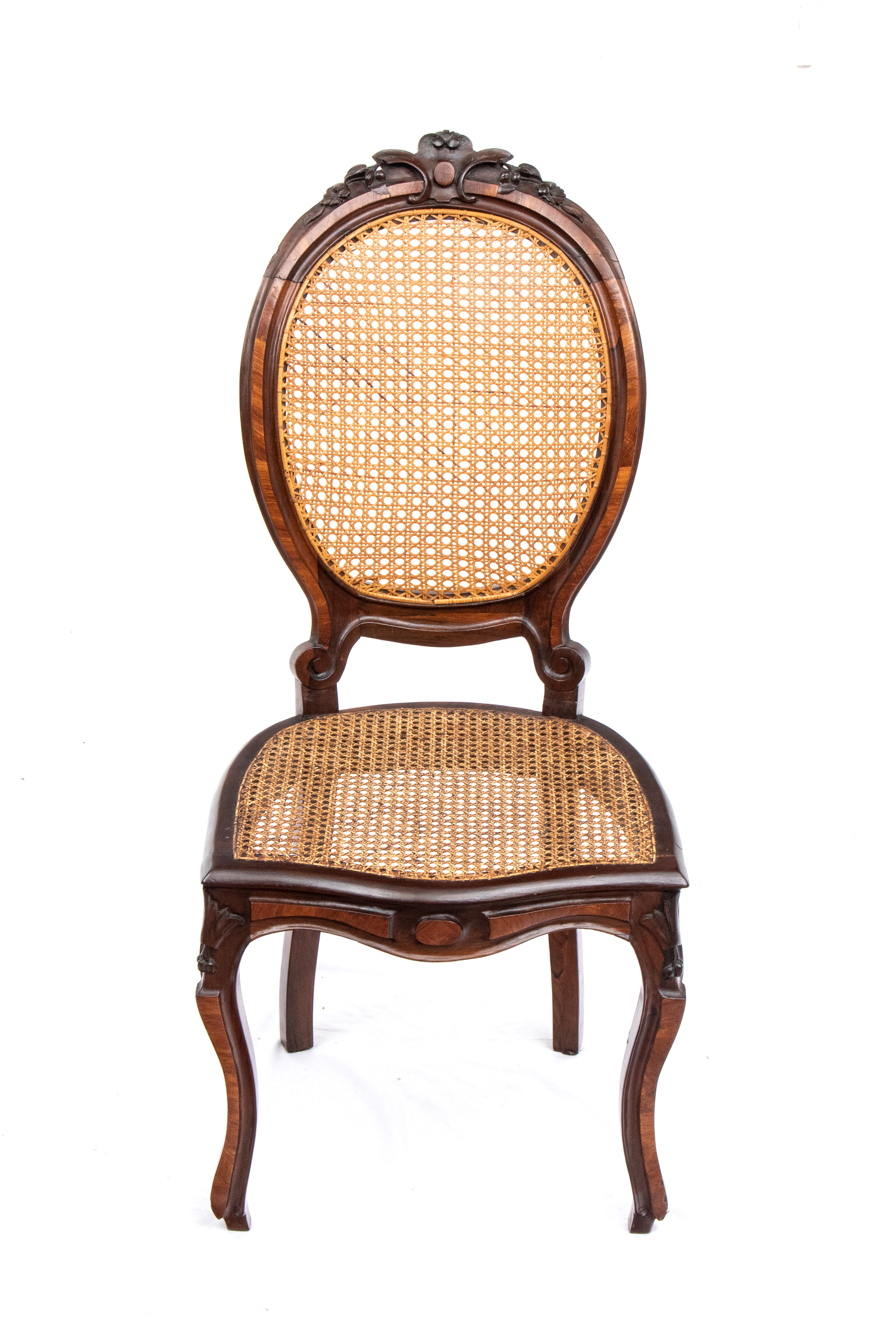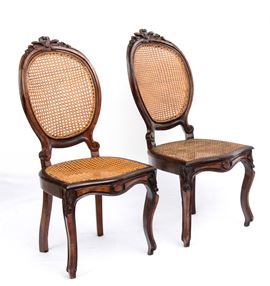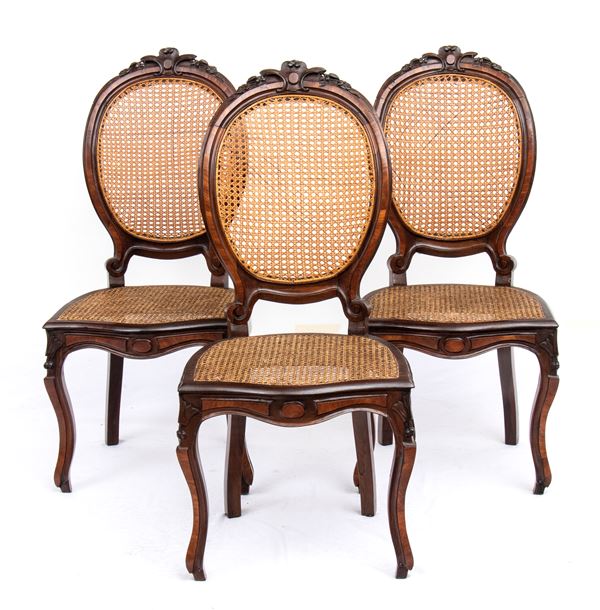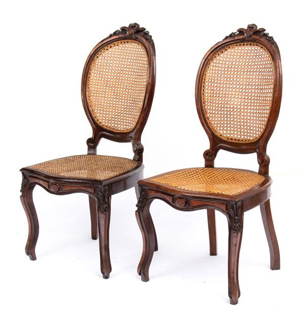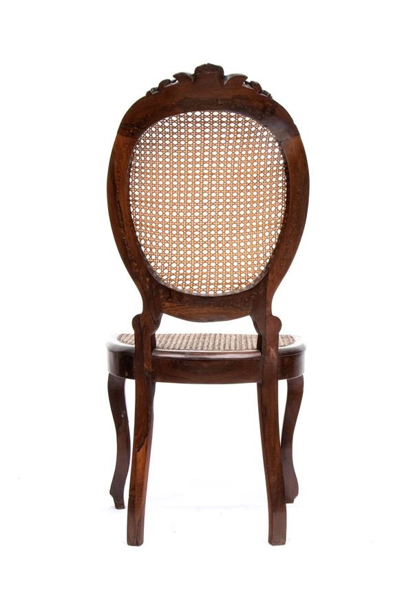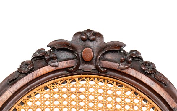 epoca Luigi Filippo in noce e intarsiate in bois de rose, schienale e seduta in paglia intrecciata a mano. Schienale a medaglione con cimasa intagliata a motivi floreali, gambe cabriolet.
