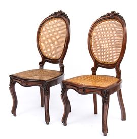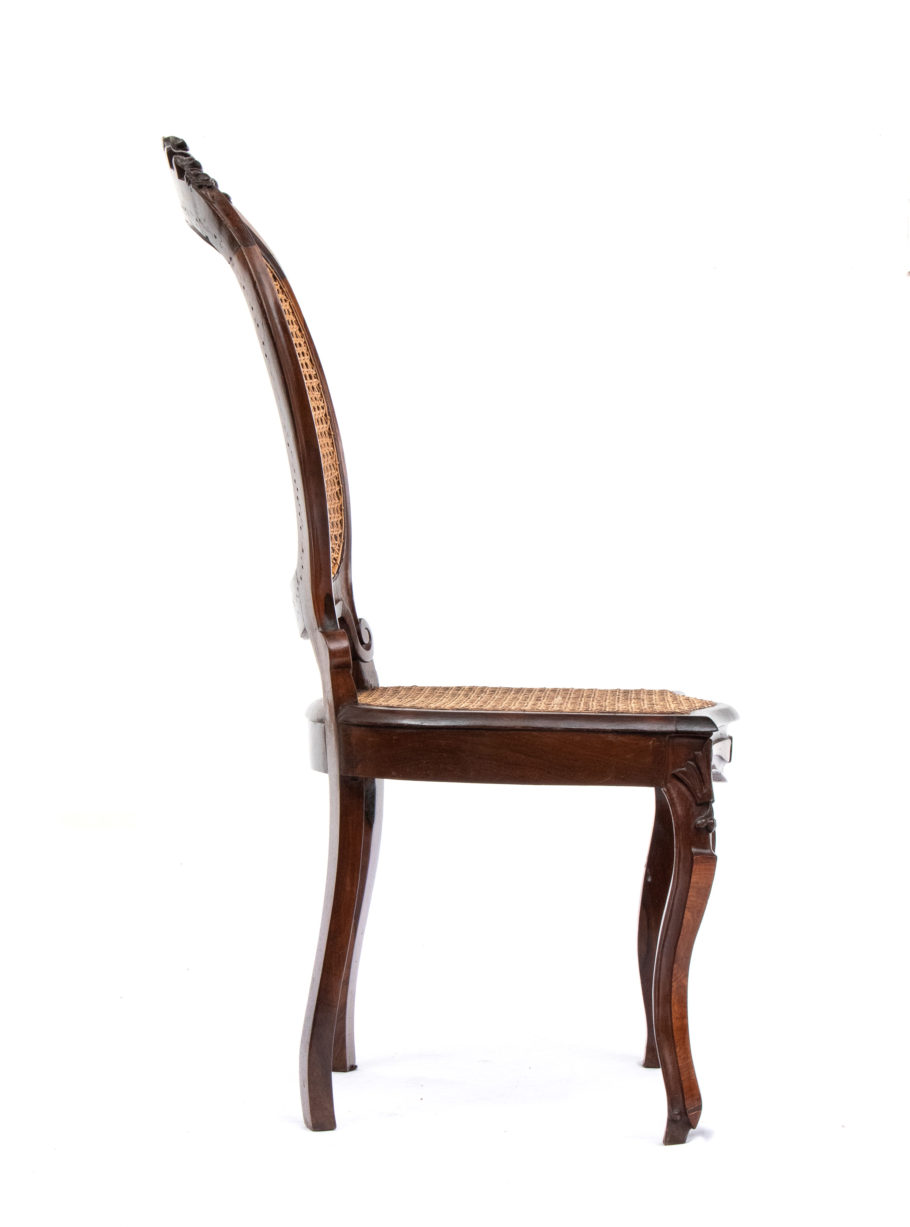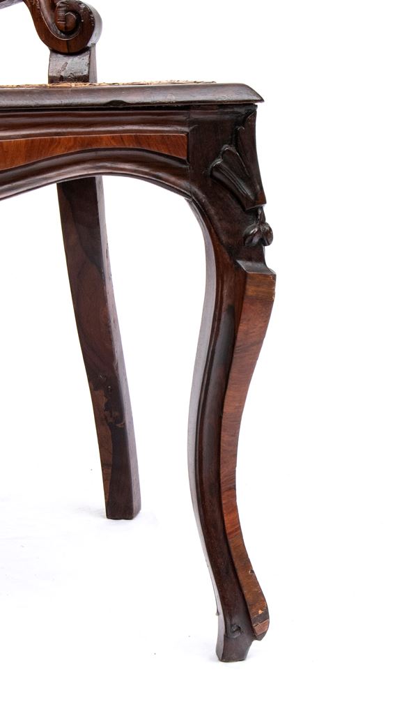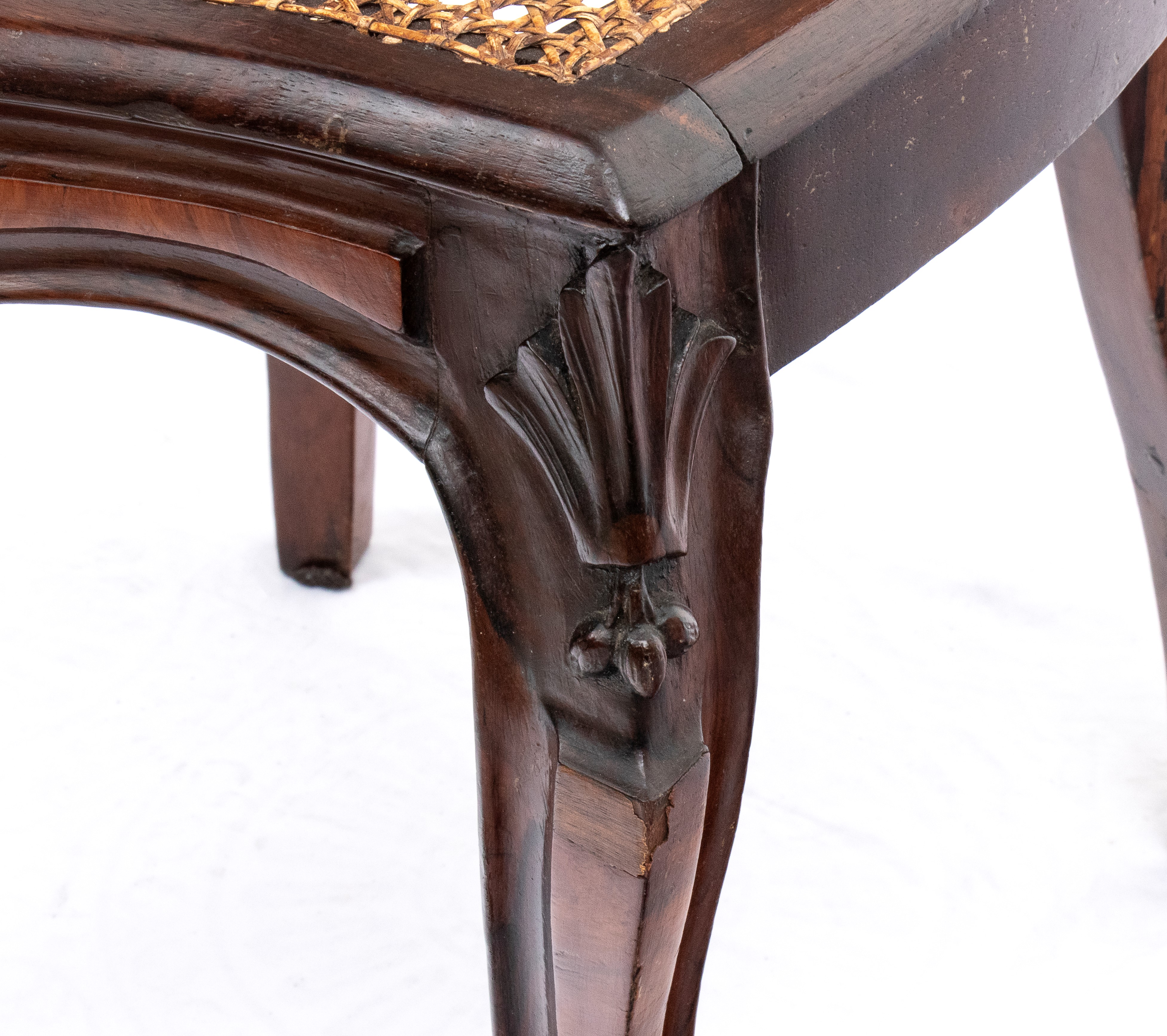 epoca Luigi Filippo in noce e intarsiate in bois de rose, schienale e seduta in paglia intrecciata a mano. Schienale a medaglione con cimasa intagliata a motivi floreali, gambe cabriolet.