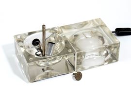 in metacrilato trasparente a forma di cubocon sfera centrale cava.