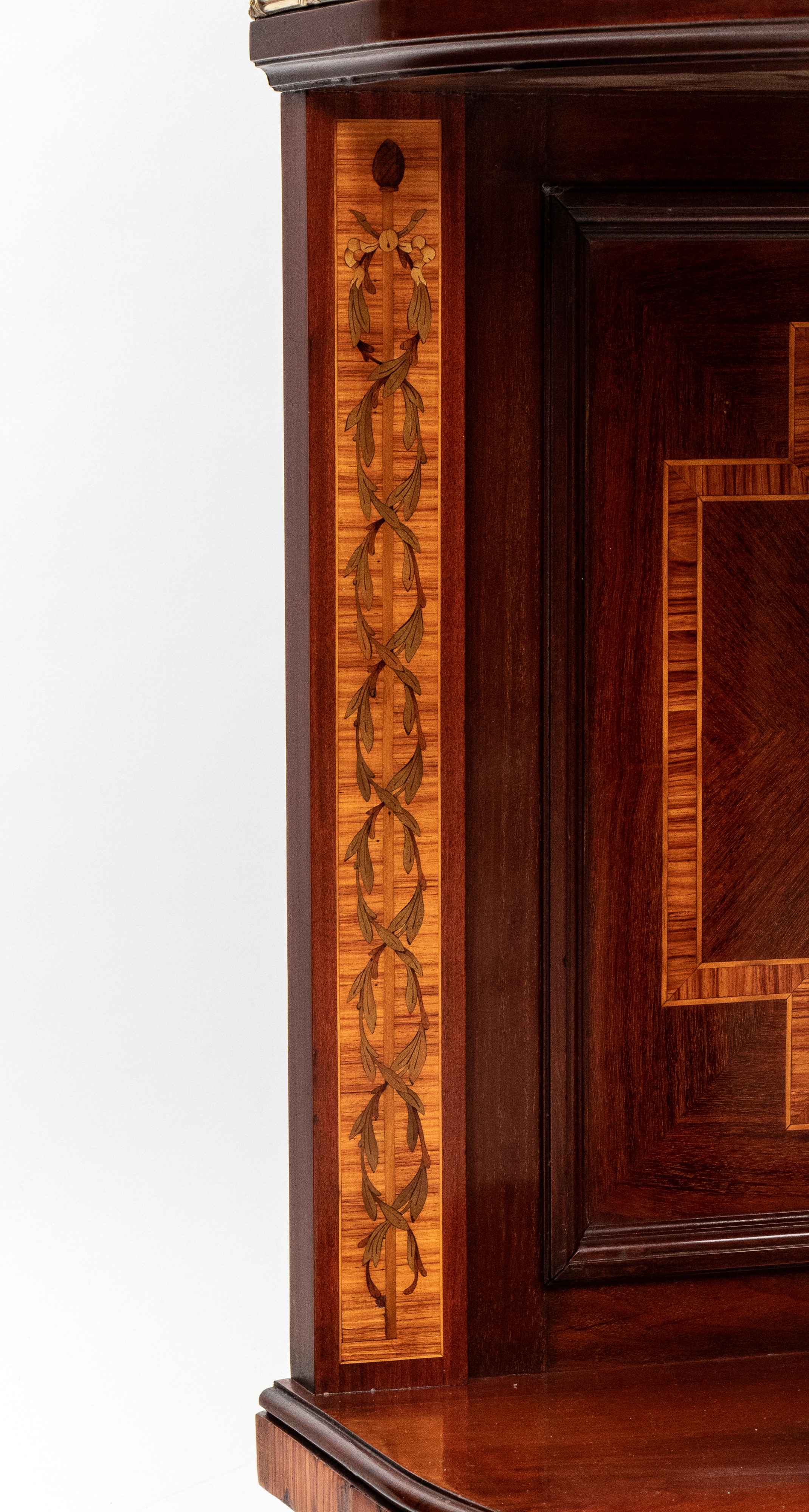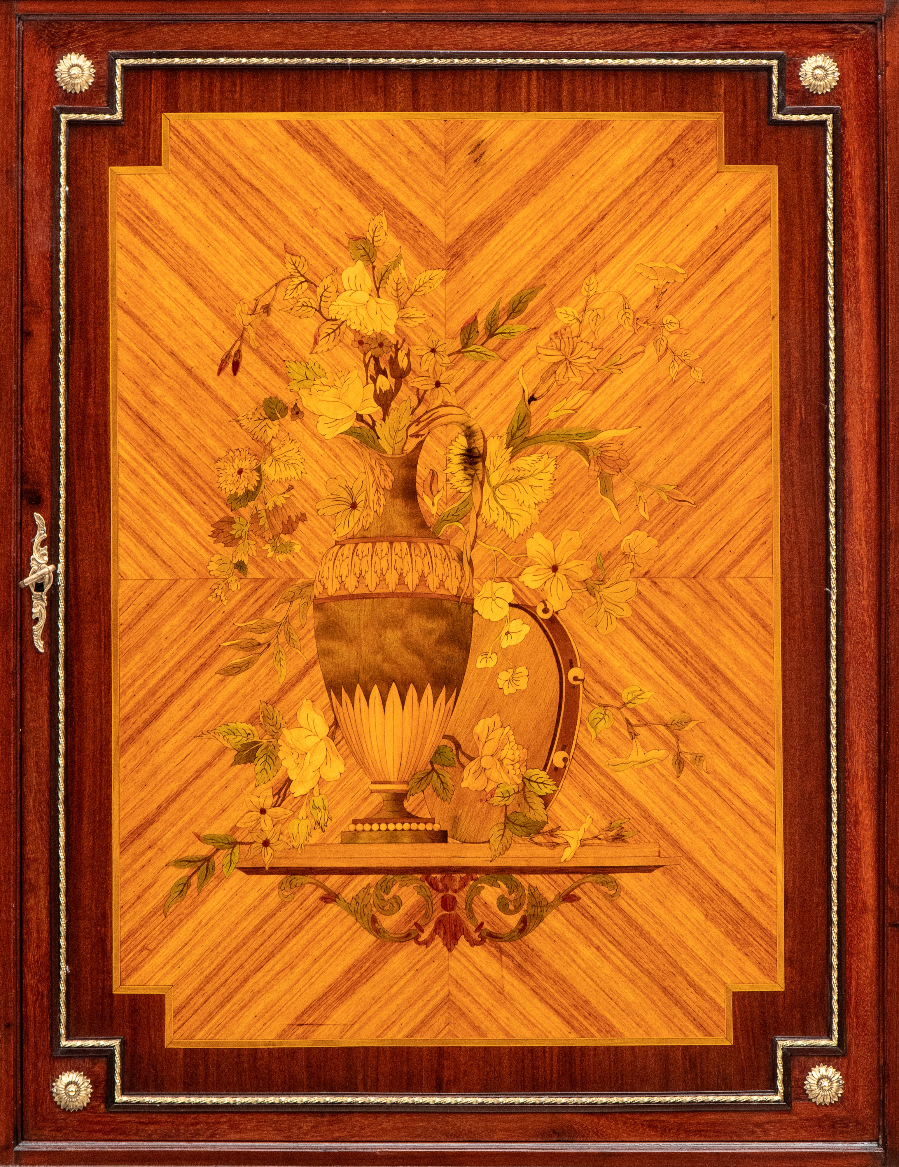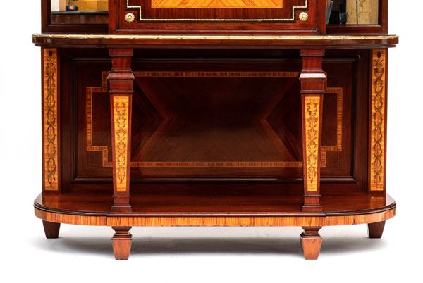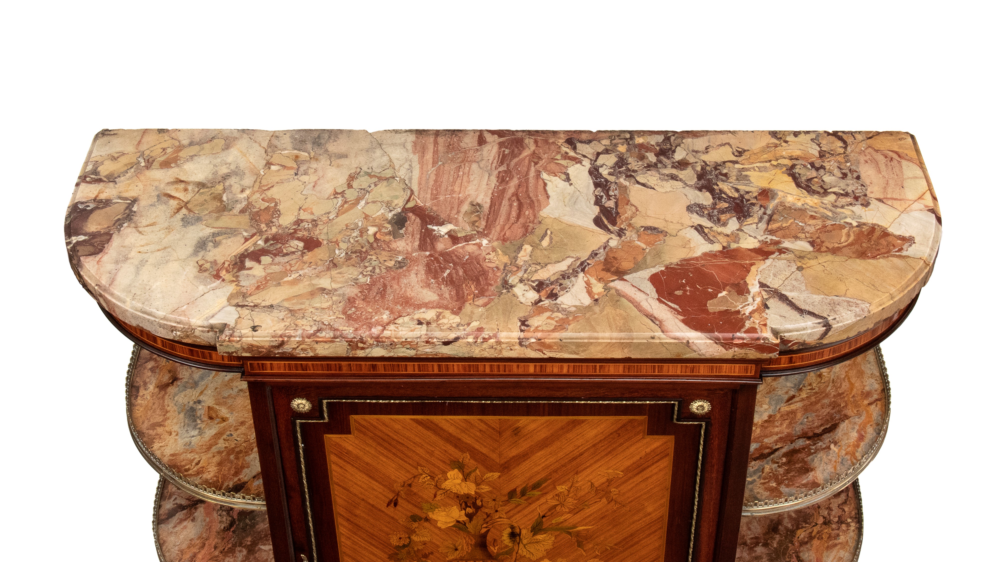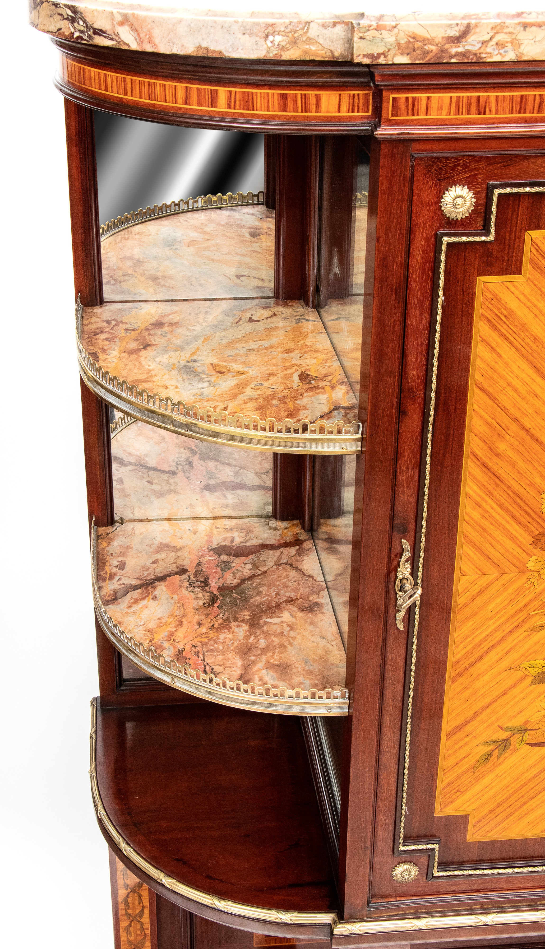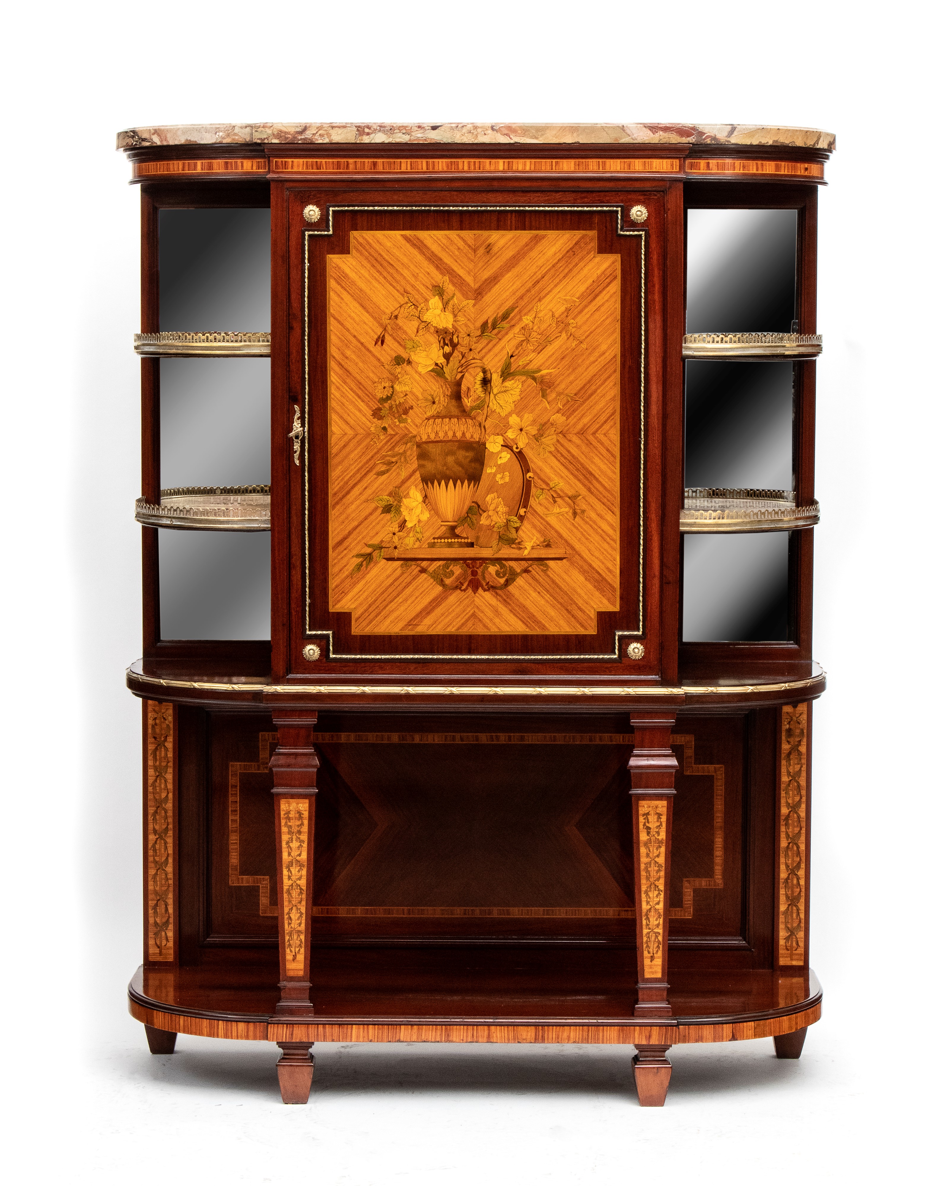 mobile "dessert" in bois de placage, con marqueterie floreale a motivi di vaso con fiori su fondo geometrico in bois de rose (Dalberga spp.) e bois de violette (Dalbergia cearensis, Ducke, 1925). La parte superiore con anta centrale decorata è affiancata da due vani a giorno con specchi e ripiani in marmo bordati da ringhierine in bronzo dorato. Piano in marmo breccia sagomato. Gambe scanalate e intarsiate, basamento con riserve geometriche, filettature in acero e finiture in bronzo dorato. Sulla fodera e sul piano superiore timbri a fuoco della Maison.