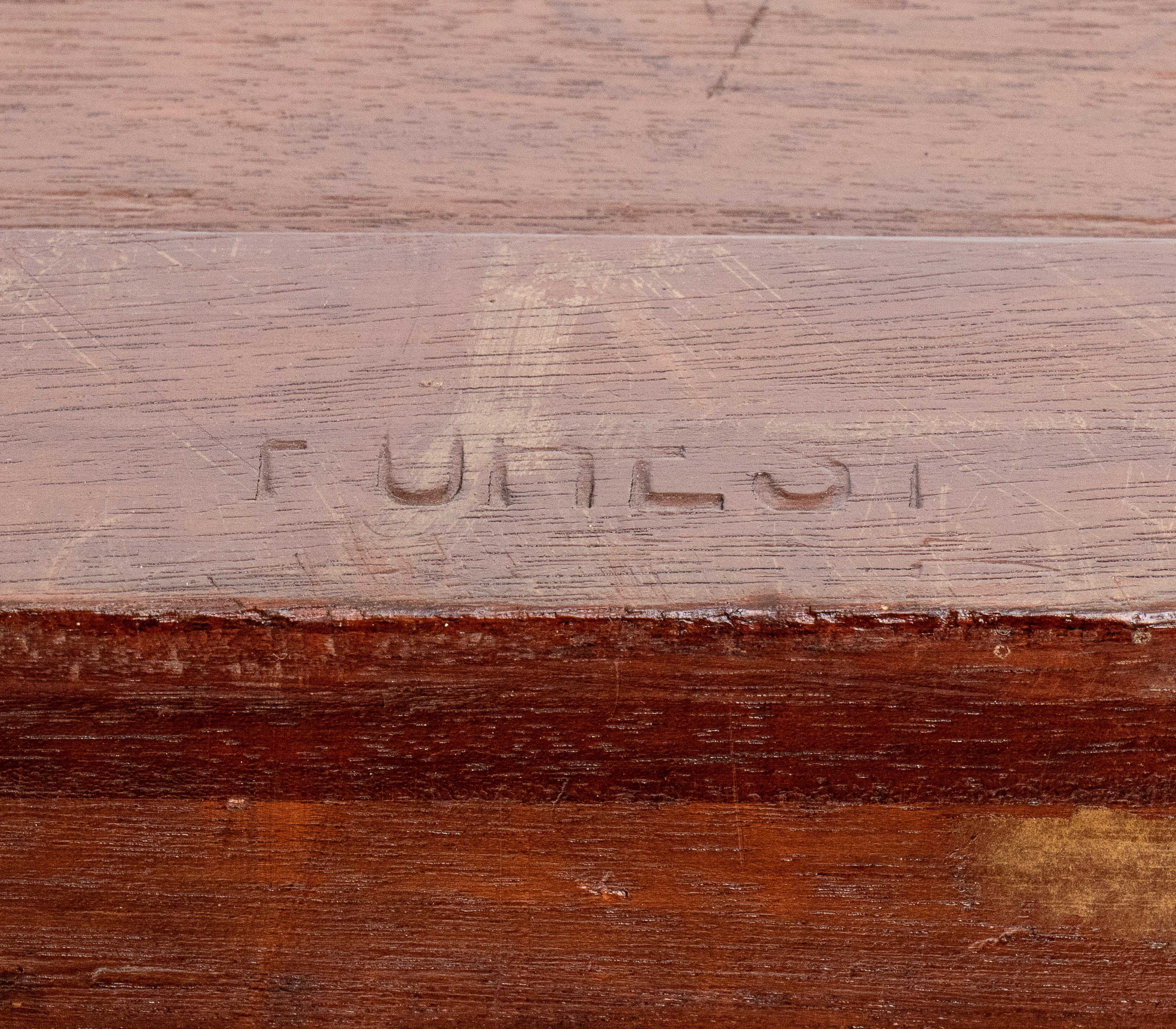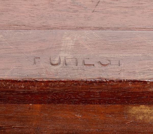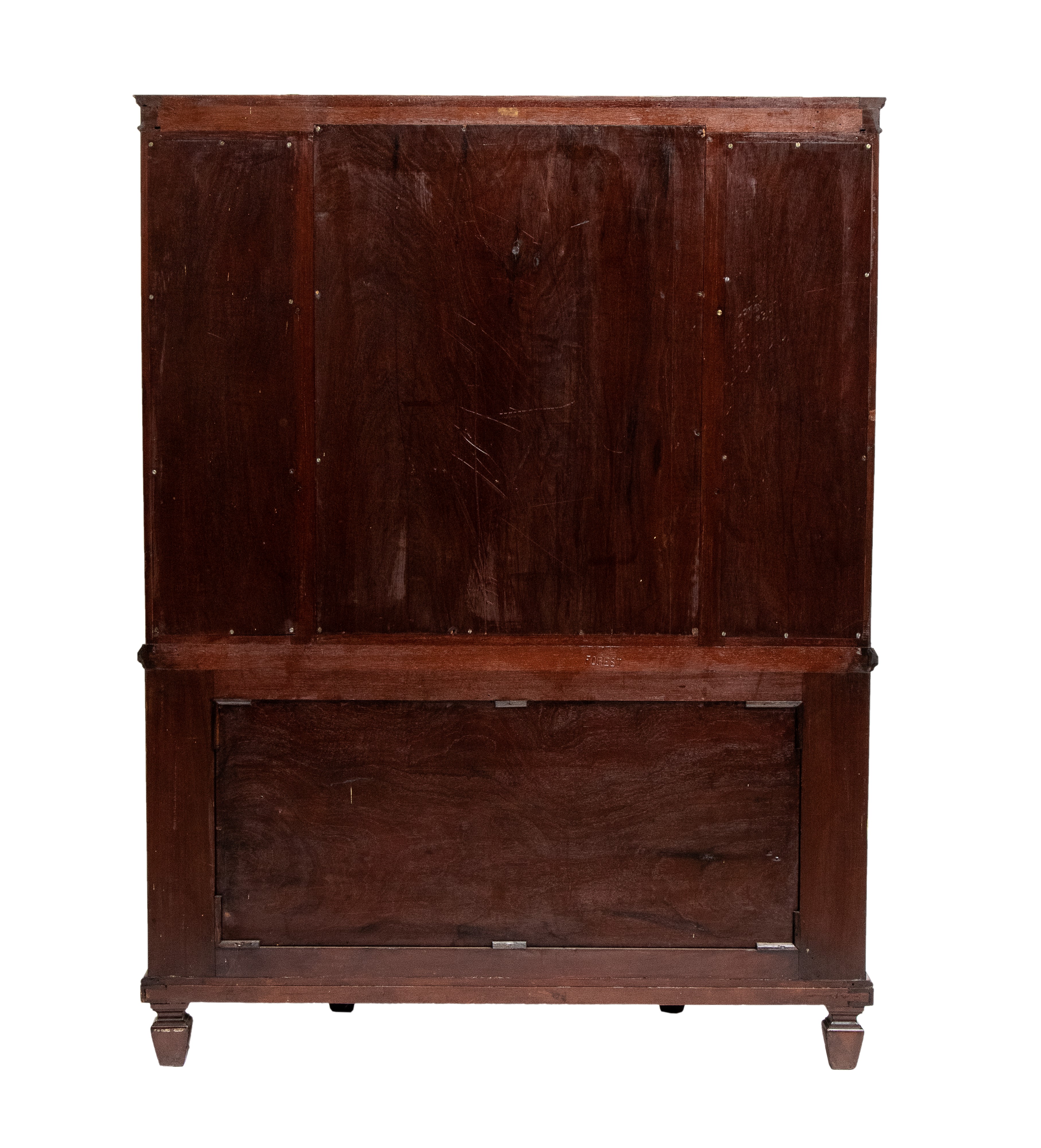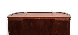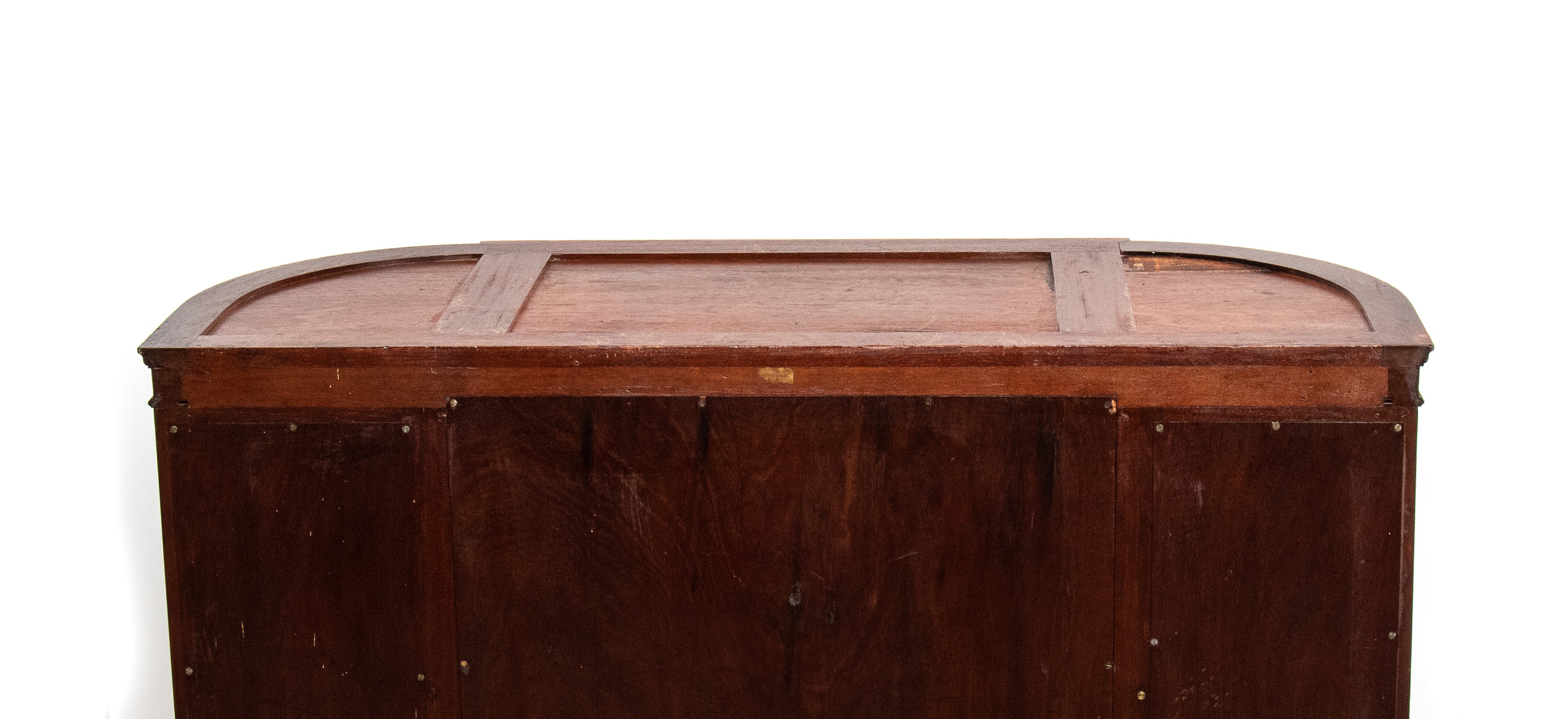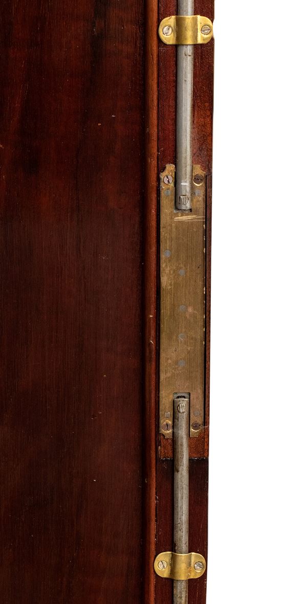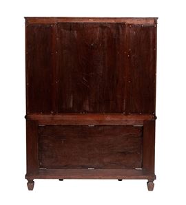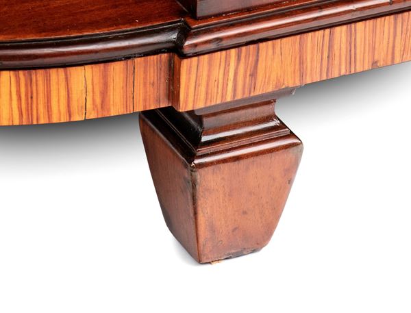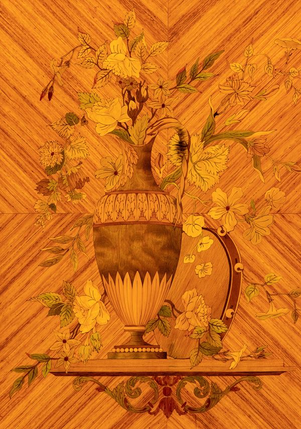 mobile "dessert" in bois de placage, con marqueterie floreale a motivi di vaso con fiori su fondo geometrico in bois de rose (Dalberga spp.) e bois de violette (Dalbergia cearensis, Ducke, 1925). La parte superiore con anta centrale decorata è affiancata da due vani a giorno con specchi e ripiani in marmo bordati da ringhierine in bronzo dorato. Piano in marmo breccia sagomato. Gambe scanalate e intarsiate, basamento con riserve geometriche, filettature in acero e finiture in bronzo dorato. Sulla fodera e sul piano superiore timbri a fuoco della Maison.