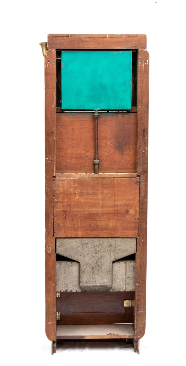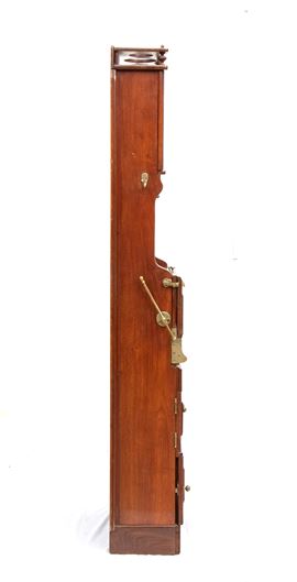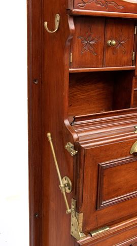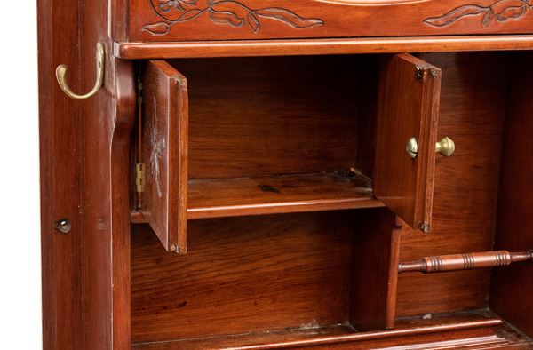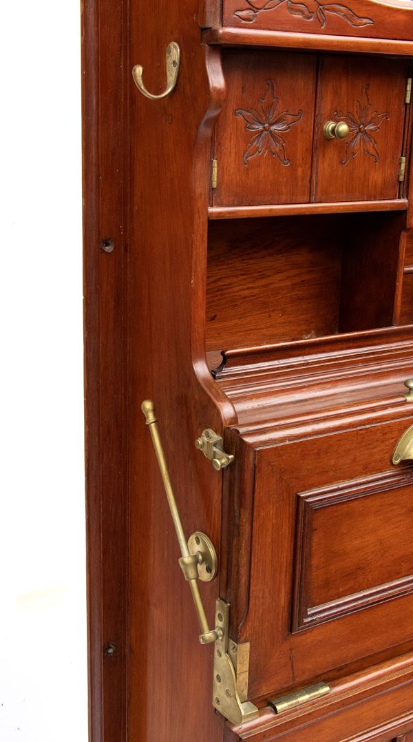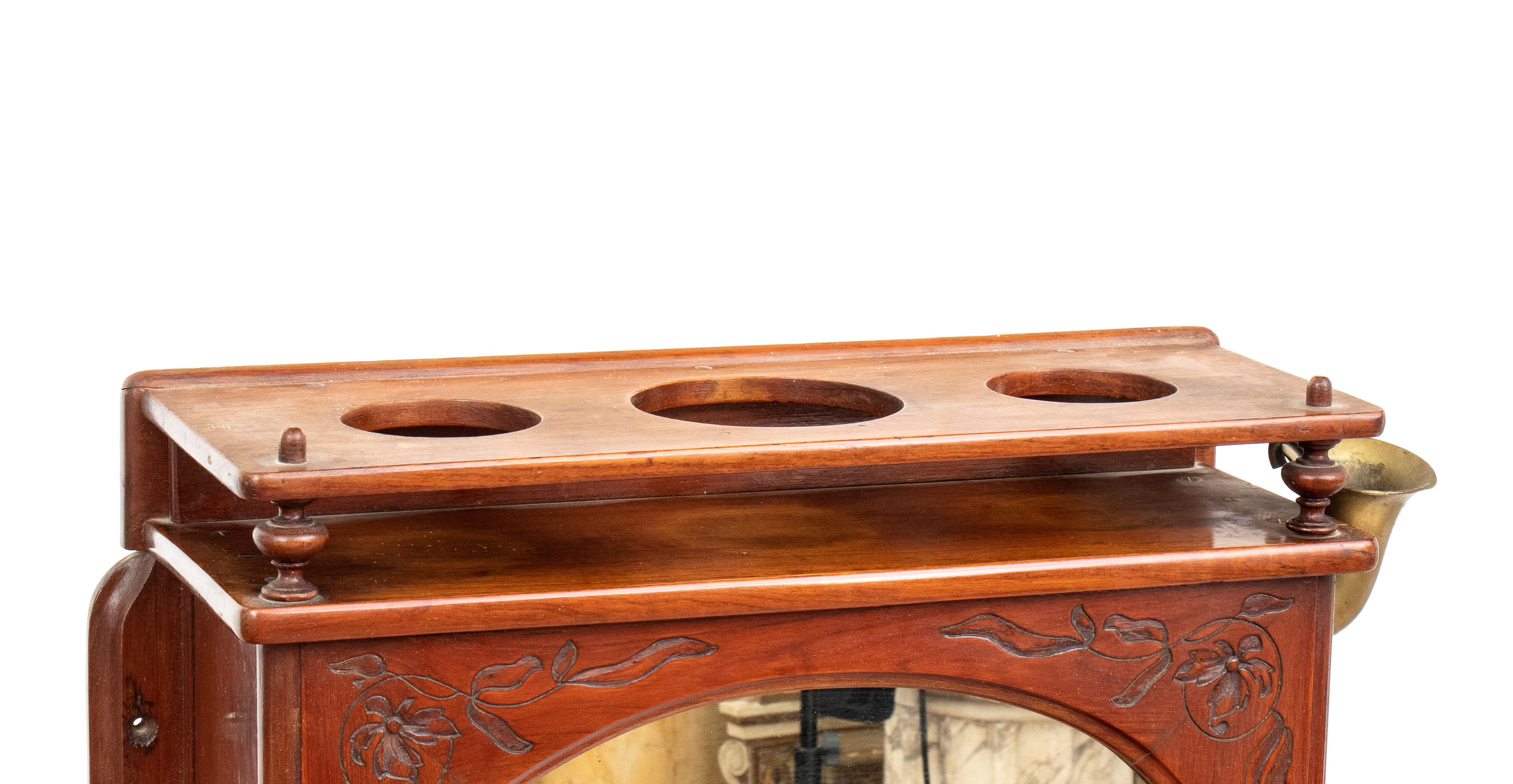 in mogano con finiture in ottone, caratterizzato da struttura modulare salva spazio a sviluppo verticale. Parte superiore con specchio ovale incassato estraibile e basculante con decoro floreale, tre fori circolari per contenitori. Vani a giorno, piccolo sportello ad doppia antae cassetto inferiore. Maniglie e cerniere in ottone, presenza di porta asciugamano laterale e porta boccale.