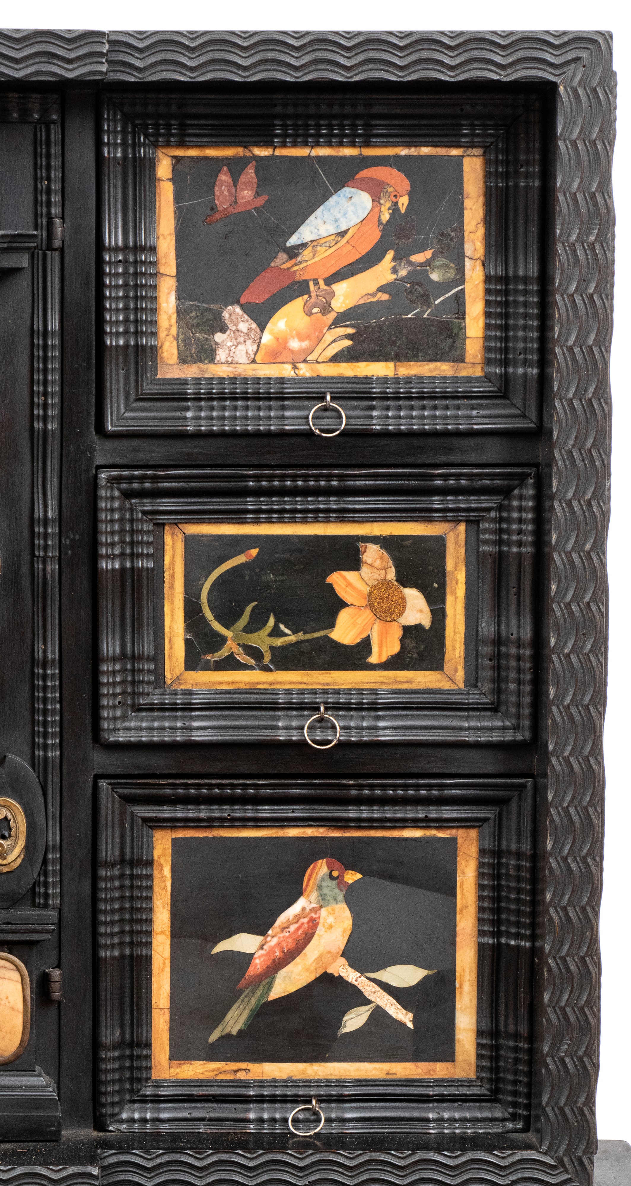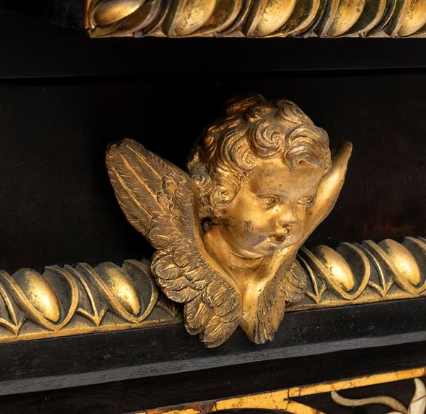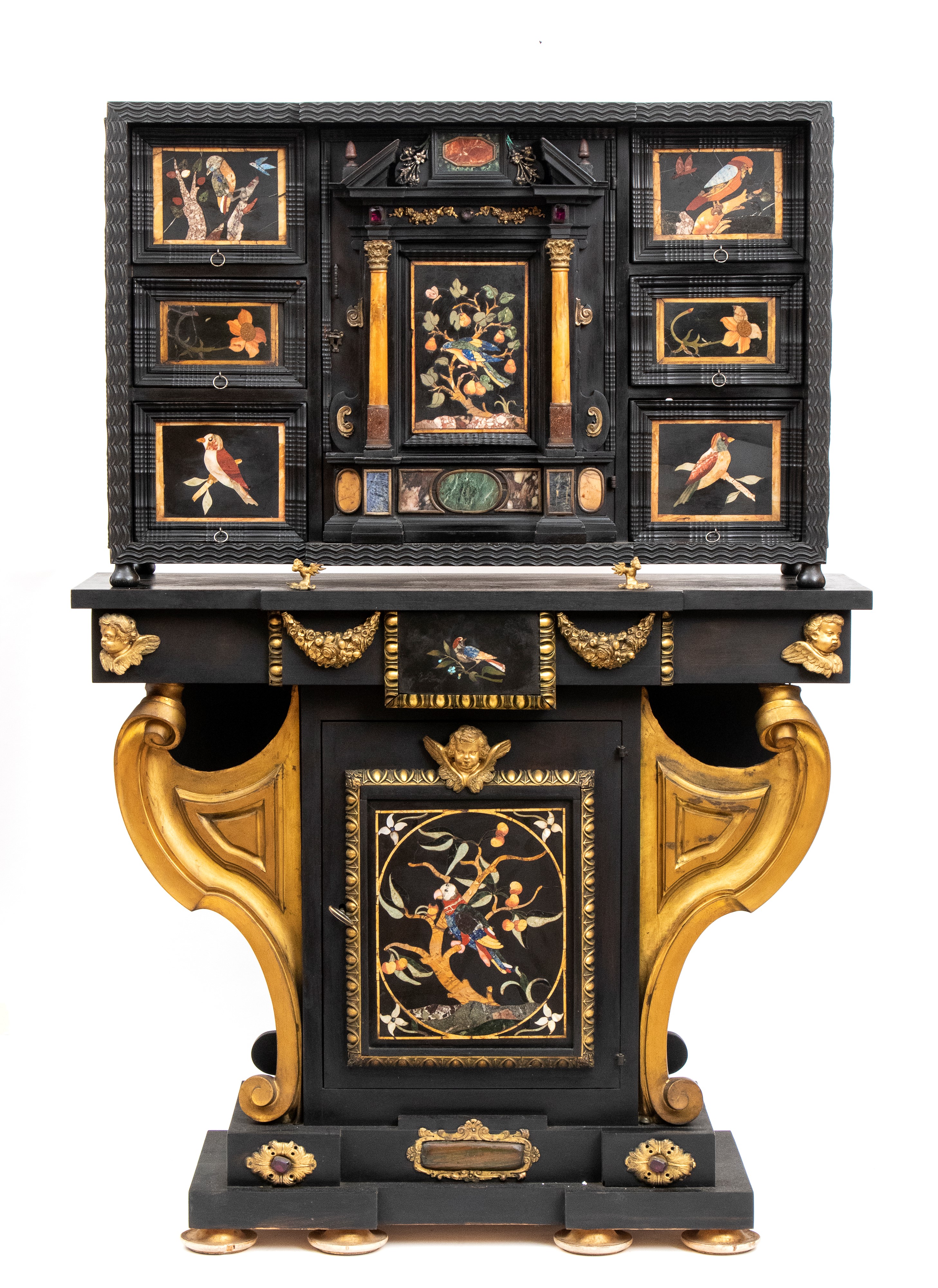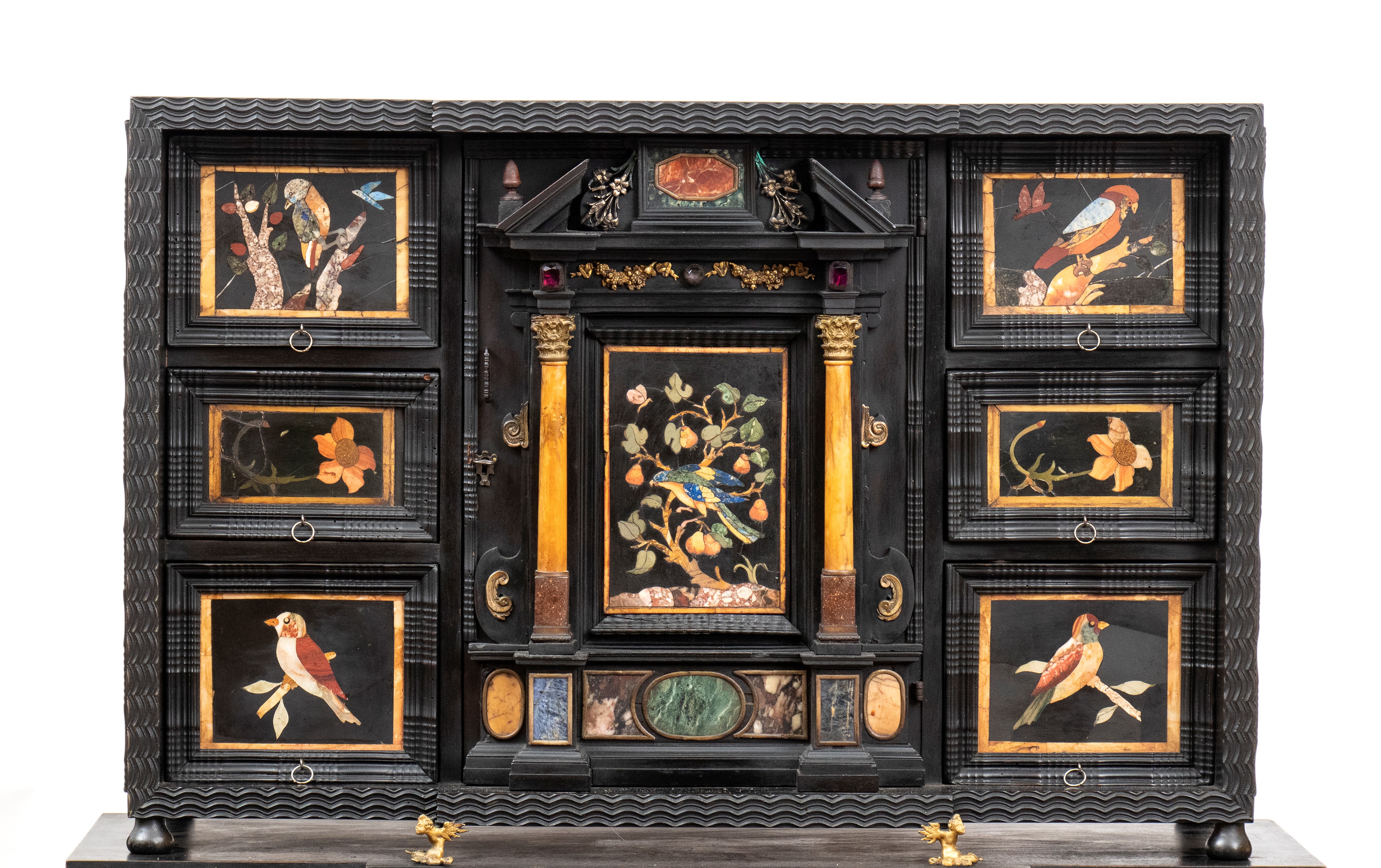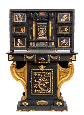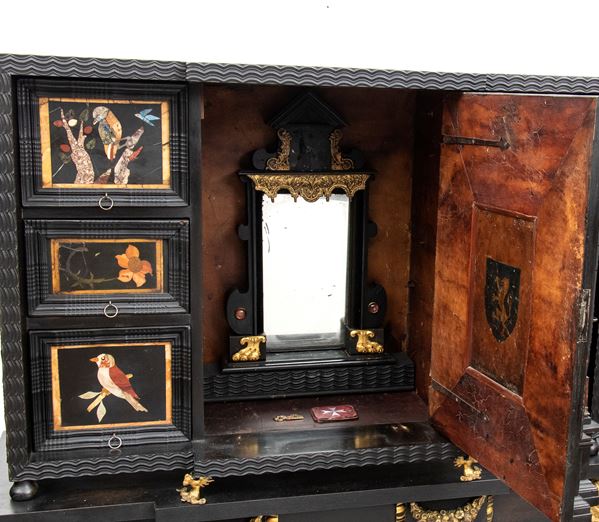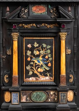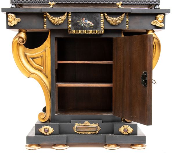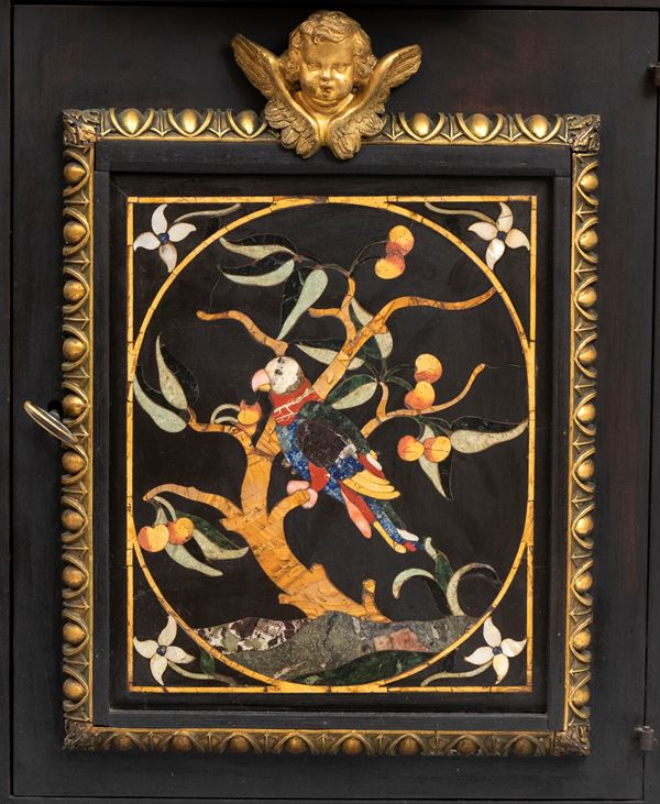 in ebano (Diospyros spp.), pietre dure, pannelli in commesso di pietre dure, e bronzi dorati. La parte superiore è composta da sei cassetti col davanti di una placca di pietre dure con fiori ed uccelli, al centro grande sportello a forma di portale con due colonne in pietra ed in mezzo un albero con frutta e foglie su cui spicca un pappagallo variopinto, il tutto in pietre dure, sotto al portale una striscia di pietre dure di diversi tipi e forme. L'interno del vano del tempio è foderato di cuoio e ornato da uno specchio con colonne ed una trabeazione di bronzo dorato. La parte inferiore, non coeva al sopra (XX secolo) è composta da un mobile la cui parte superiore a mo' di tamburo di tavolo è ornata da una placca in pietre dure con uccello su di un ramo, ghirlande ,di putto in bronzo dorato. Ai lati due grandi volute in legno dorato di bellissimo disegno. Al centro del mobile un grande quadro in commesso di pietre dure, incorniciato di bronzo dorato e testa di puto, rappresenta un albero ricco di frutta e foglie su cui poggia un pappagallo a ricco piumaggio colorato, agli angoli quattro fiori bianchi. La base del mobile è ornata da pietre dure contornate da decori in bronzo dorato. Piedi a toupie schiacciata in legno dorato. Il mobile è arricchito da un cofano in ebano, decorato da placche in commesso di pietre dure, rappresentanti uccelli su rami fioriti. Il mobile è stato eseguito dal'Opificio Granducale del pietre dure per i Brancaleoni della Rocca Leonella li cui stemma è impresso e dipinto sul retro dello sportello della parte superiore.