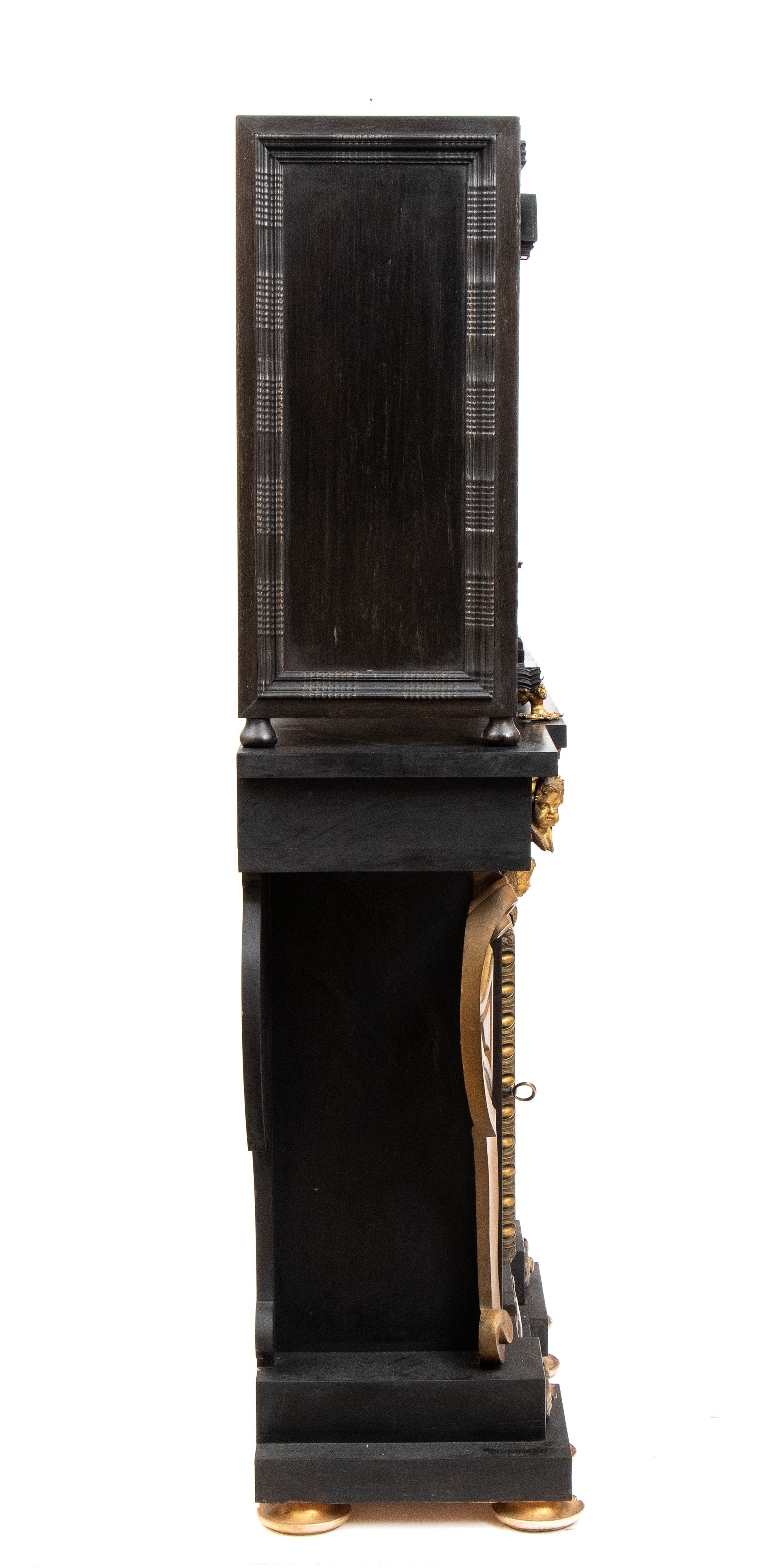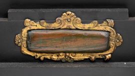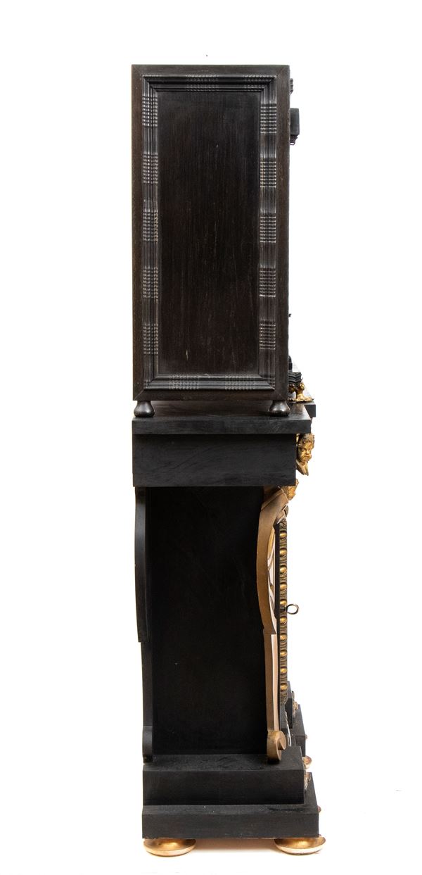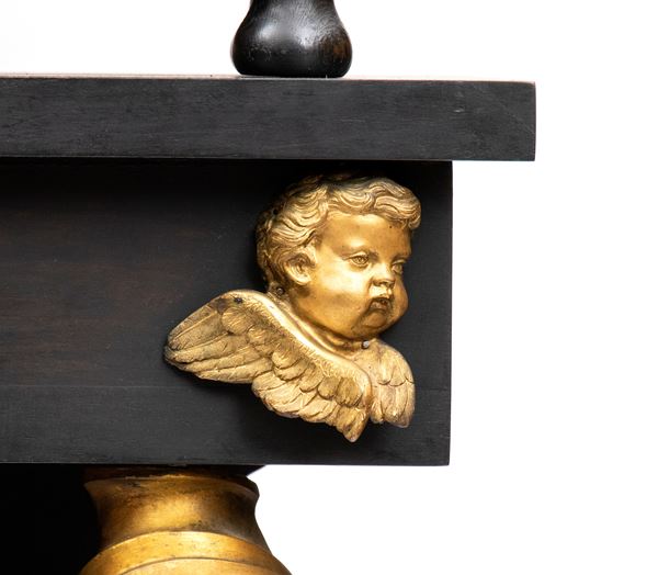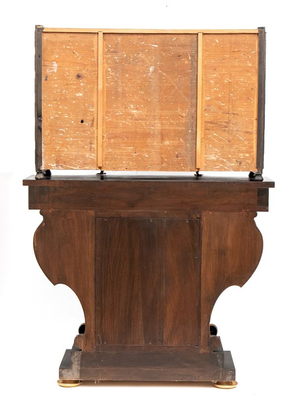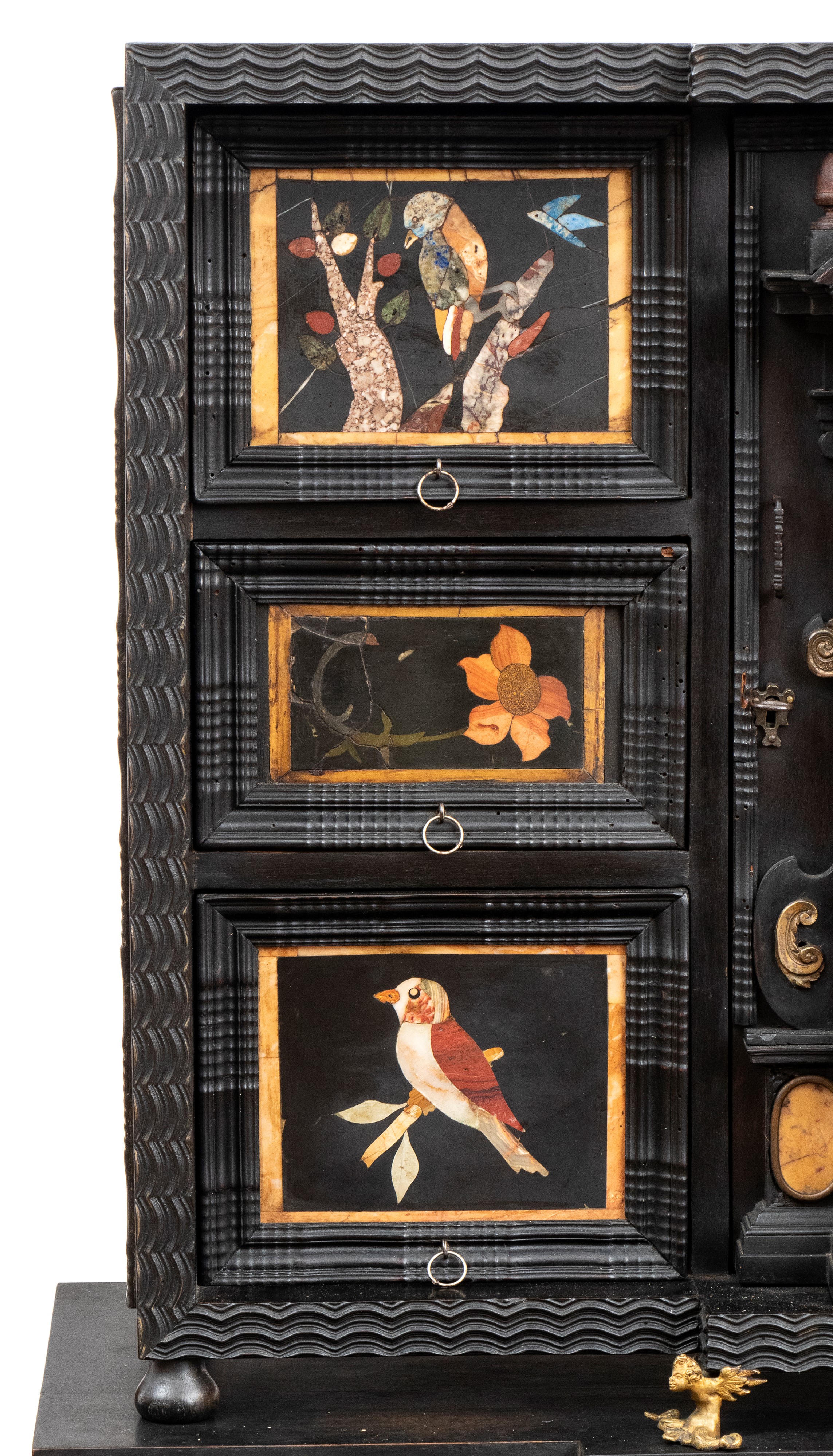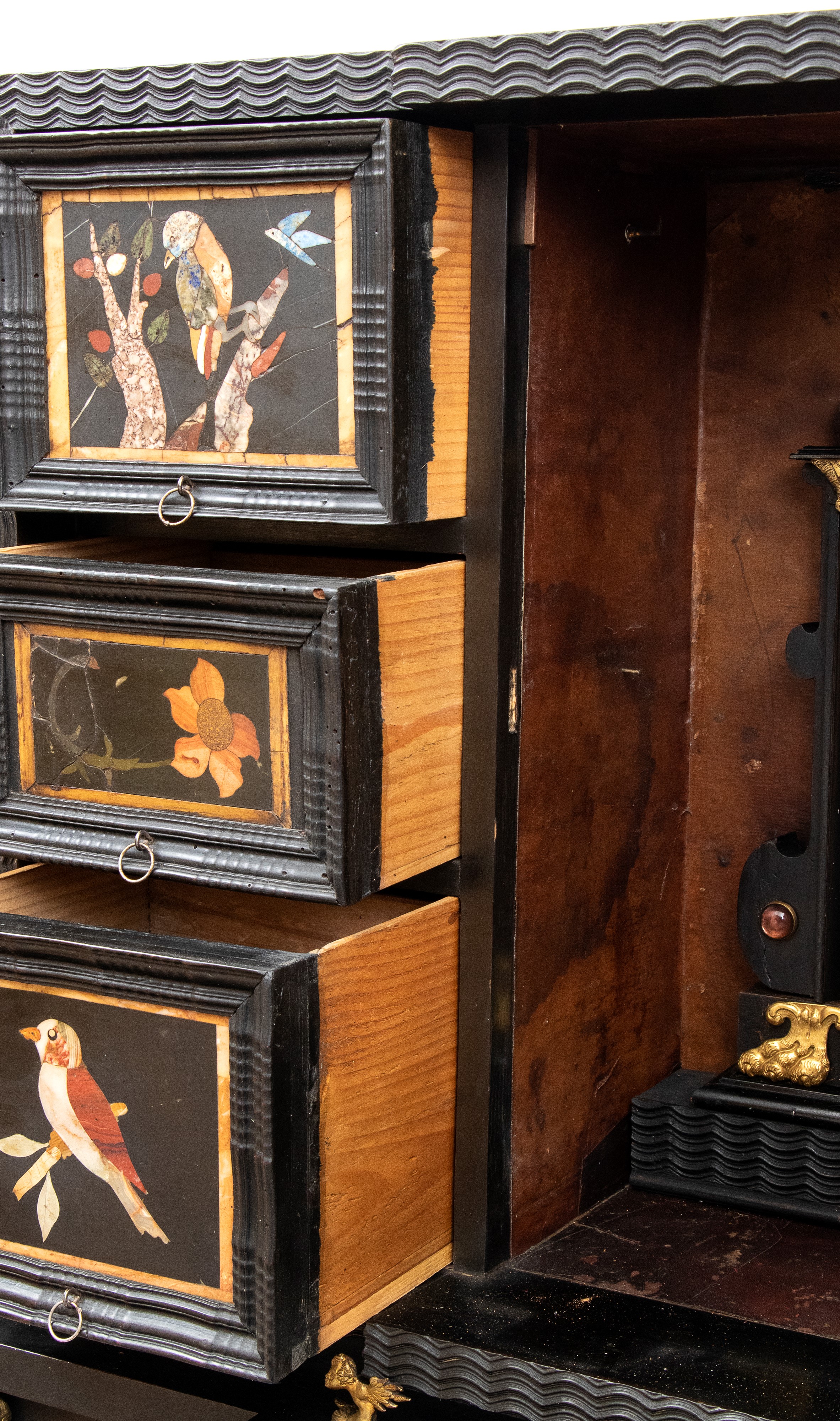 in ebano (Diospyros spp.), pietre dure, pannelli in commesso di pietre dure, e bronzi dorati. La parte superiore è composta da sei cassetti col davanti di una placca di pietre dure con fiori ed uccelli, al centro grande sportello a forma di portale con due colonne in pietra ed in mezzo un albero con frutta e foglie su cui spicca un pappagallo variopinto, il tutto in pietre dure, sotto al portale una striscia di pietre dure di diversi tipi e forme. L'interno del vano del tempio è foderato di cuoio e ornato da uno specchio con colonne ed una trabeazione di bronzo dorato. La parte inferiore, non coeva al sopra (XX secolo) è composta da un mobile la cui parte superiore a mo' di tamburo di tavolo è ornata da una placca in pietre dure con uccello su di un ramo, ghirlande ,di putto in bronzo dorato. Ai lati due grandi volute in legno dorato di bellissimo disegno. Al centro del mobile un grande quadro in commesso di pietre dure, incorniciato di bronzo dorato e testa di puto, rappresenta un albero ricco di frutta e foglie su cui poggia un pappagallo a ricco piumaggio colorato, agli angoli quattro fiori bianchi. La base del mobile è ornata da pietre dure contornate da decori in bronzo dorato. Piedi a toupie schiacciata in legno dorato. Il mobile è arricchito da un cofano in ebano, decorato da placche in commesso di pietre dure, rappresentanti uccelli su rami fioriti. Il mobile è stato eseguito dal'Opificio Granducale del pietre dure per i Brancaleoni della Rocca Leonella li cui stemma è impresso e dipinto sul retro dello sportello della parte superiore.
