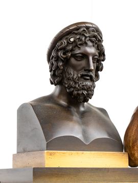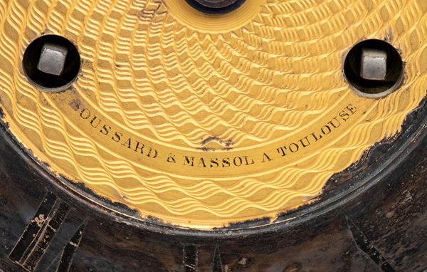 firmato sul quadrante "Houssard & Massol a Toulouse", in bronzo dorato e brunito, cassa architettonica con basamento decorato da bassorilievo raffigurante allegorie solari e figure classiche. La parte superiore raffigura filosofo con pergamena, affiancato da busto maschile classico. Quadrante circolare dorato con numeri romani. Piedi a zampe leonine.