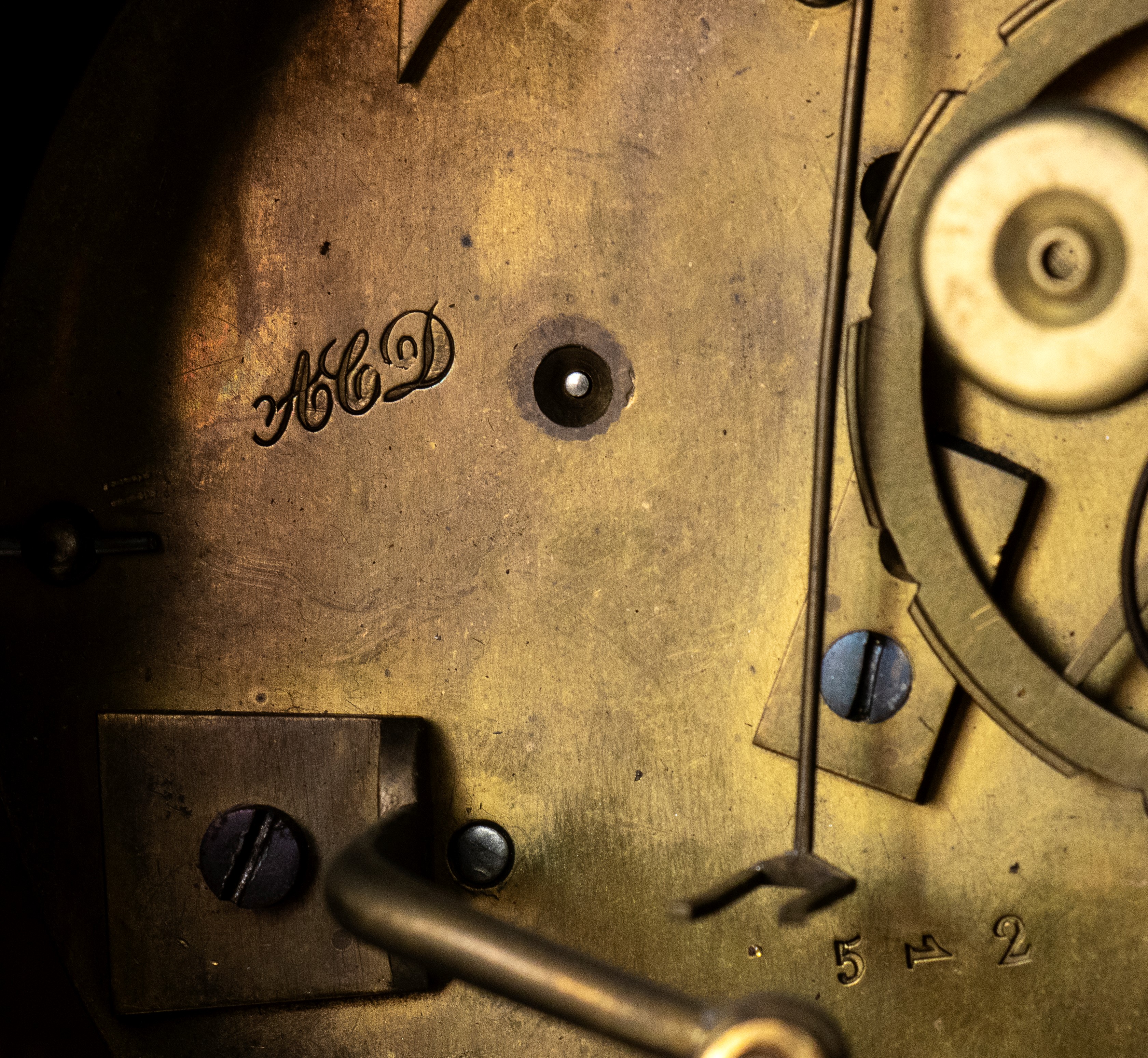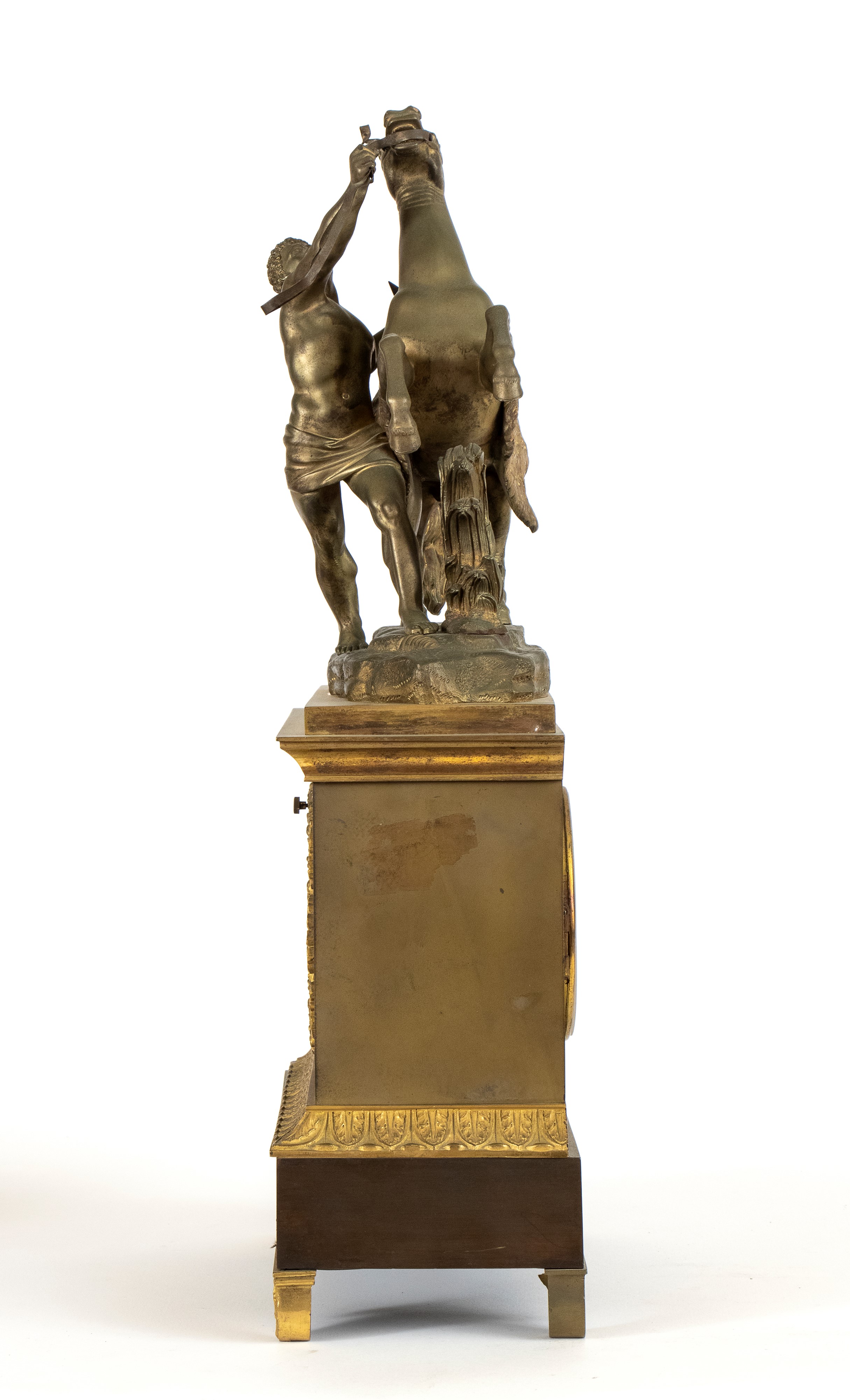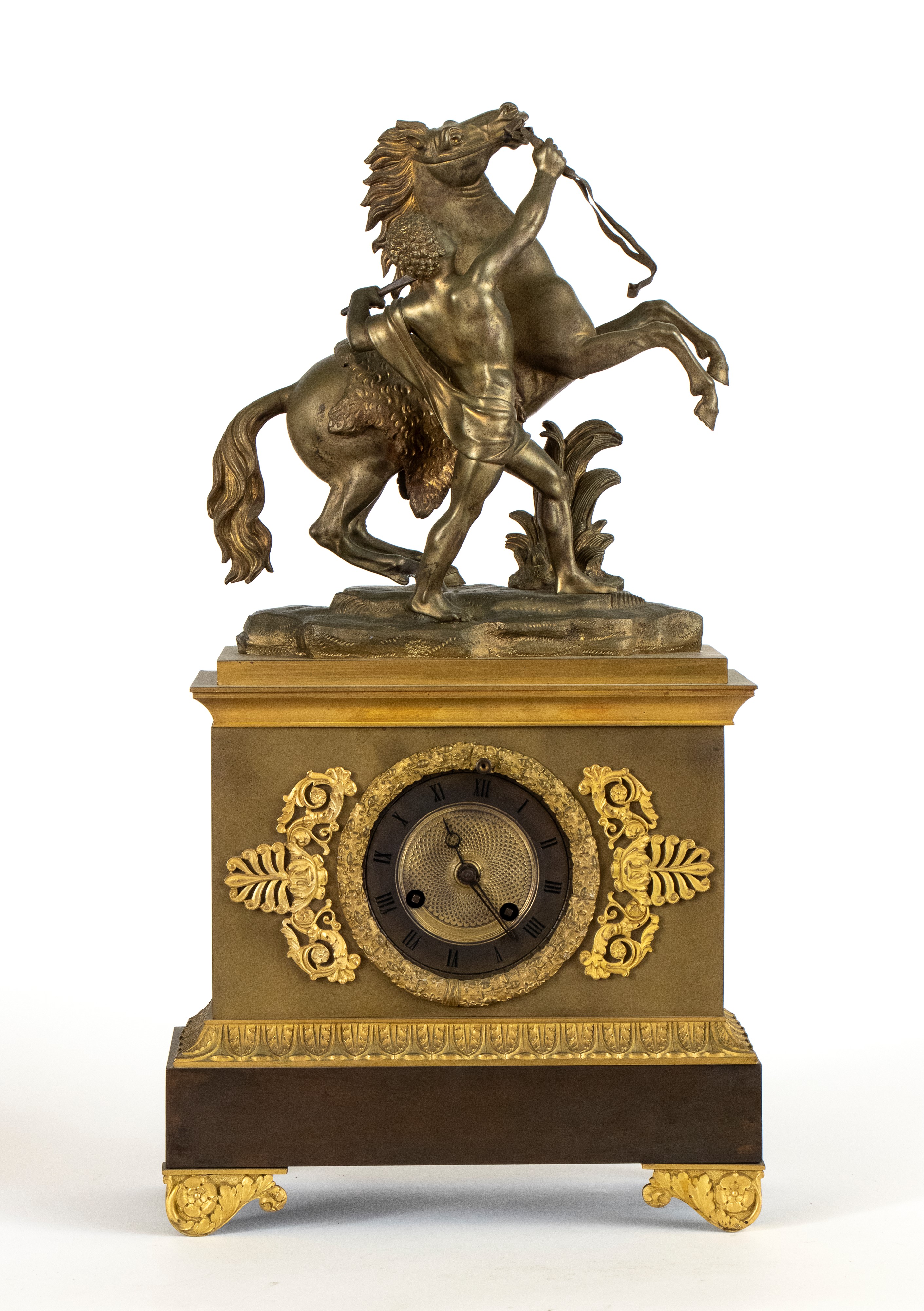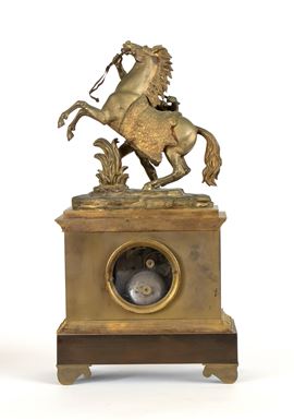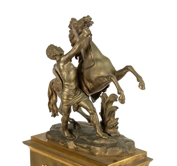 raffigurante domatore di cavallo, primo quarto del XIX secolo (1820 circa), il gruppo poggia su una base rettangolare decorata con elementi fogliacei e rosette in bronzo dorato. Il quadrante è incorniciato da ghirlande vegetale, con numerazione romana e lancette in metallo brunito. Movimento con sospensione a filo e regolatore a pendolo con suoneria su campana firmato "ACD".