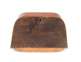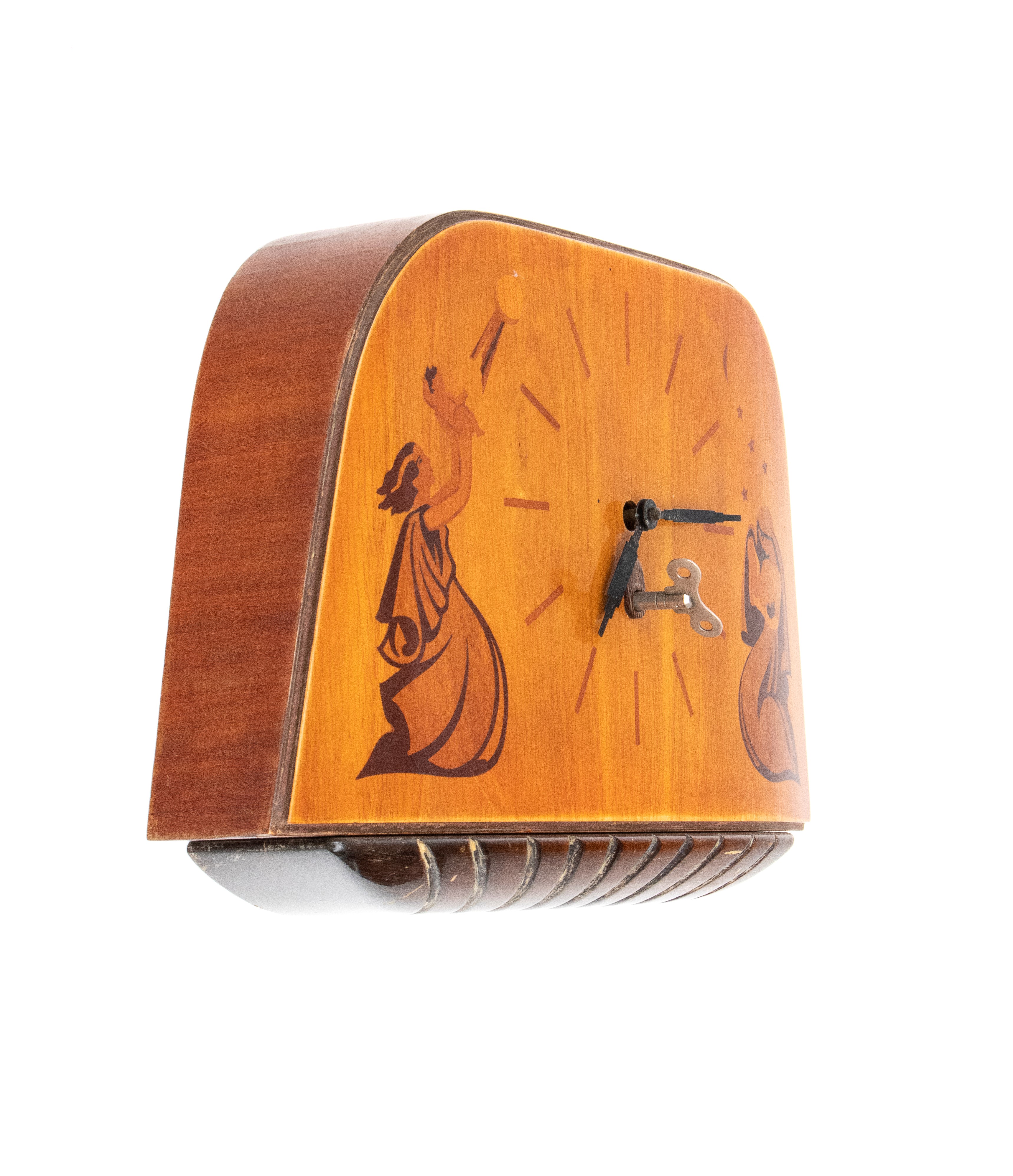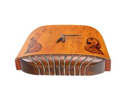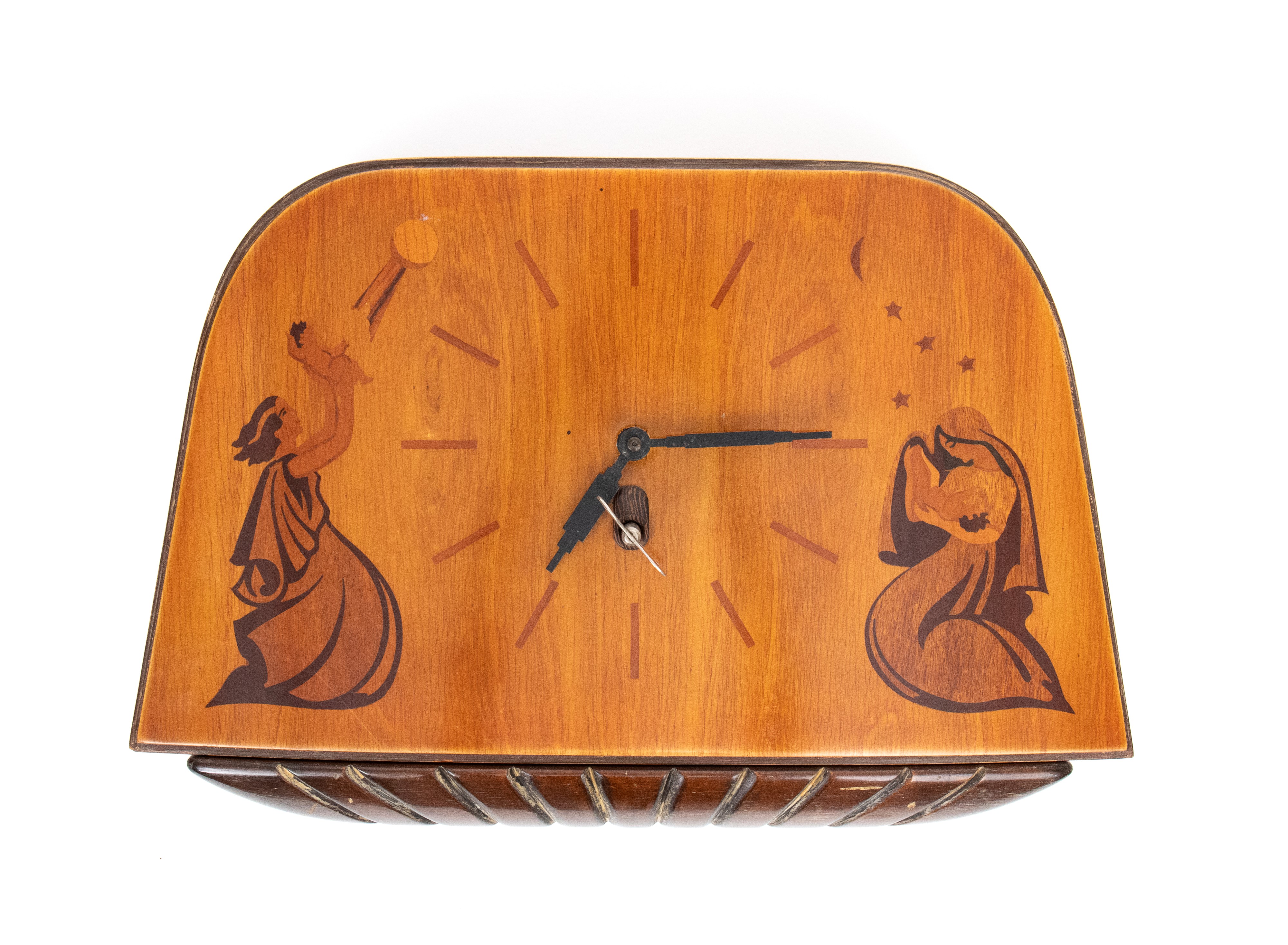anni '40, in ciliegio e con intarsi in legni di frutto raffiguranti figure allegoriche (probabilmente personificazione del Giorno e della Notte). Movimento centrale con quadrante senza numeri, solo tacche orarie incise. Base a ventaglio con inserti in legno curvato.