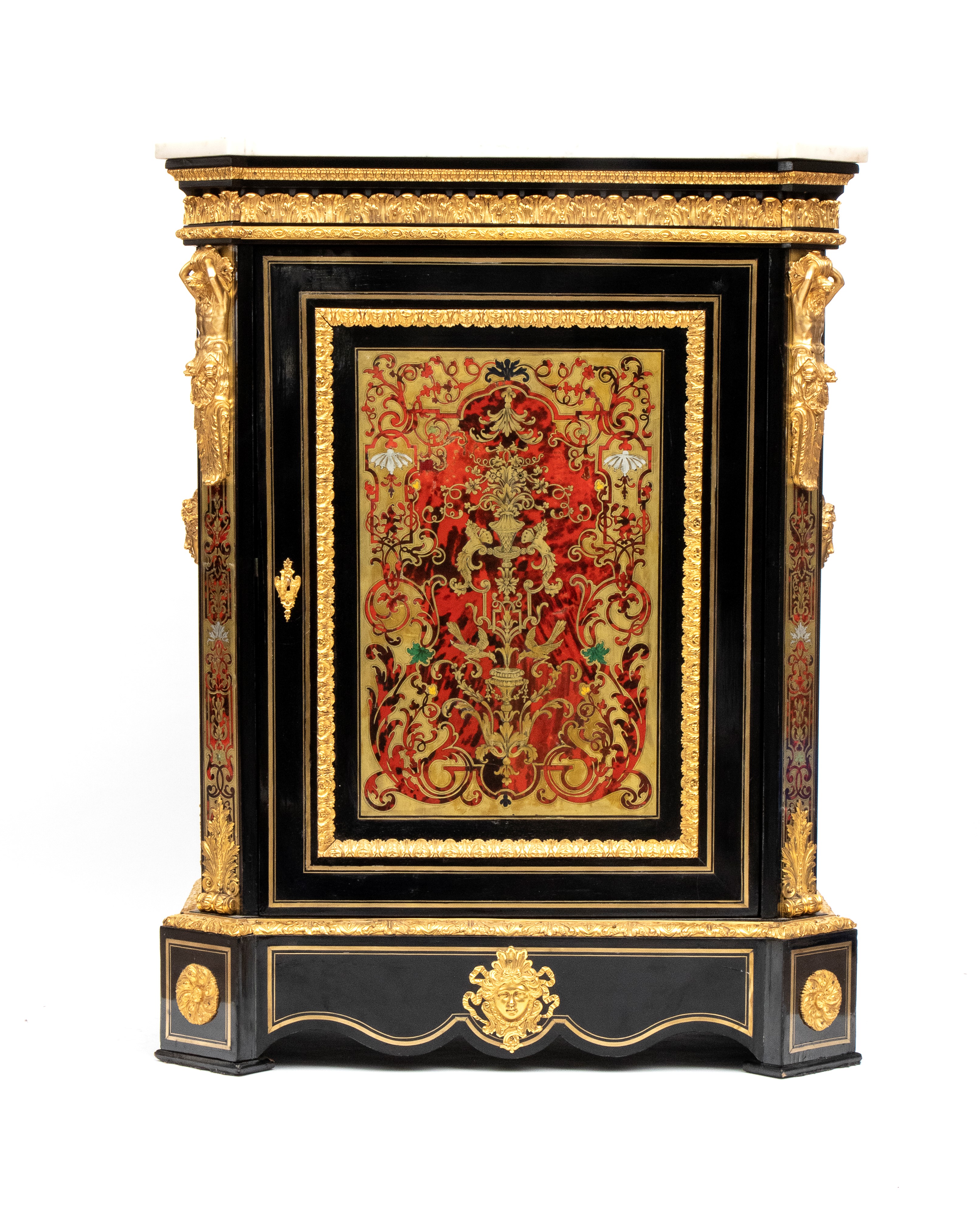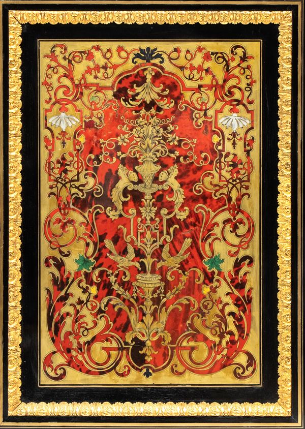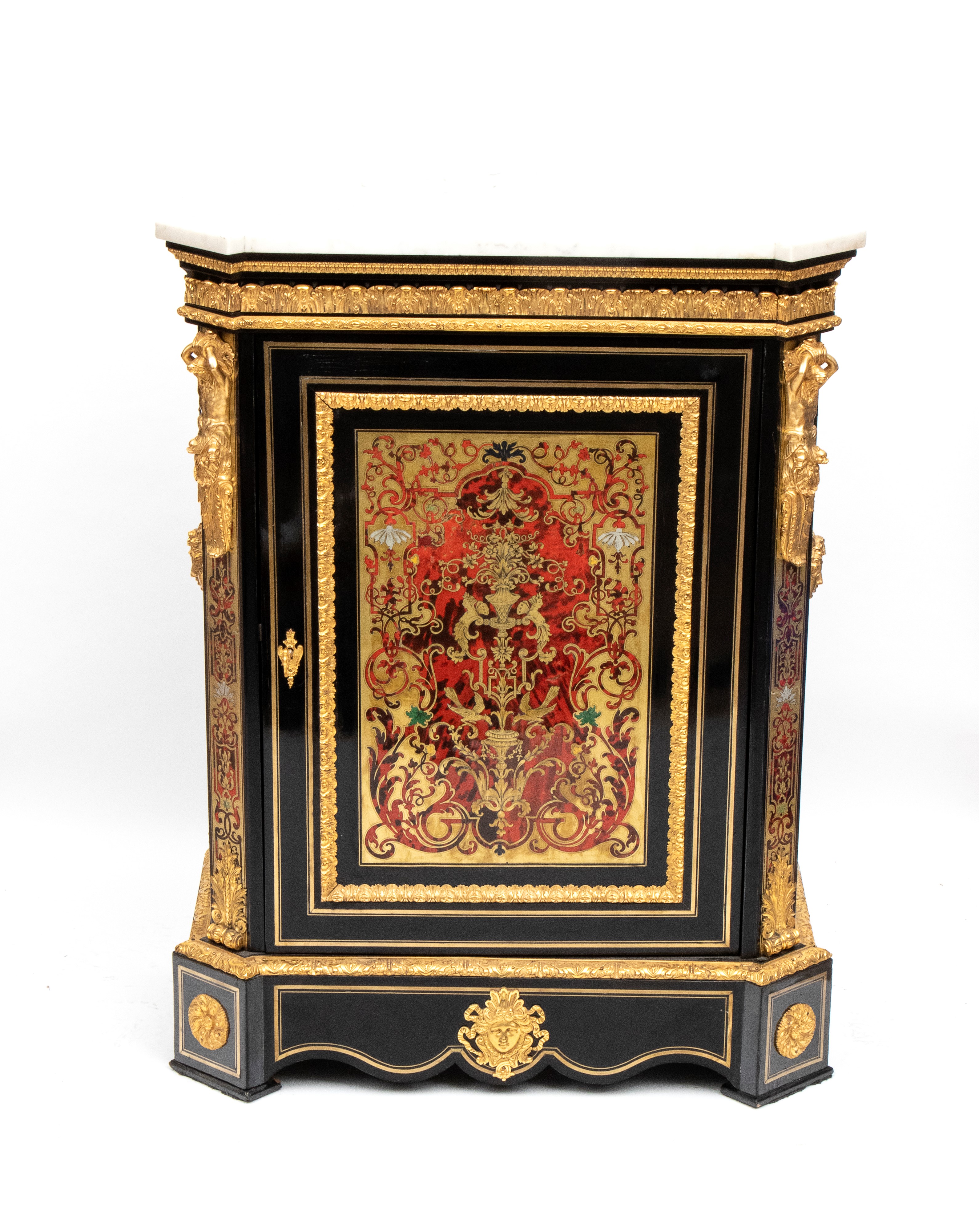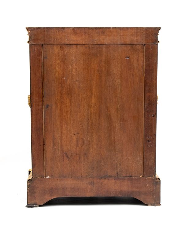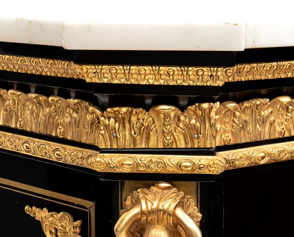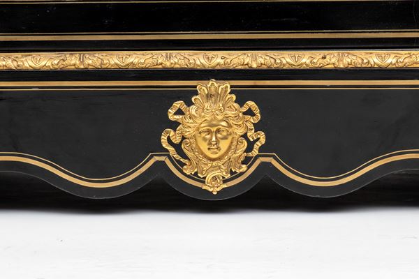 firmato Hippolyte-Edmé Pretot, all'interno dei bronzi con il monogramma H.P., che fu il più grande creatore di mobili in tartaruga del periodo tra il Luigi Filippo e il Napoleone III. Realizzata in legno ebanizzato con ricco decoro in stile Boulle, con applicazioni in ottone e tartaruga, intarsi a motivi vegetali e arabeschi, ornamenti in bronzo dorato finemente cesellati. Il pannello centrale mostra due donne alate contrapposte con ali accolate, due uccelli che si abbeverano, sui fianchi bronzi raffiguranti il Dio Apollo. Piano superiore in marmo bianco sagomato.