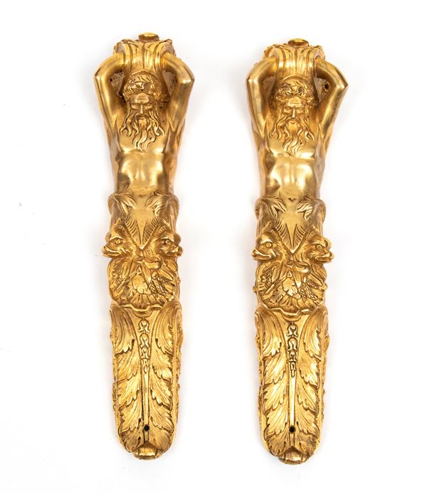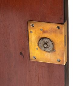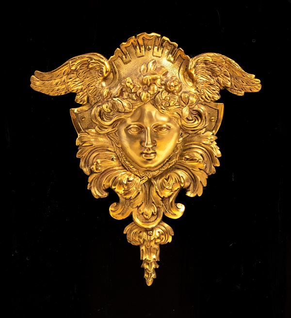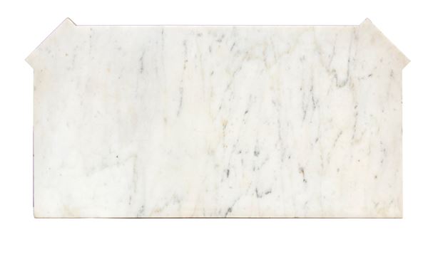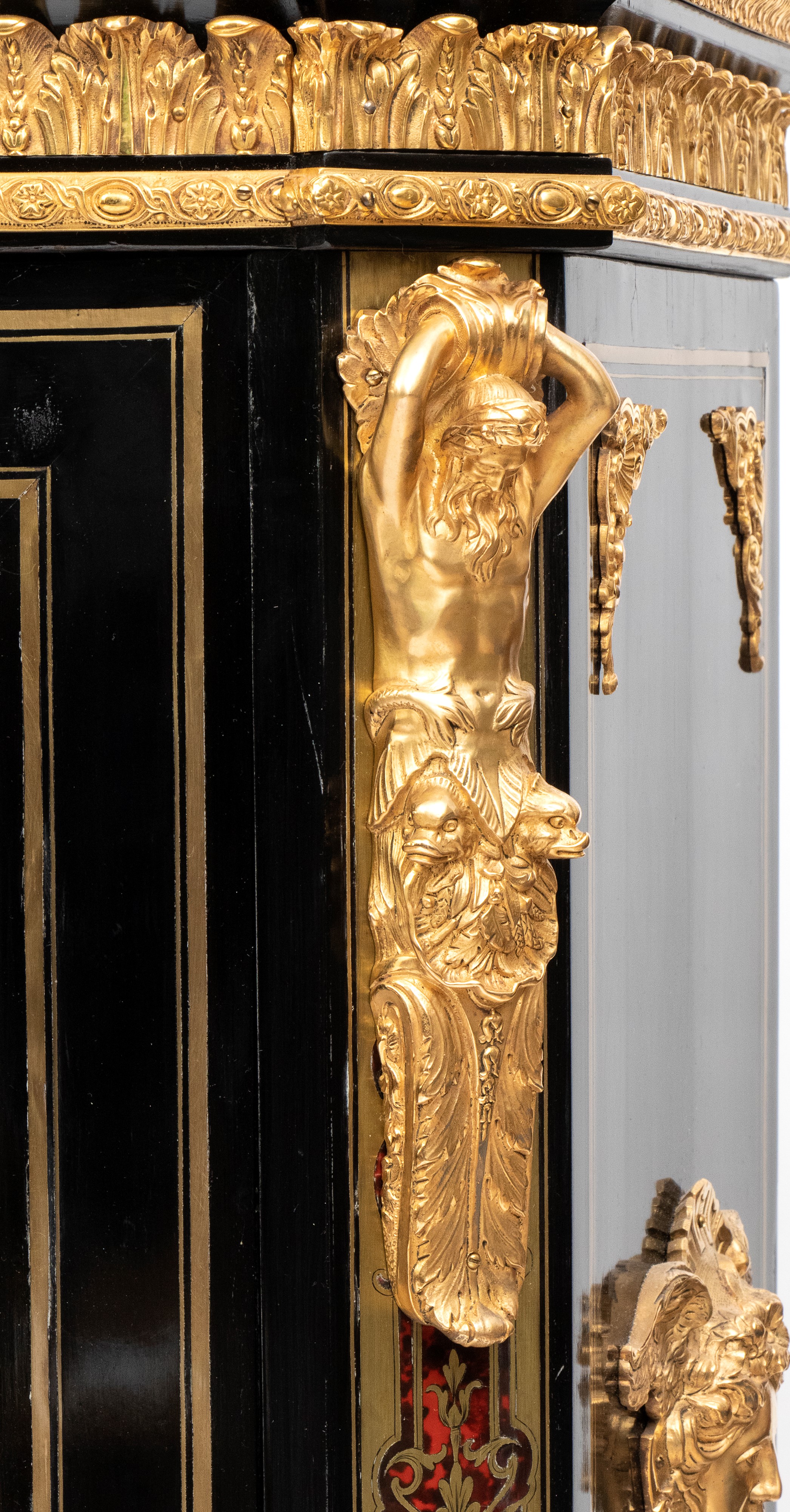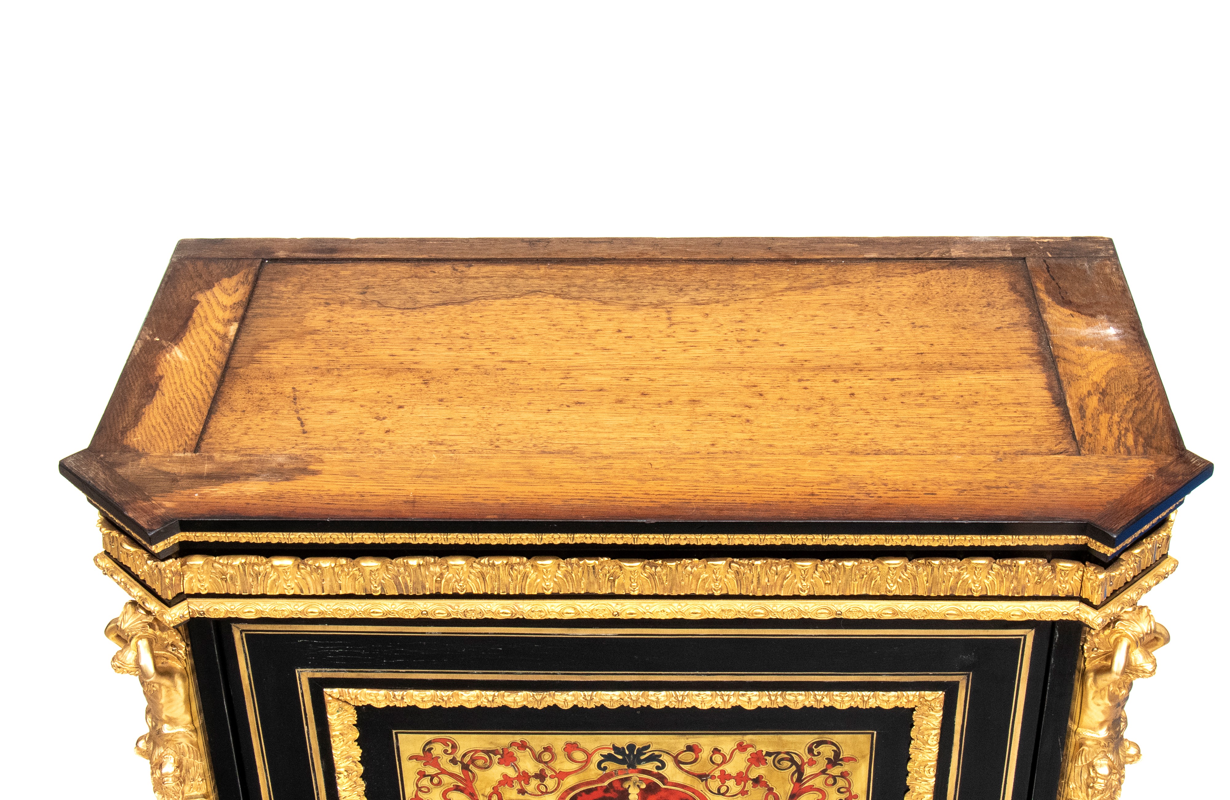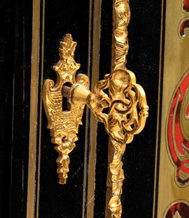firmato Hippolyte-Edmé Pretot, all'interno dei bronzi con il monogramma H.P., che fu il più grande creatore di mobili in tartaruga del periodo tra il Luigi Filippo e il Napoleone III. Realizzata in legno ebanizzato con ricco decoro in stile Boulle, con applicazioni in ottone e tartaruga, intarsi a motivi vegetali e arabeschi, ornamenti in bronzo dorato finemente cesellati. Il pannello centrale mostra due donne alate contrapposte con ali accolate, due uccelli che si abbeverano, sui fianchi bronzi raffiguranti il Dio Apollo. Piano superiore in marmo bianco sagomato.