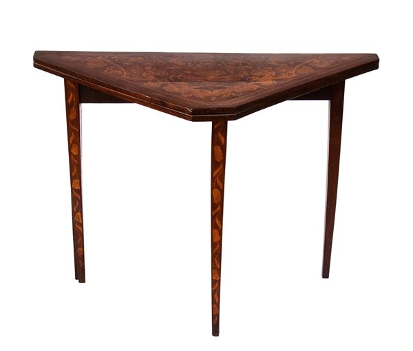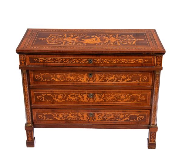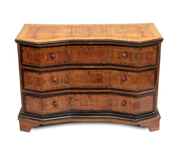 lastronati in noce e con intarsiato, il piano sagomato con angoli scantonati, fronte mosso a tre cassetti, basamento modanato. Le misure differiscono leggermente tra loro.
