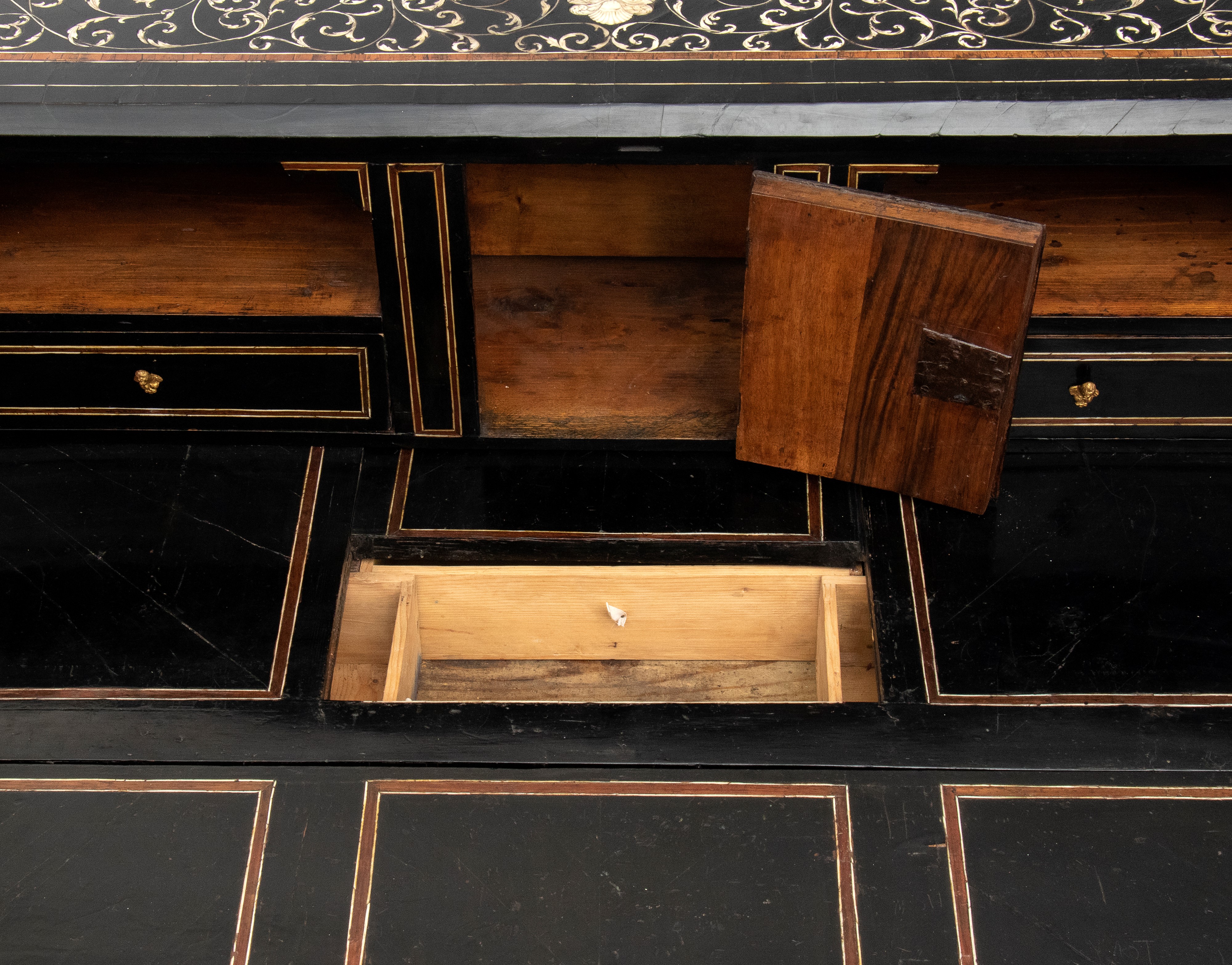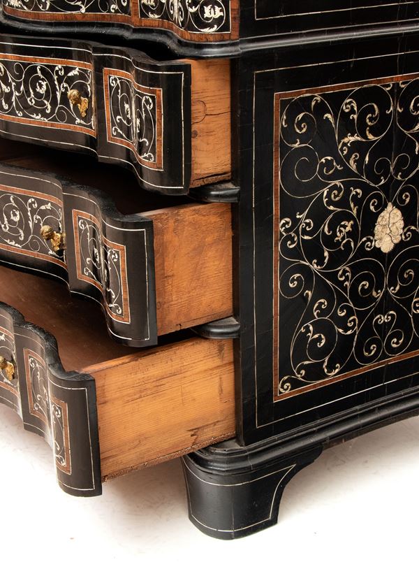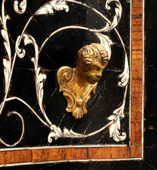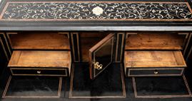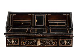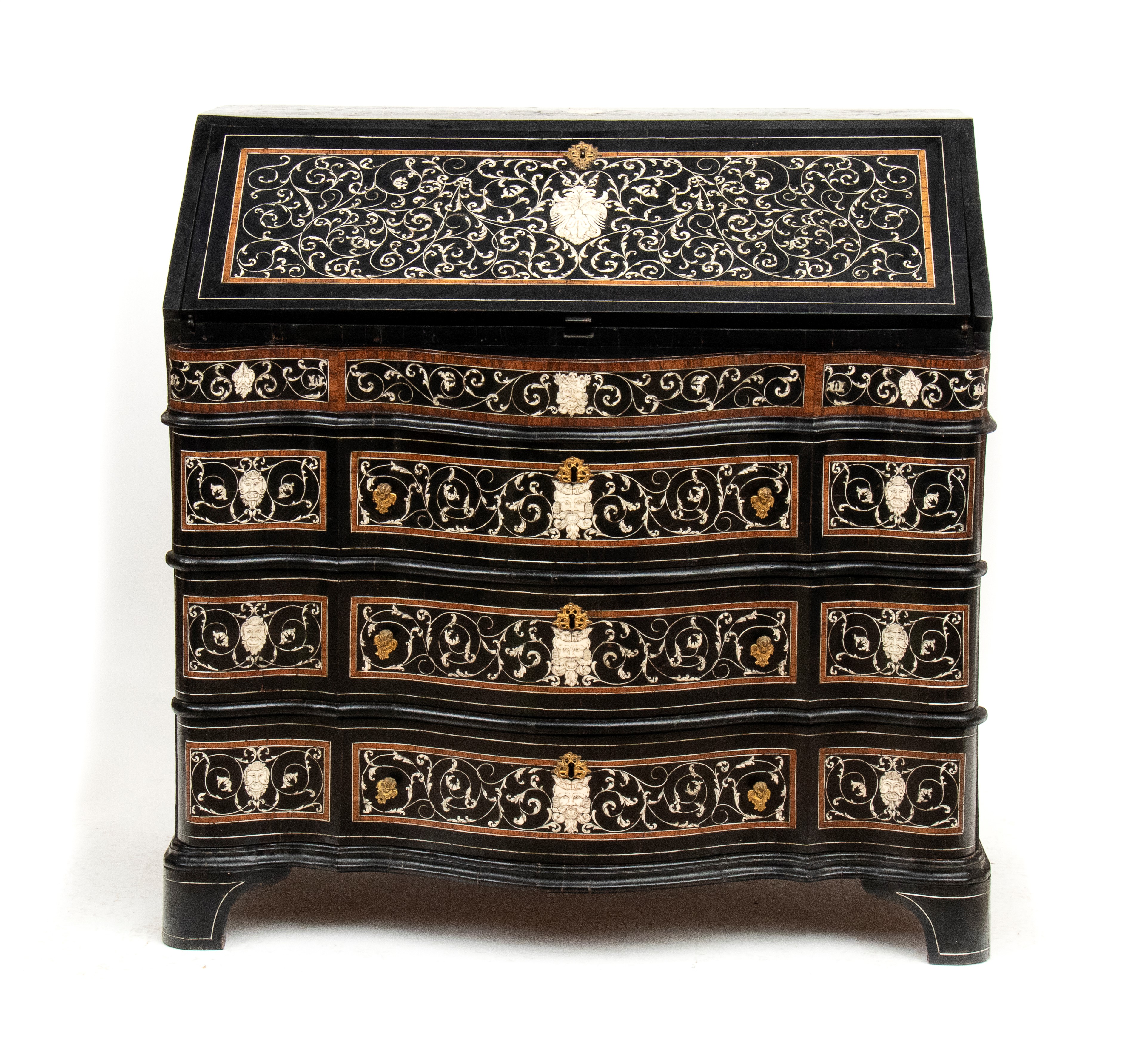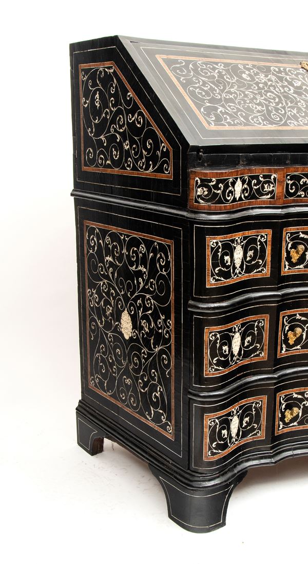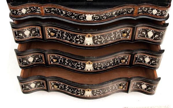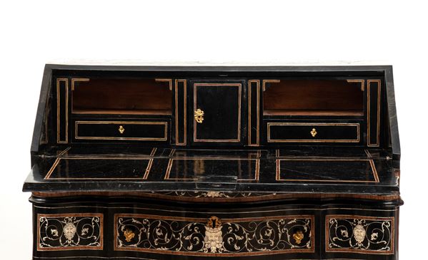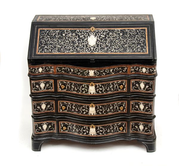 in legno ebanizzato, ebano viola (Dalbergia cearensis, Ducke, 1925) ed intarsiato in osso, con motivi fitomorfi e floreali, cartigli e medaglioni. Fronte mosso a tre cassetti e calatoia intarsiata, che cela scarabattolo interno con piccoli cassetti e vani. Laterali decorati a specchiatura. Bocchette a forma di testa di angelo e serrature coeve.