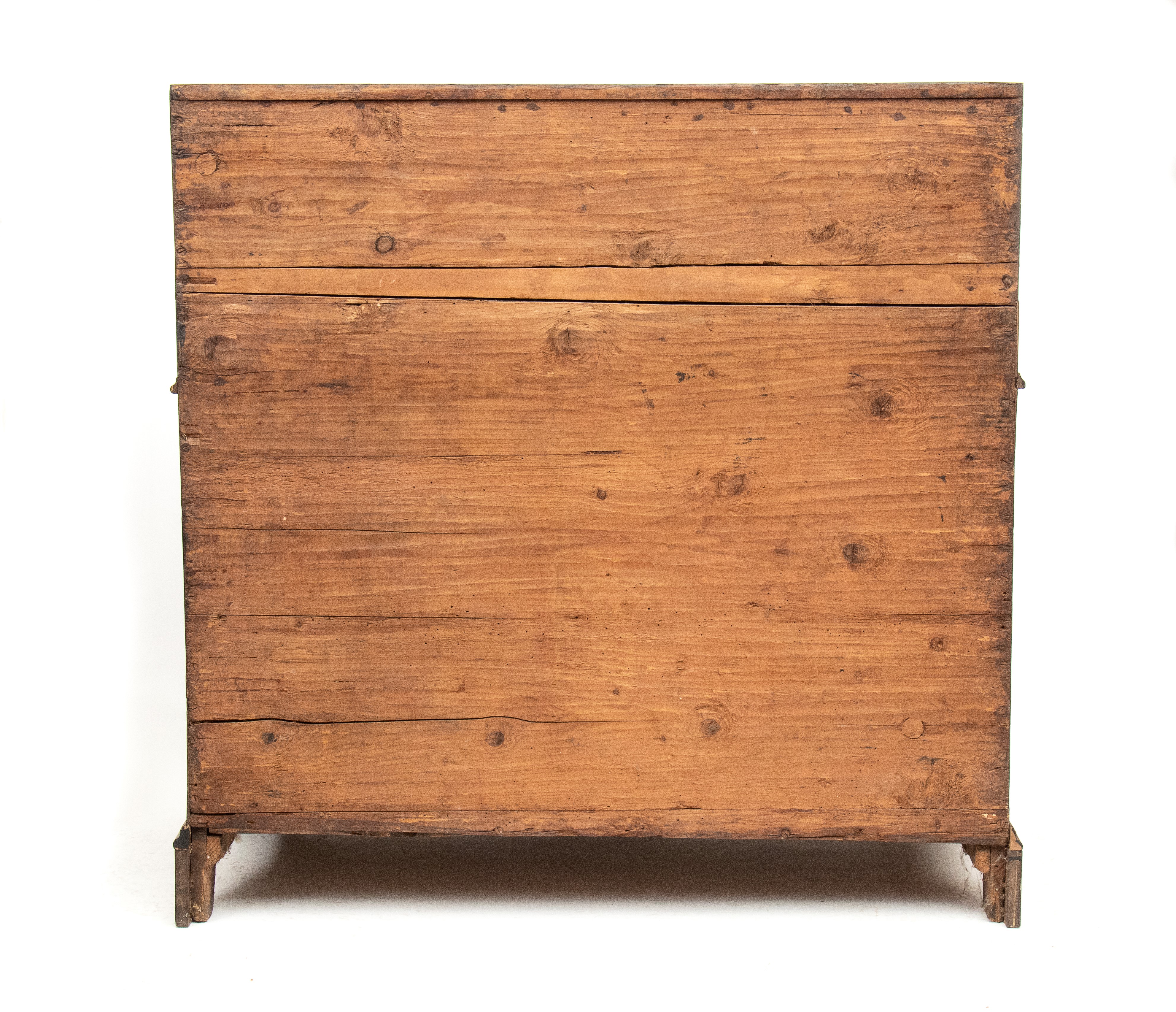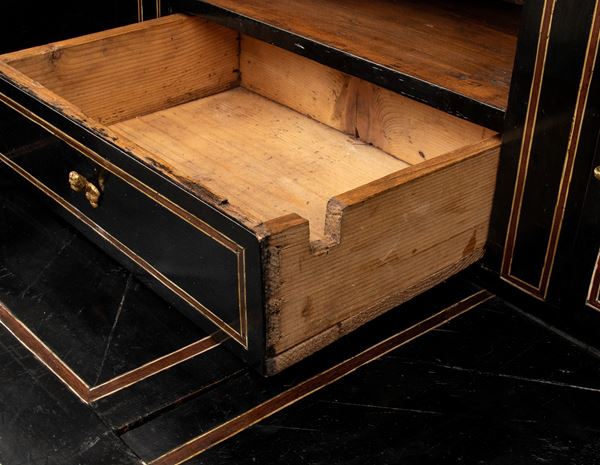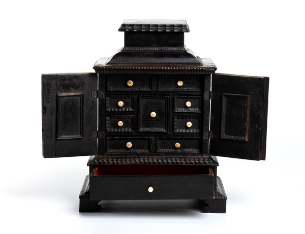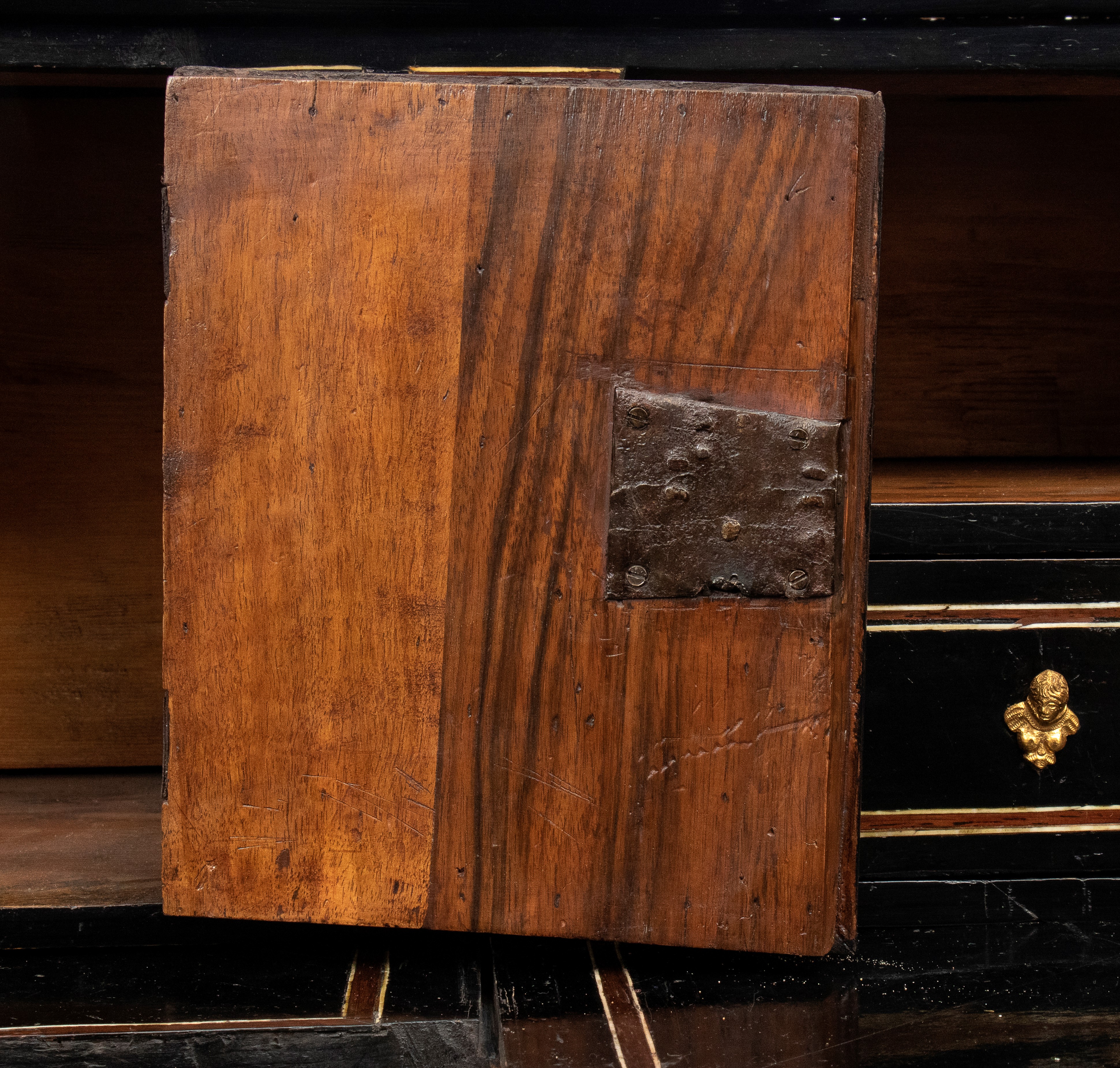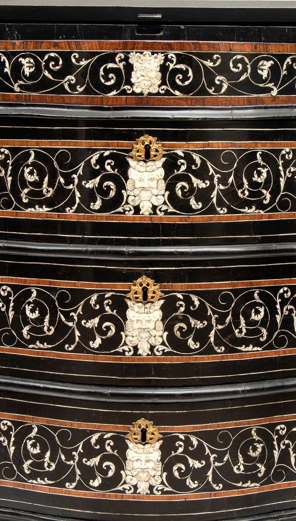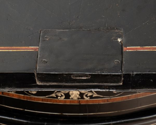 in legno ebanizzato, ebano viola (Dalbergia cearensis, Ducke, 1925) ed intarsiato in osso, con motivi fitomorfi e floreali, cartigli e medaglioni. Fronte mosso a tre cassetti e calatoia intarsiata, che cela scarabattolo interno con piccoli cassetti e vani. Laterali decorati a specchiatura. Bocchette a forma di testa di angelo e serrature coeve.