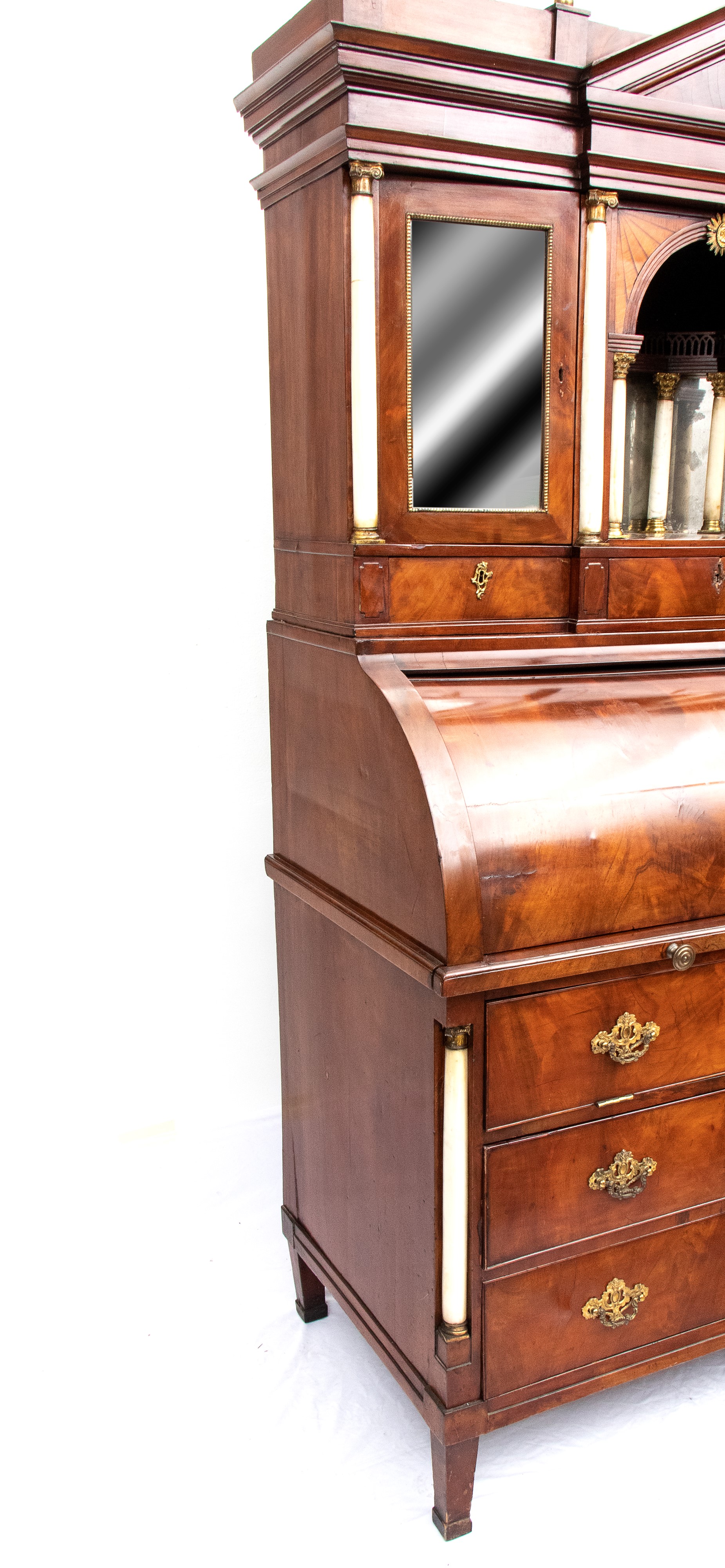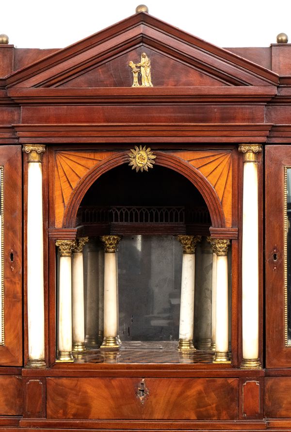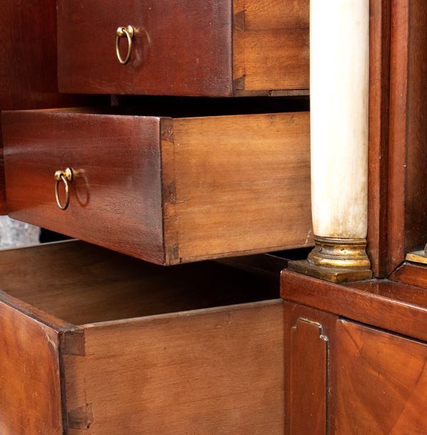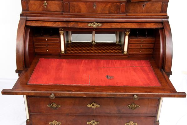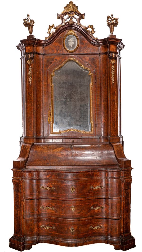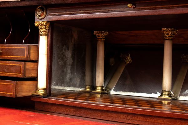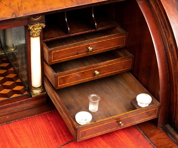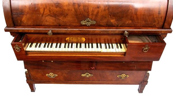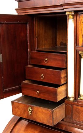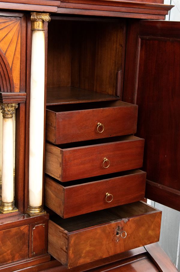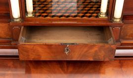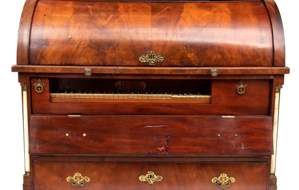 realizzato tra la fine del periodo Luigi XVI e il primo Biedermeier, in piuma di mogano e mogano, applicazioni in bronzo dorato. Parte superiore architettonica a tempietto con frontone triangolare, colonne in alabastro e specchi laterali. Ribalta centinata con interno a cassetti e vani; parte inferiore che cela nel primo cassetto un forte piano, con intarsiato produttore e anno di produzione (1798), seguono due cassetti. Bocchette e maniglie in bronzo dorato.
