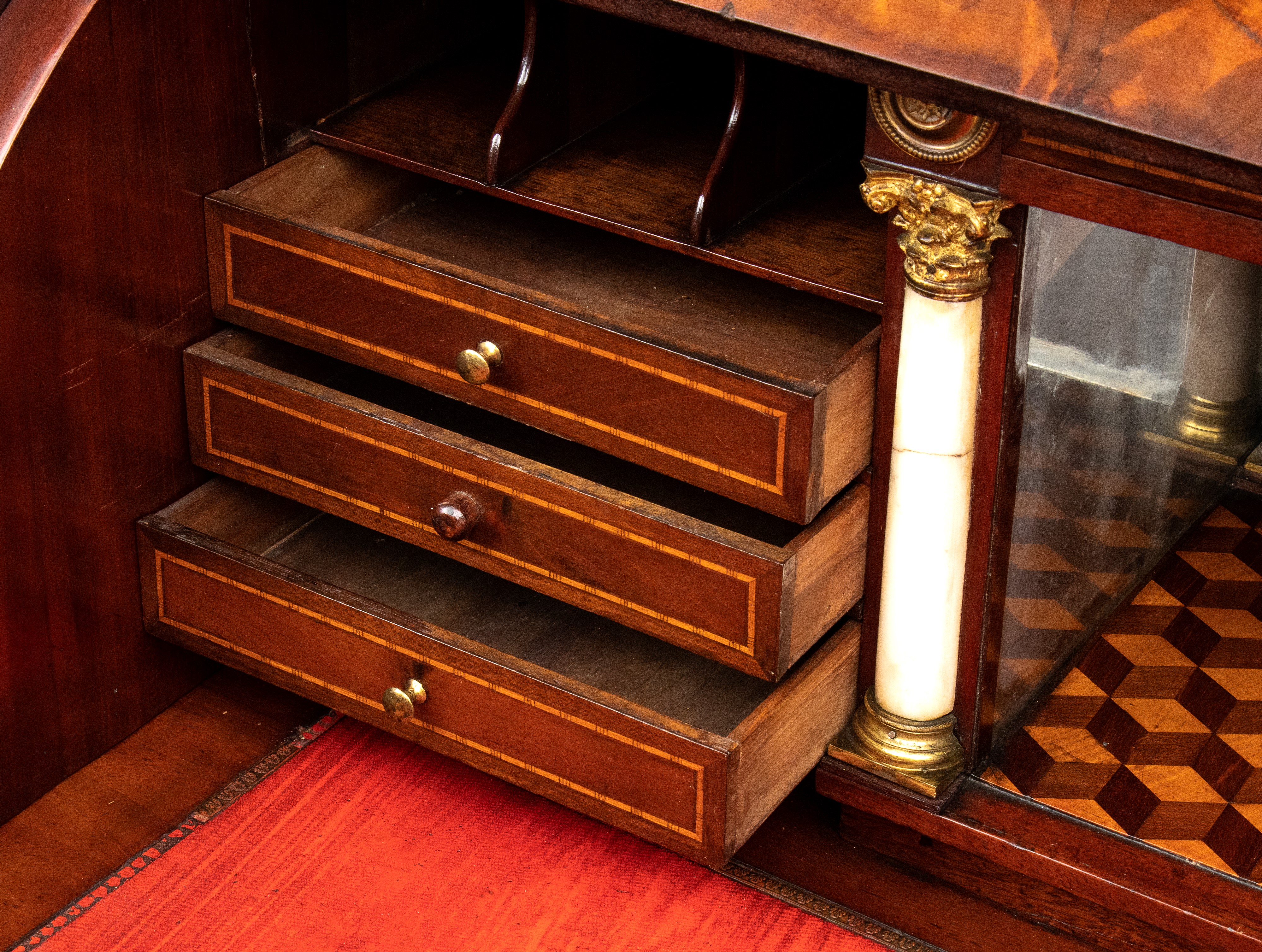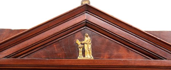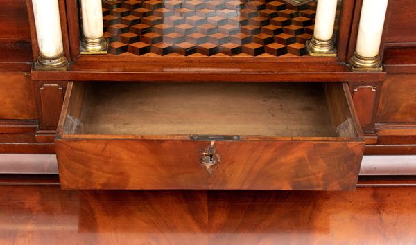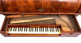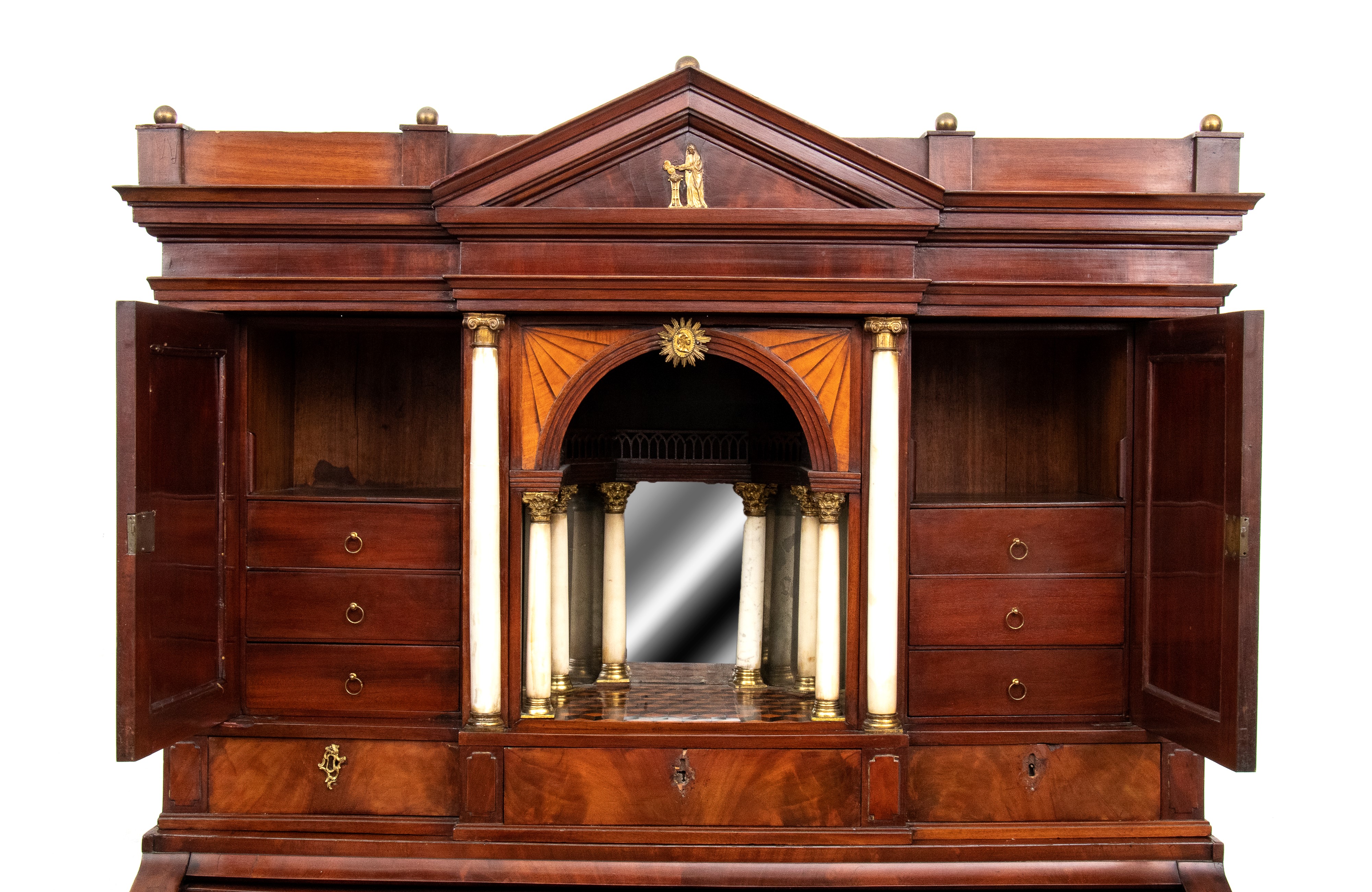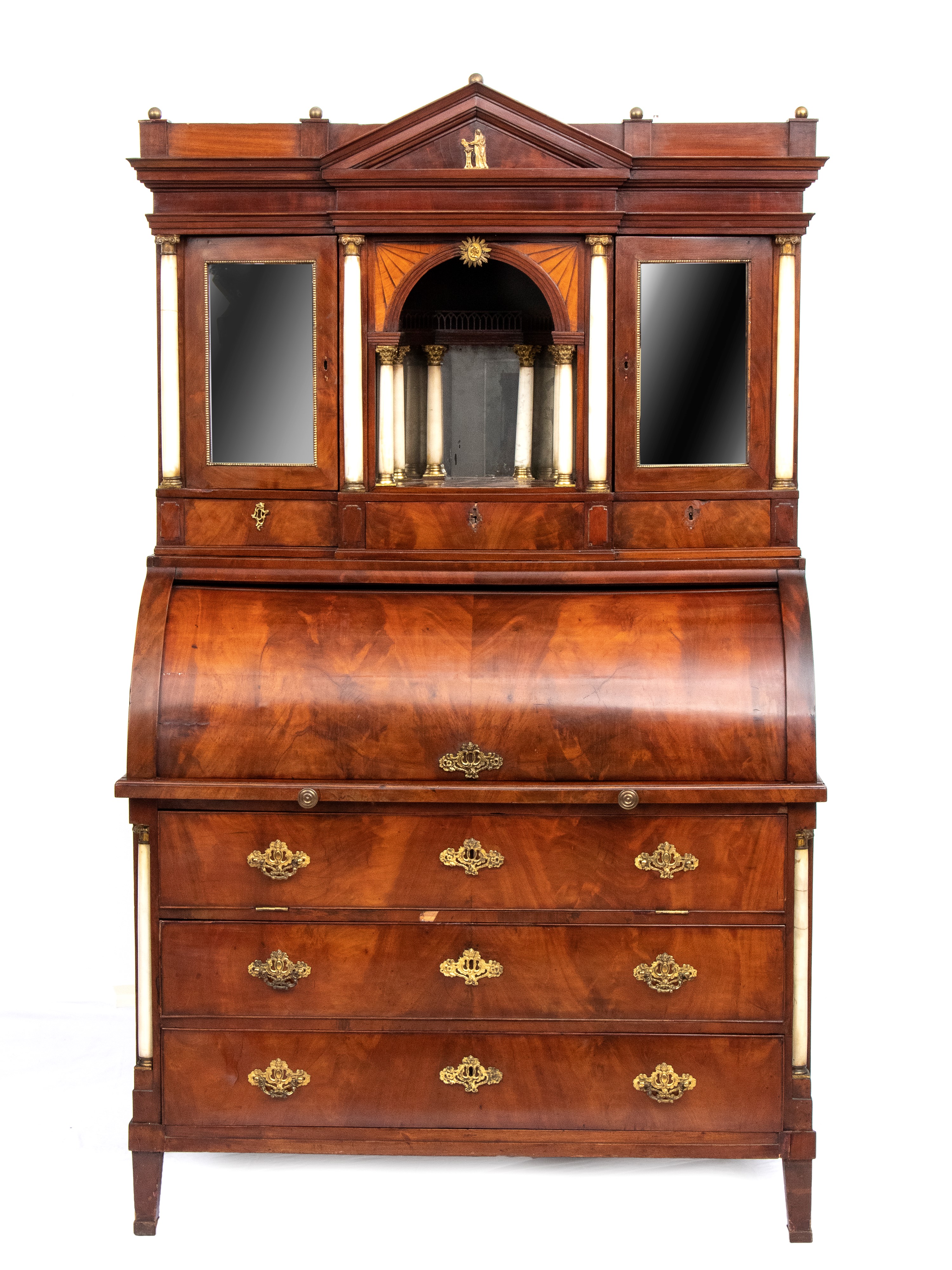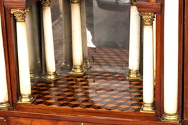 realizzato tra la fine del periodo Luigi XVI e il primo Biedermeier, in piuma di mogano e mogano, applicazioni in bronzo dorato. Parte superiore architettonica a tempietto con frontone triangolare, colonne in alabastro e specchi laterali. Ribalta centinata con interno a cassetti e vani; parte inferiore che cela nel primo cassetto un forte piano, con intarsiato produttore e anno di produzione (1798), seguono due cassetti. Bocchette e maniglie in bronzo dorato.