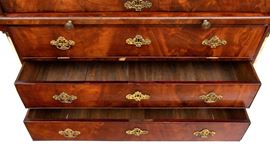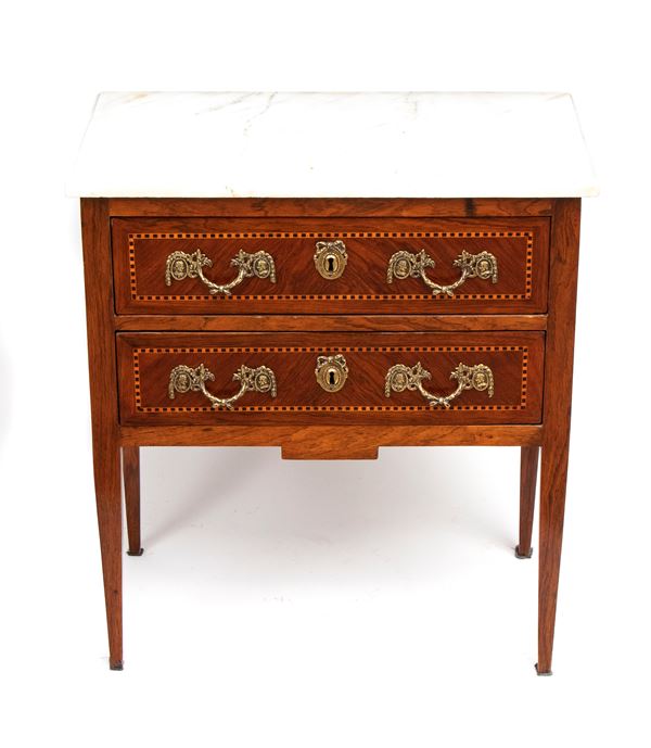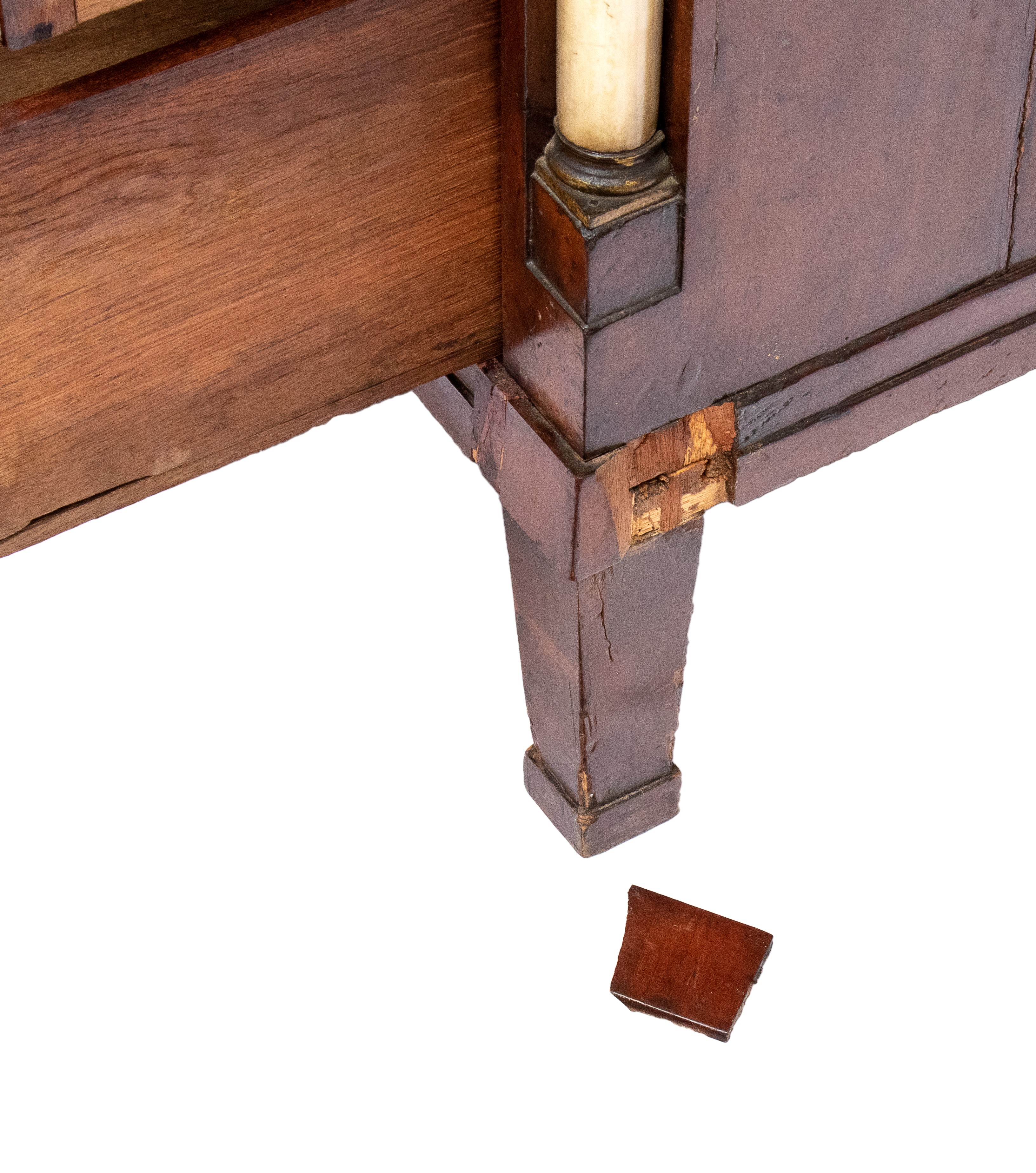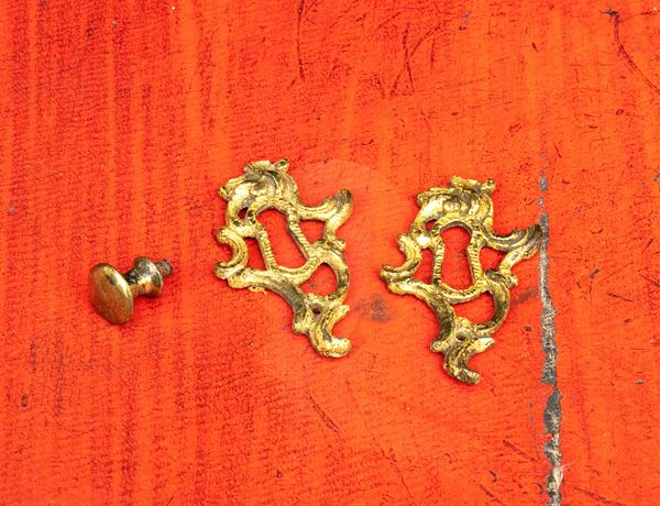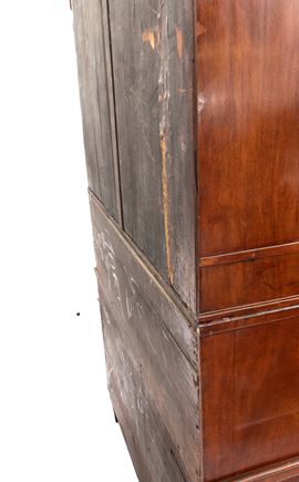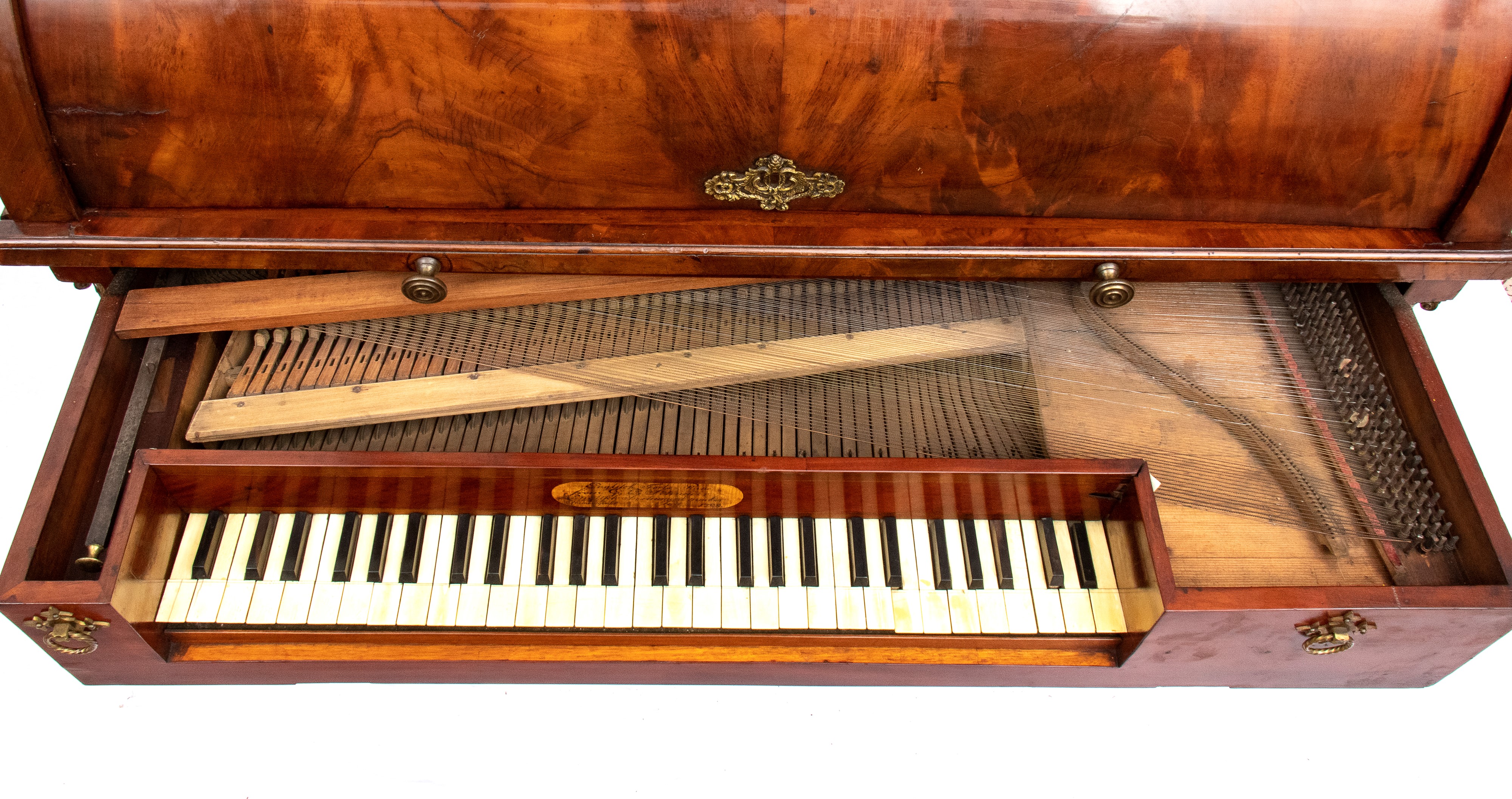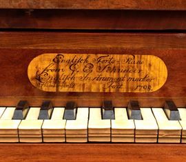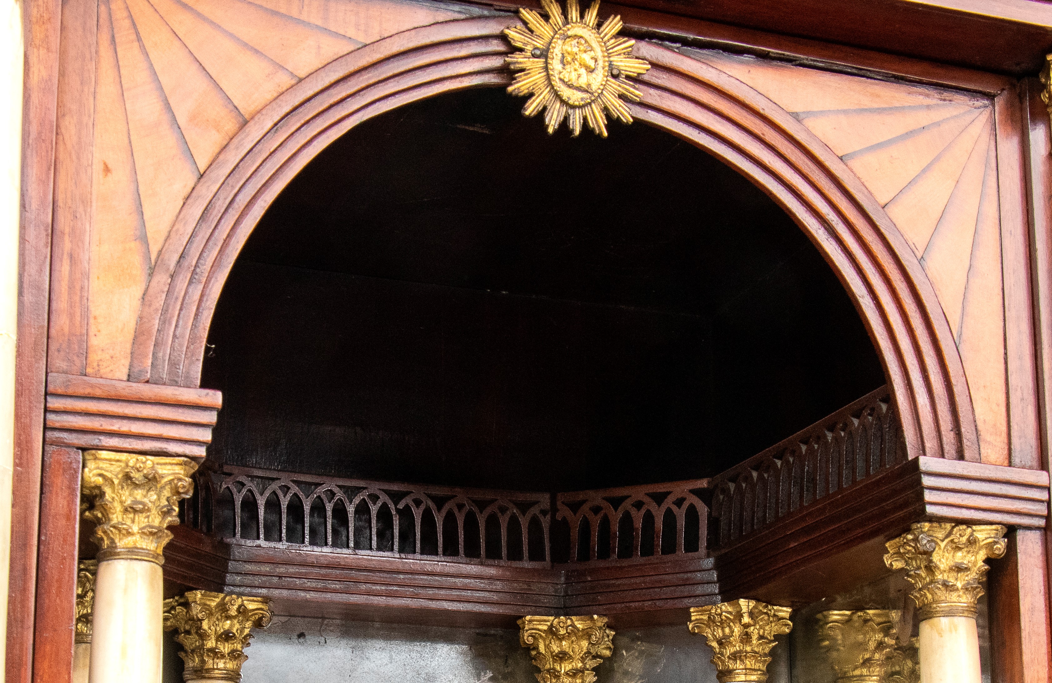 realizzato tra la fine del periodo Luigi XVI e il primo Biedermeier, in piuma di mogano e mogano, applicazioni in bronzo dorato. Parte superiore architettonica a tempietto con frontone triangolare, colonne in alabastro e specchi laterali. Ribalta centinata con interno a cassetti e vani; parte inferiore che cela nel primo cassetto un forte piano, con intarsiato produttore e anno di produzione (1798), seguono due cassetti. Bocchette e maniglie in bronzo dorato.
